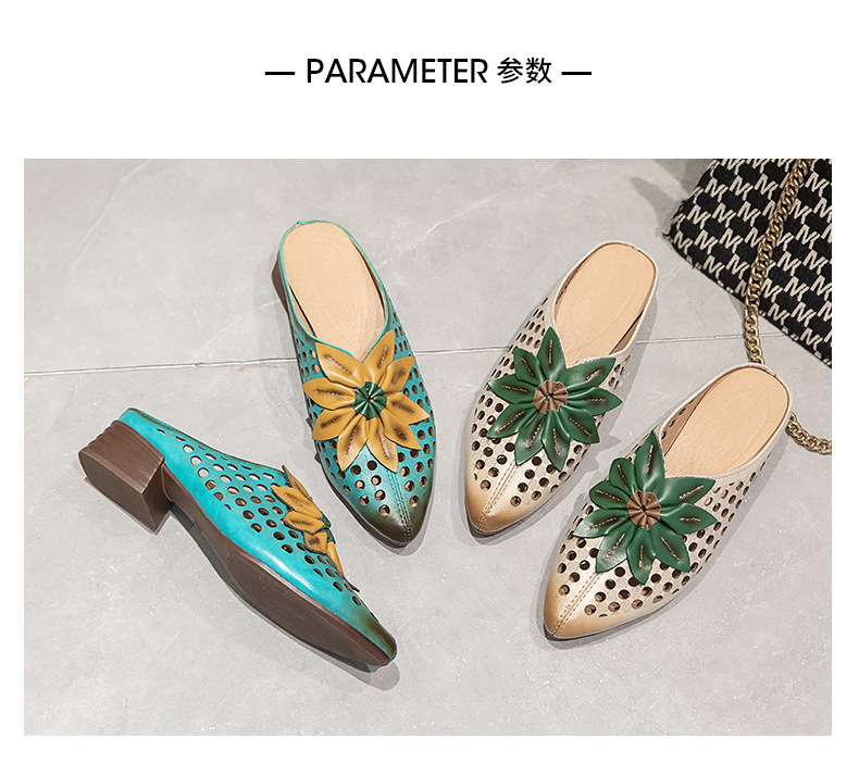 탑 레이어 Cowhide 포인팅 미드 힐 슬리퍼 여성용 미끄럼 방지 올 매치 민족 스타일 정품 가죽 두꺼운 힐 샌들 (Baotou 포함)