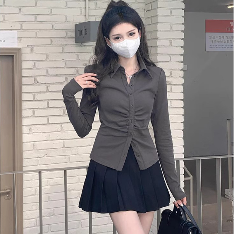국경 간 공장 유럽과 미국은 단색 허리 셔츠 여성용 섹시한 긴팔 셔츠 톱 한국어 버전의 떨림 타오바오