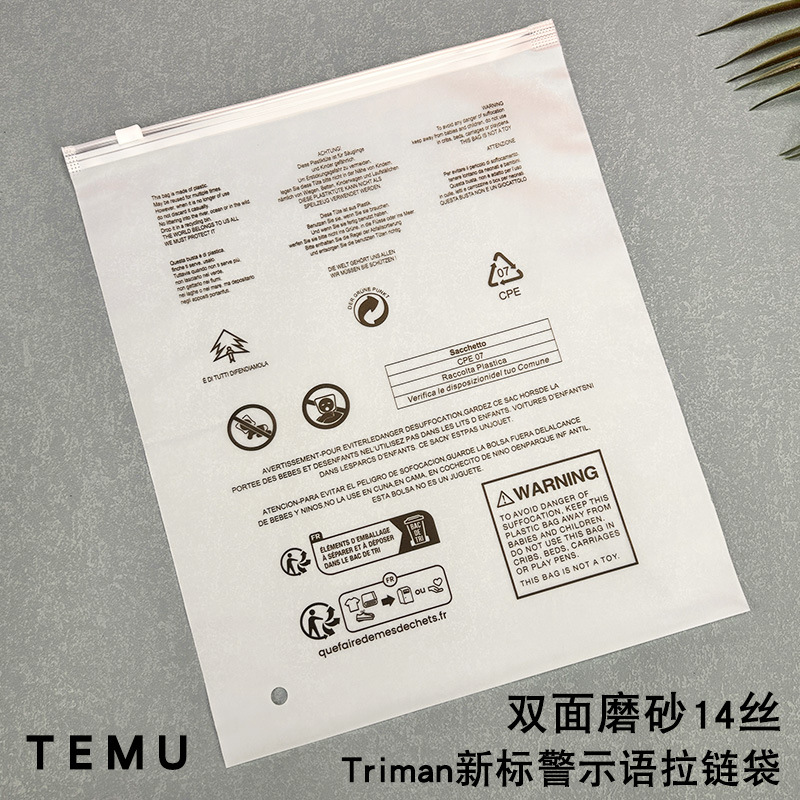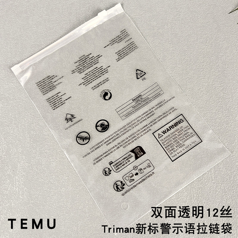 此链接能下单的都是有现货的,现货厚度是pe双面12丝透明拉链袋和cpe双面14丝磨砂拉链袋,两个厚度分别印刷通用警示语和temu新徽标警示语。袋子每扎是48-52个,机器点数有±1-2个的误差,请理解!