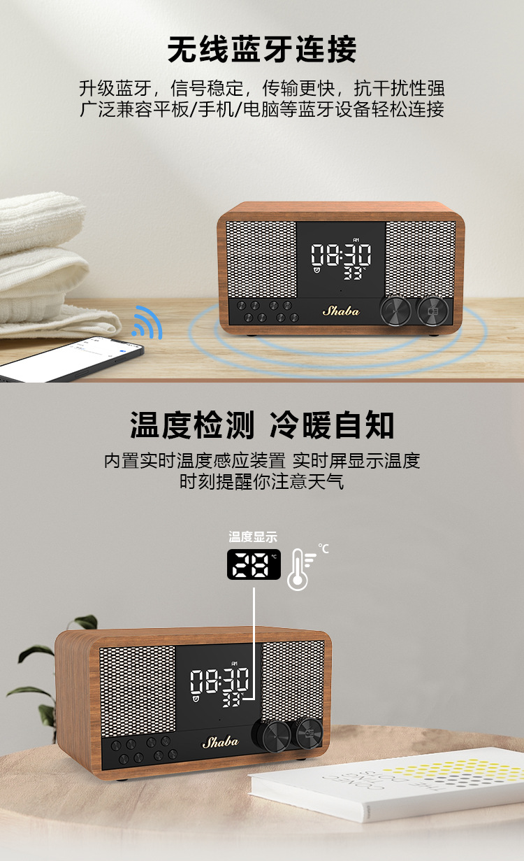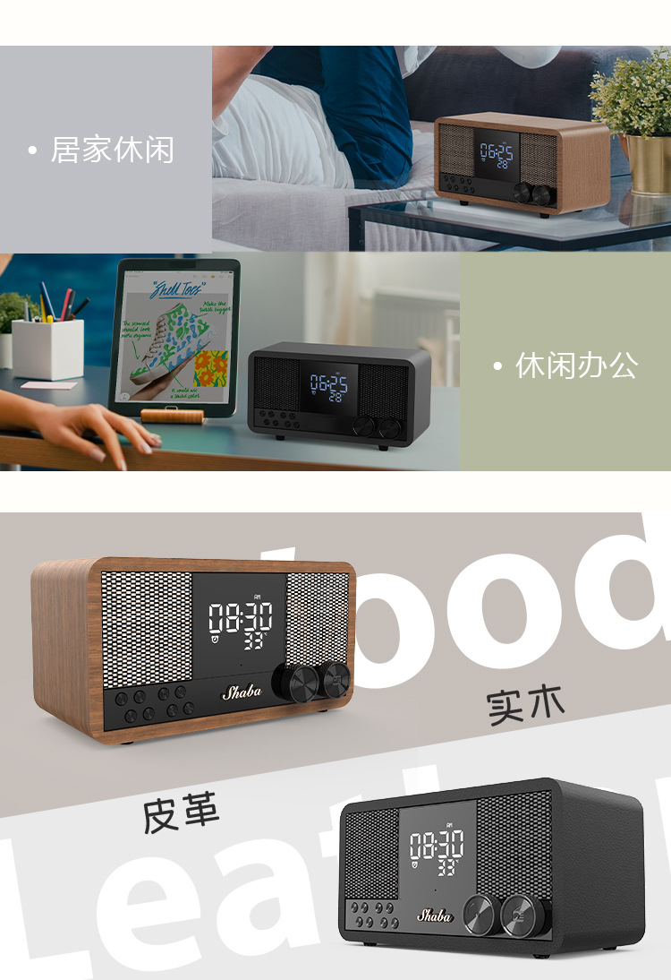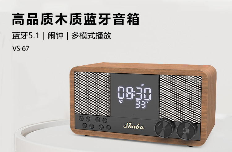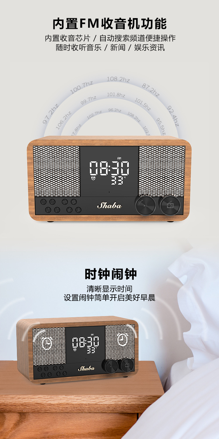 국경 간 복고풍 블루투스 스피커 목조 홈 FM 라디오 시계 알람 시계 오디오 블루투스 서브 우퍼스토어 가기