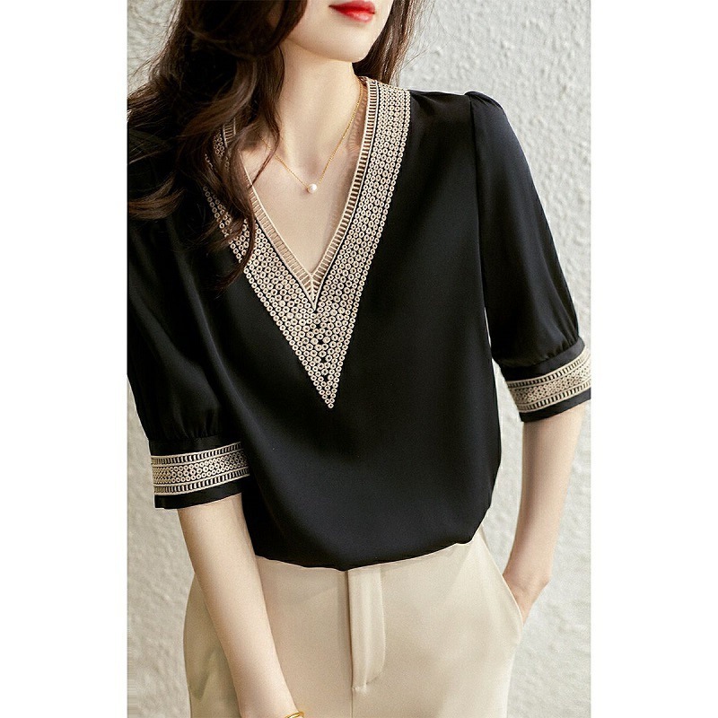 패치 워크 할로우 탑 2023 여름 블랙 쉬폰 셔츠 V-Neck 짧은 소매 자수 셔츠 여성용 티셔츠스토어 가기