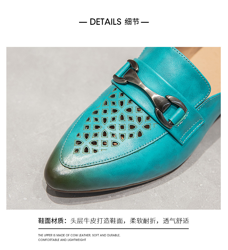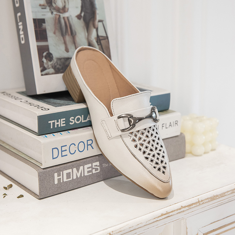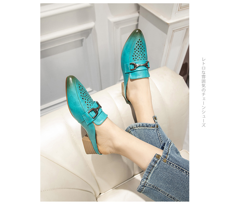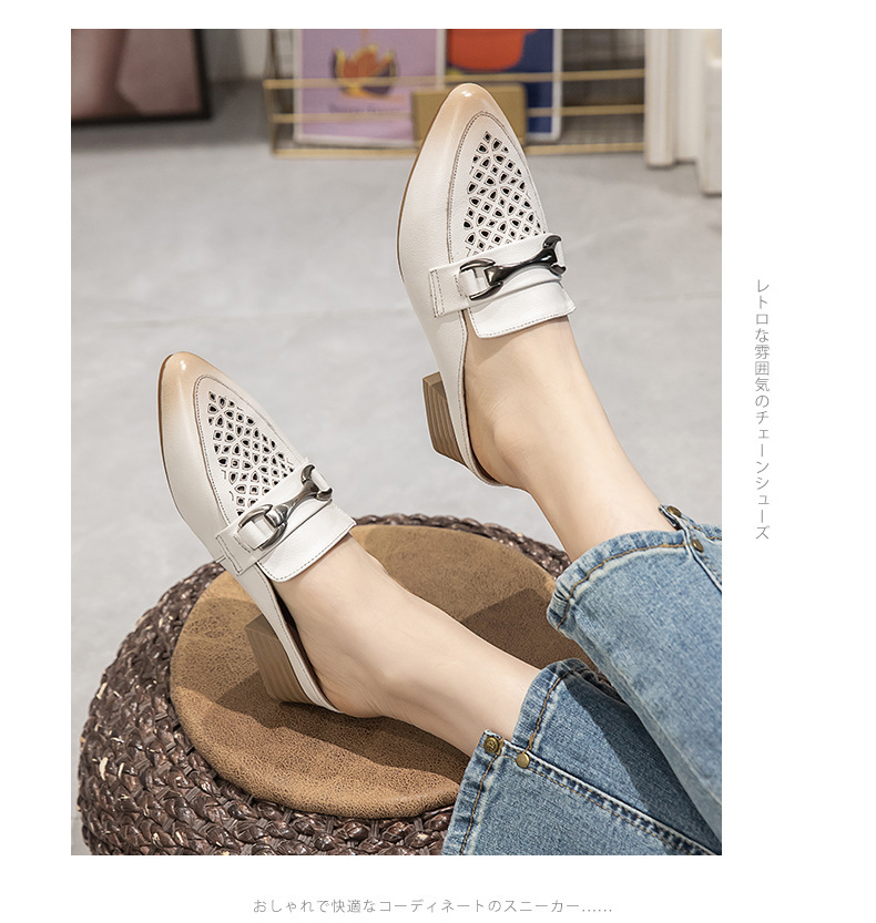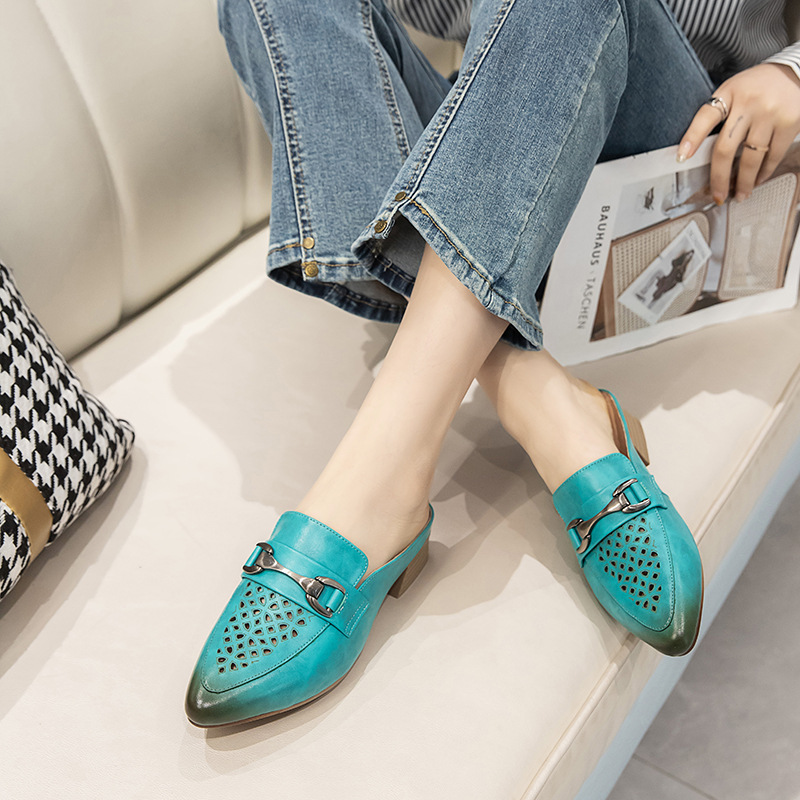 탑 레이어 Cowhide 포인팅 미드 힐 슬리퍼 여성용 미끄럼 방지 올 매치 민족 스타일 정품 가죽 두꺼운 힐 샌들 (Baotou 포함)스토어 가기