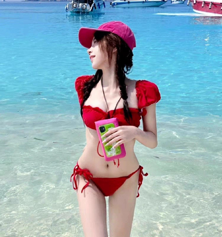인터넷 축하 같은 스타일 레드 버블 슬리브 비키니 여성용 드로우 스트랩 튜브 탑 스플릿 수영복 해변 휴가 수영복 수영복스토어 가기