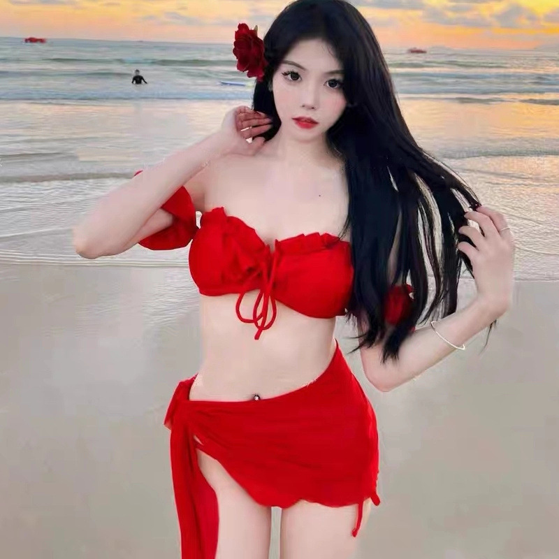 인터넷 축하 같은 스타일 레드 버블 슬리브 비키니 여성용 드로우 스트랩 튜브 탑 스플릿 수영복 해변 휴가 수영복 수영복
