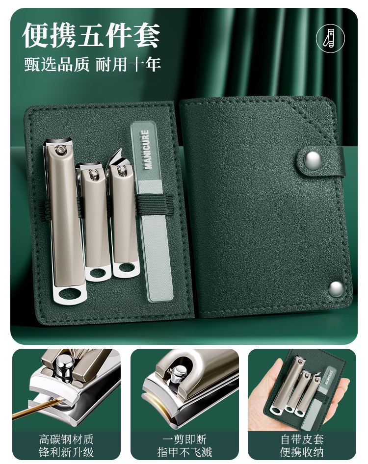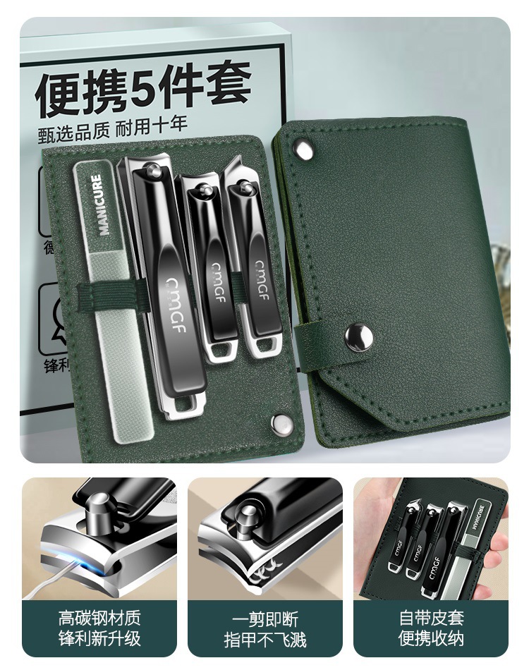 • 다크 그린 회전 가죽 케이스, 블랙 메탈 손톱깎이 5종 세트