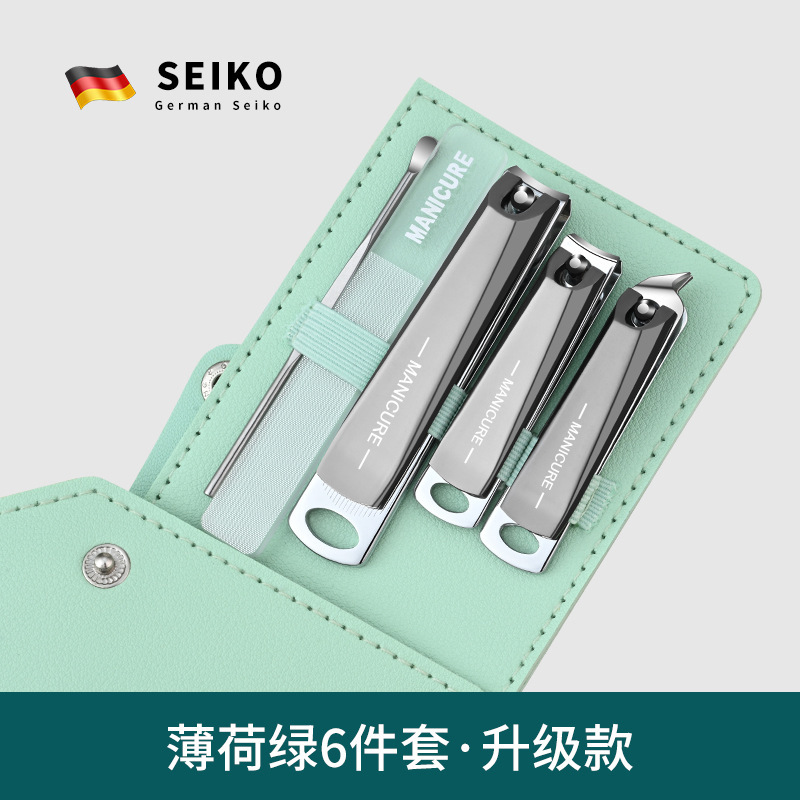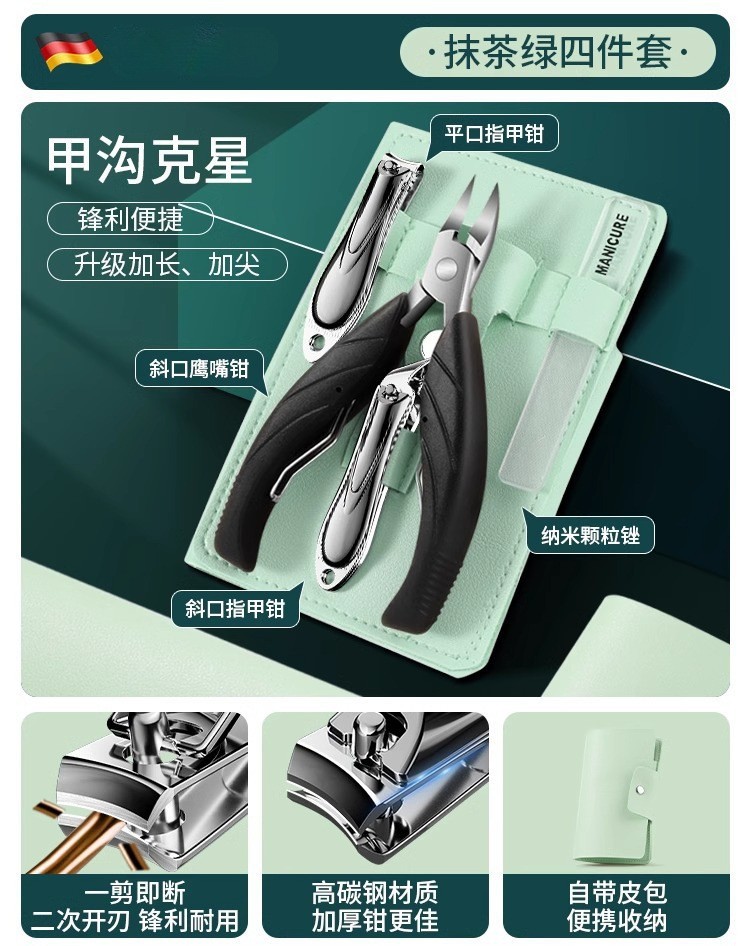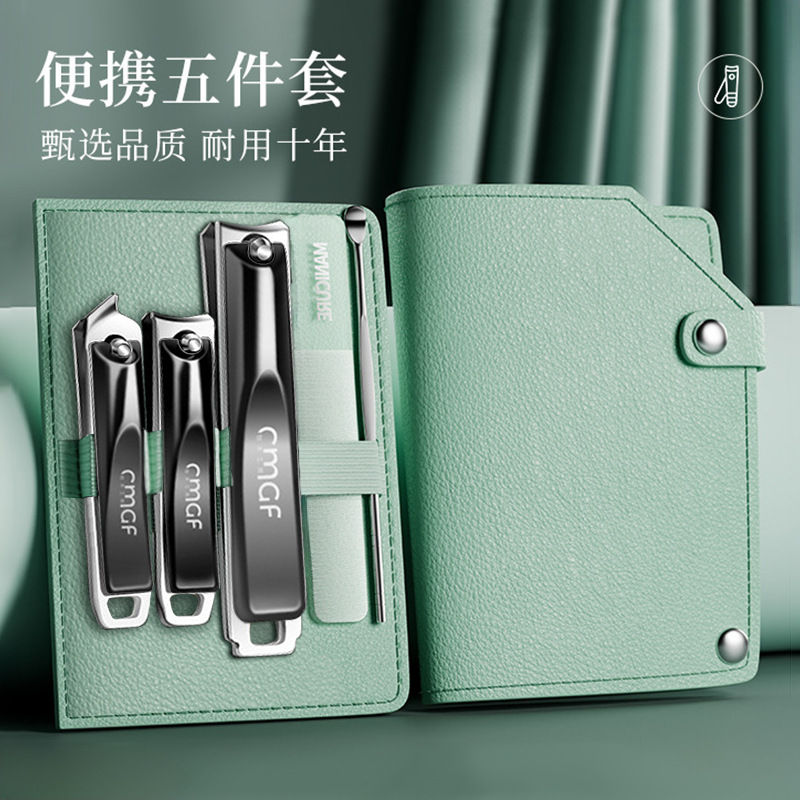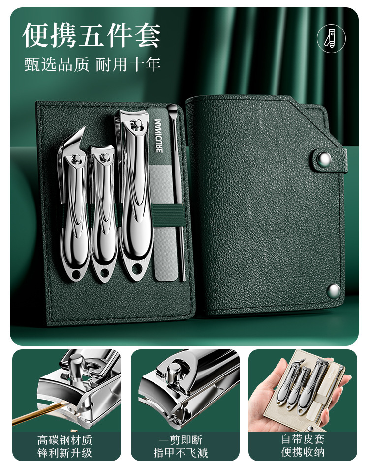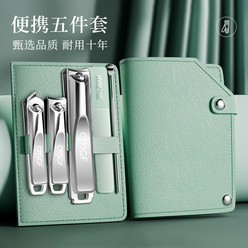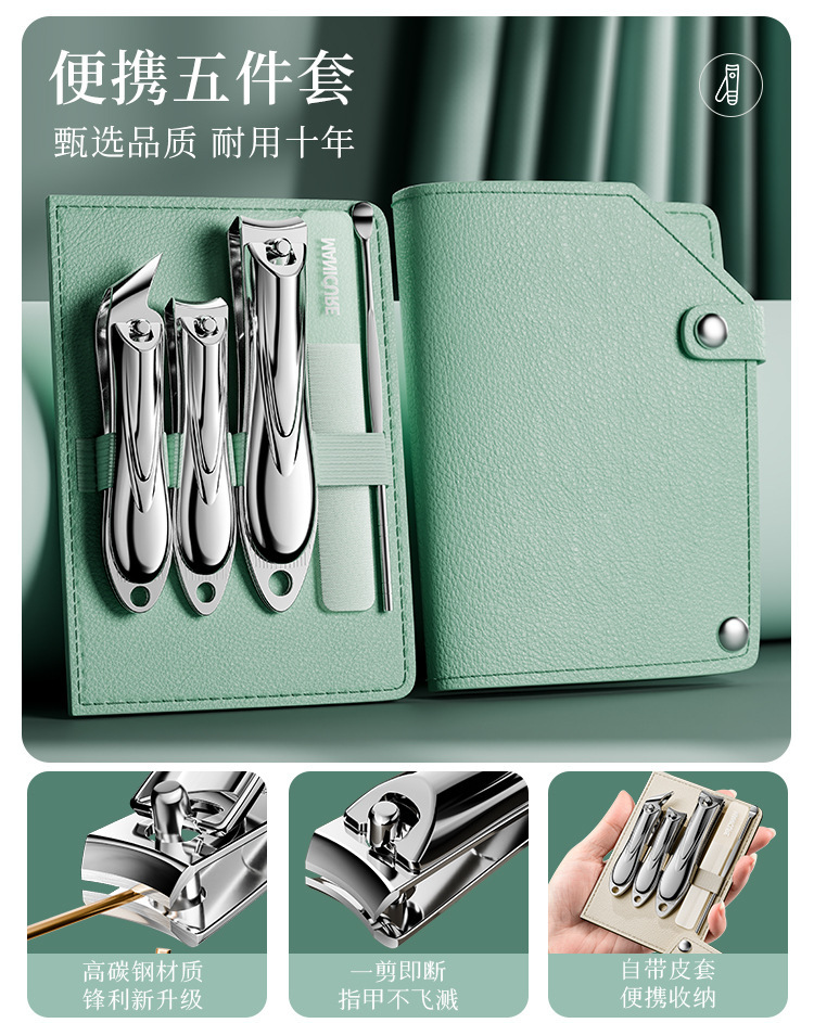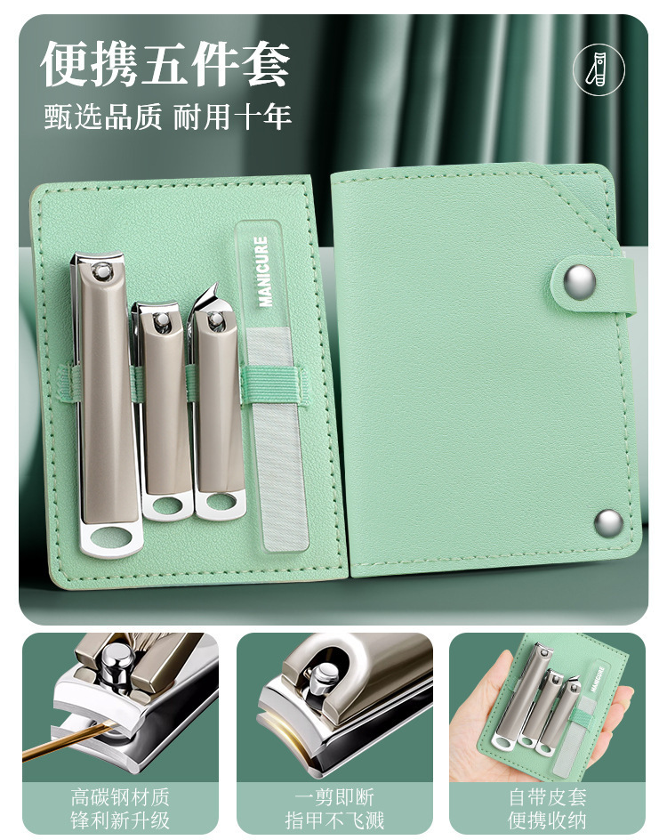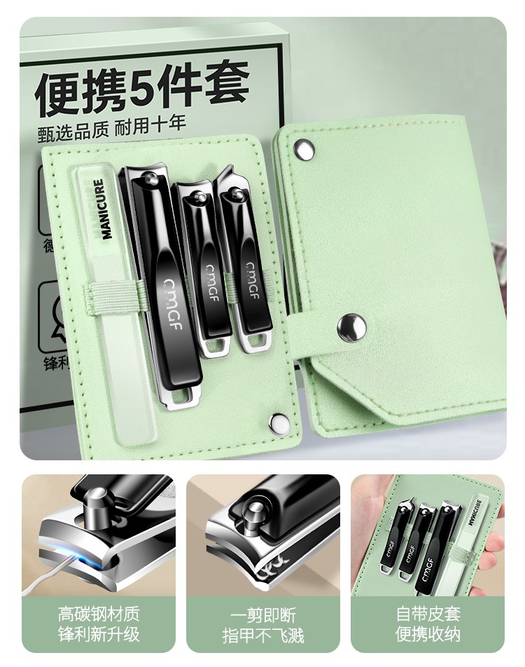 • 라이트 그린 회전 가죽 케이스, 블랙 메탈 손톱깎이 5종 세트