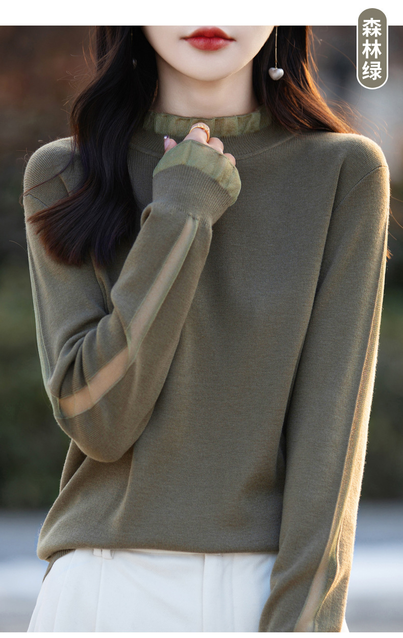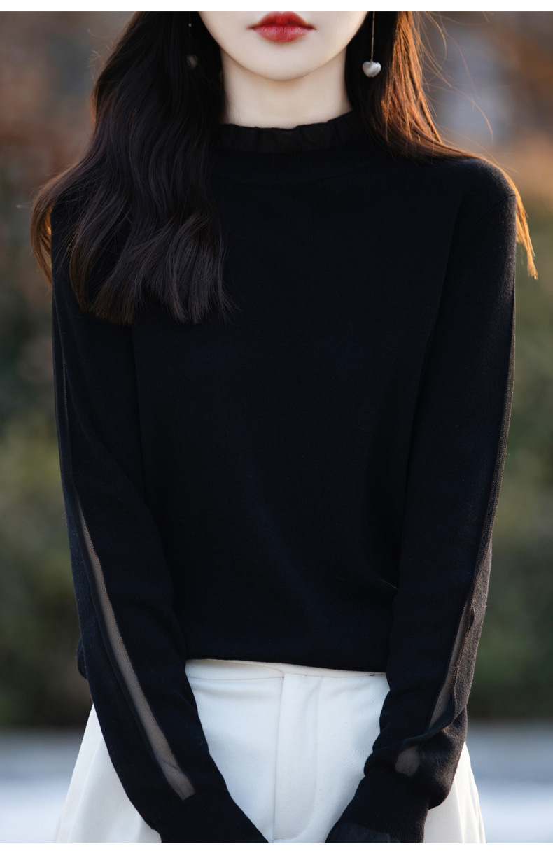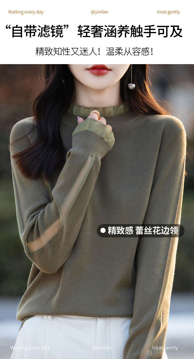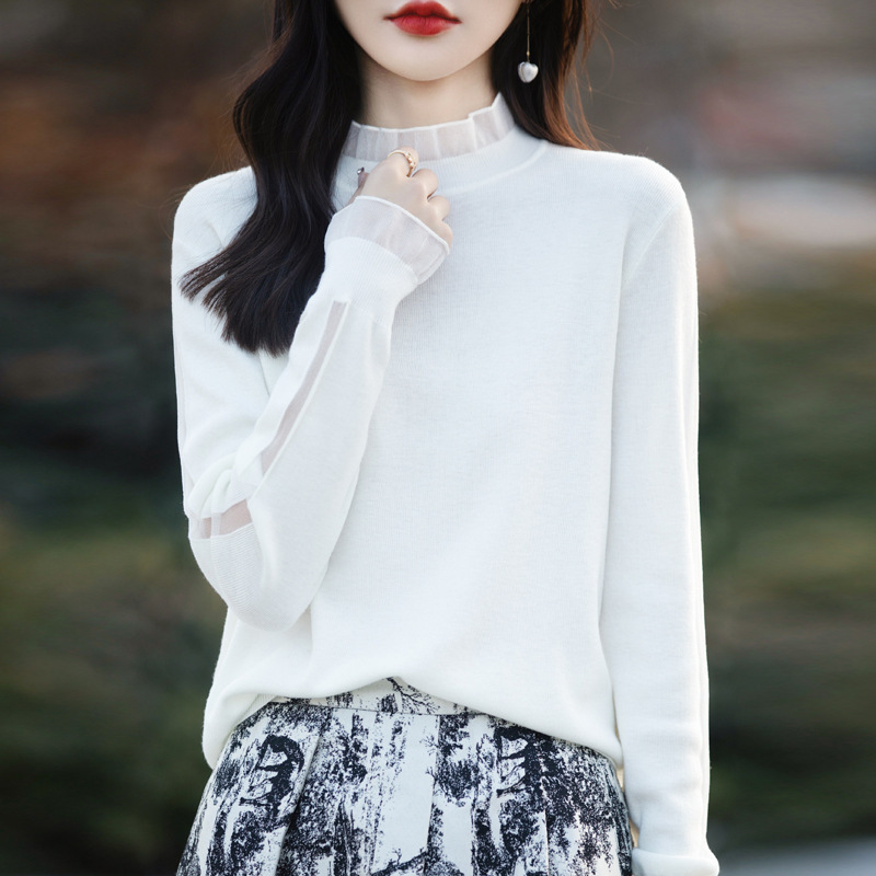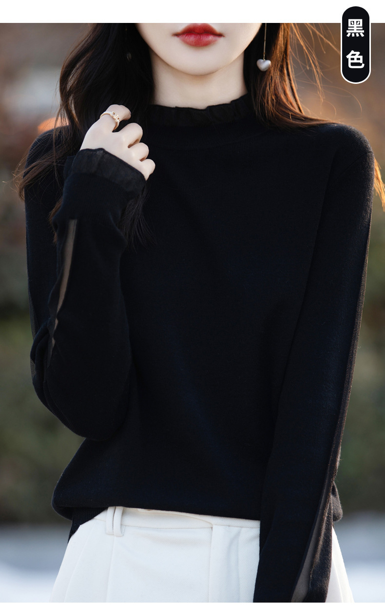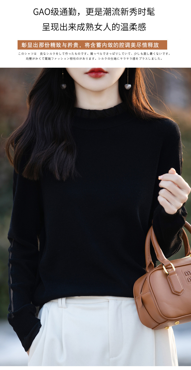 2025년 봄/가을 신상 고급 울 니트 여성용 레이스 스티치 러플 단색 베이스 셔츠 얇은 스타일스토어 가기