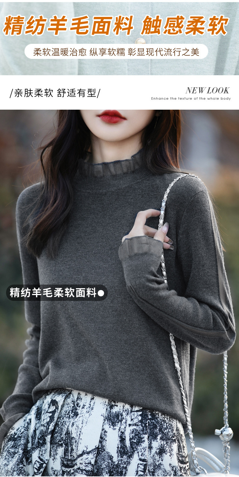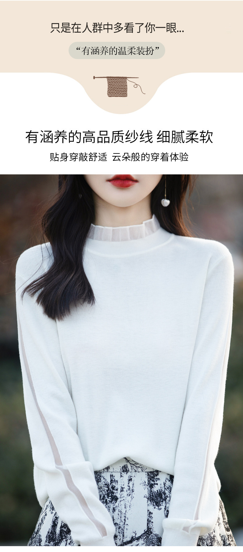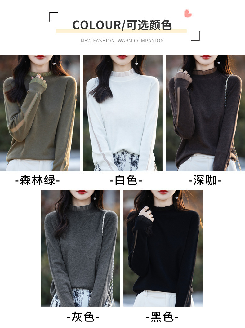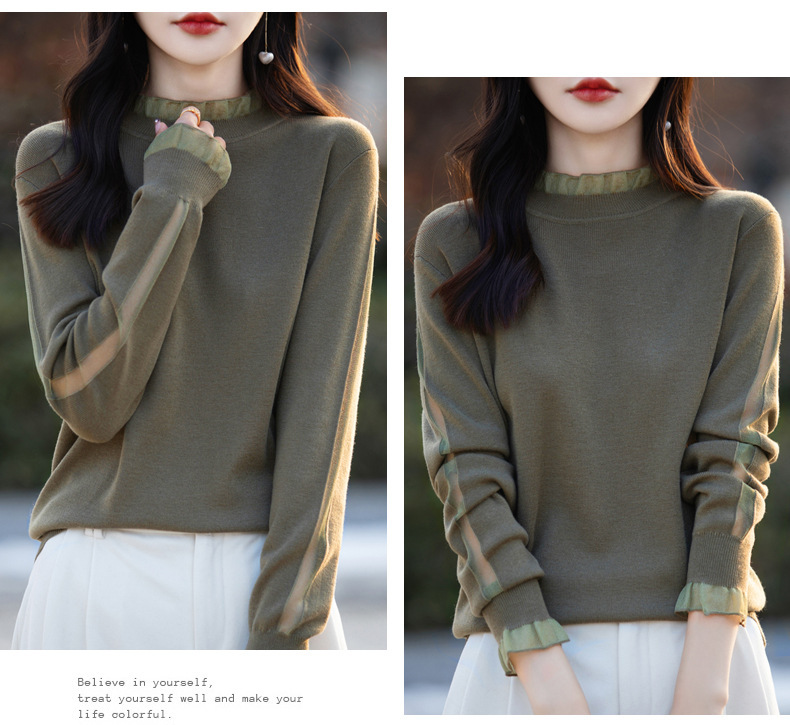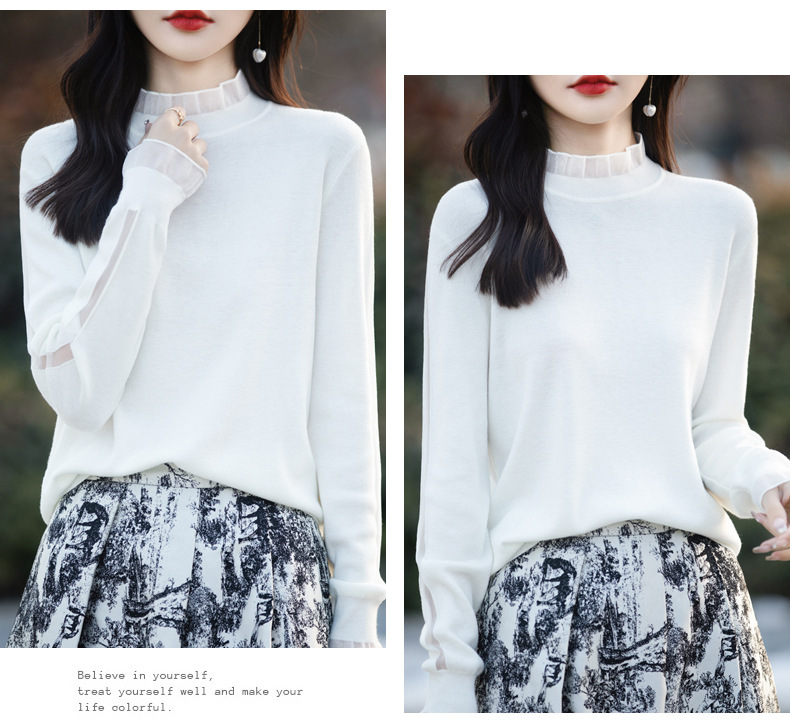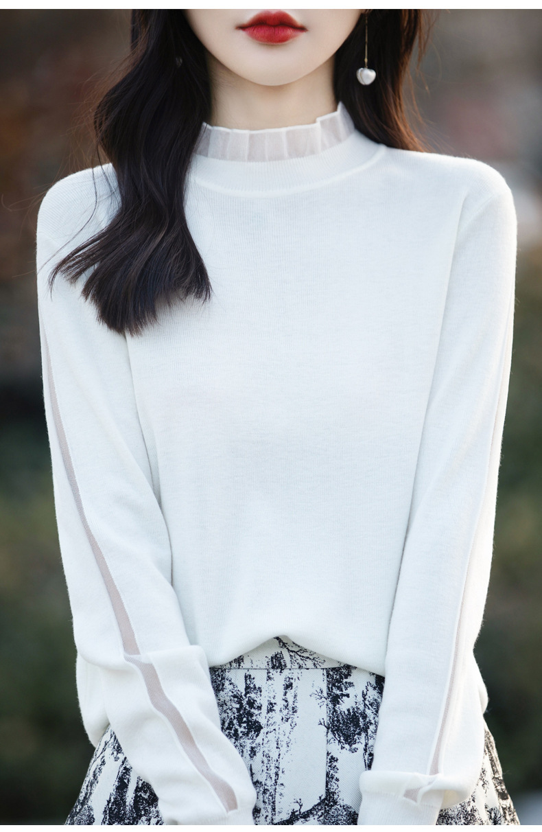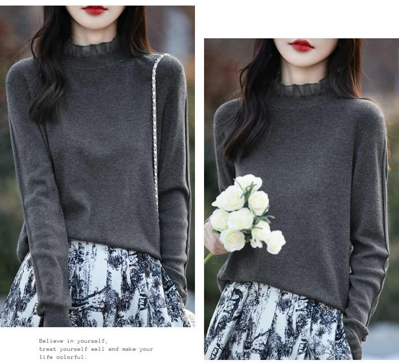 2025년 봄/가을 신상 고급 울 니트 여성용 레이스 스티치 러플 단색 베이스 셔츠 얇은 스타일스토어 가기