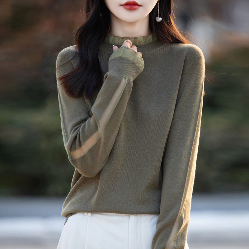 2025년 봄/가을 신상 고급 울 니트 여성용 레이스 스티치 러플 단색 베이스 셔츠 얇은 스타일