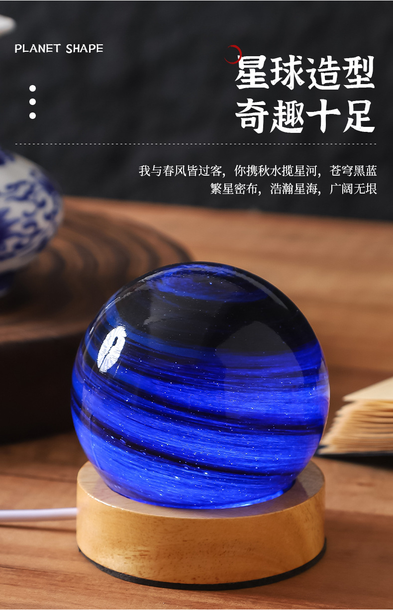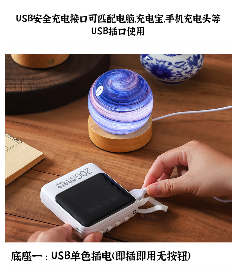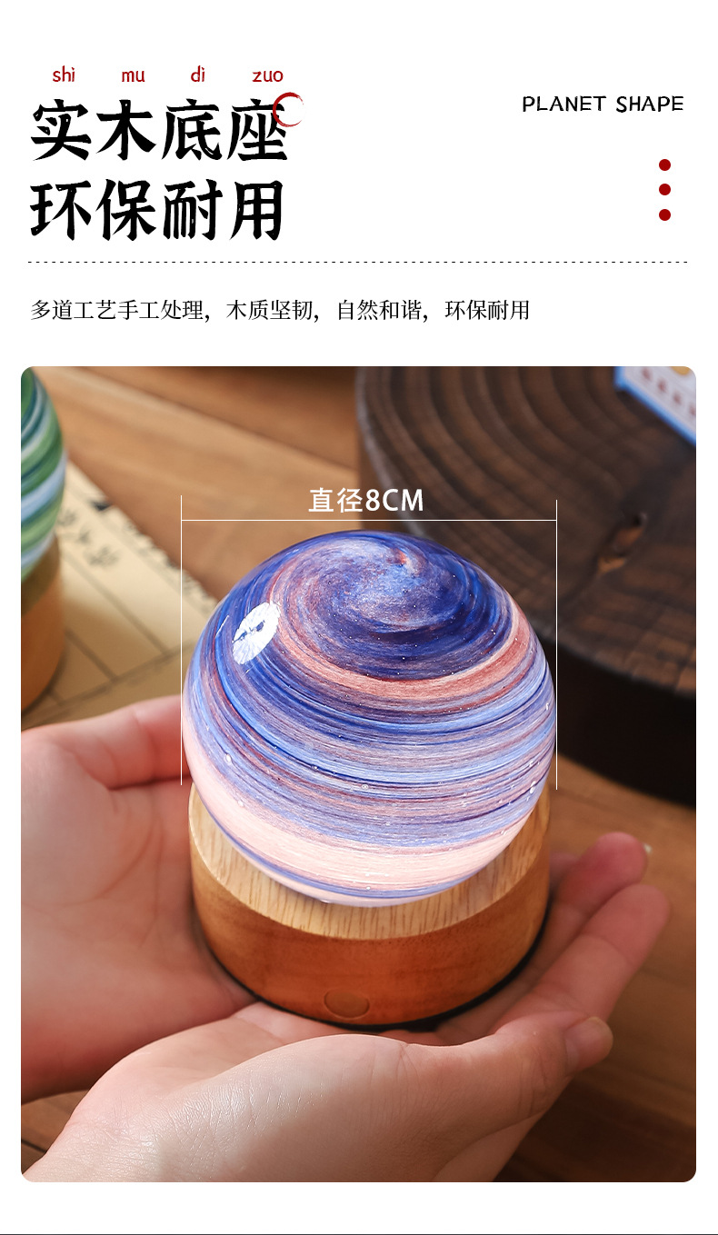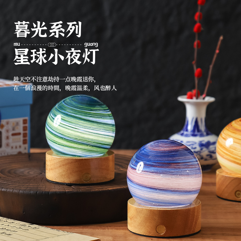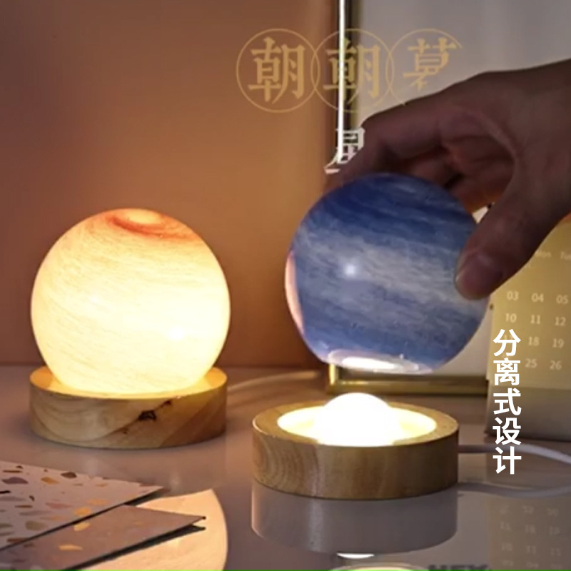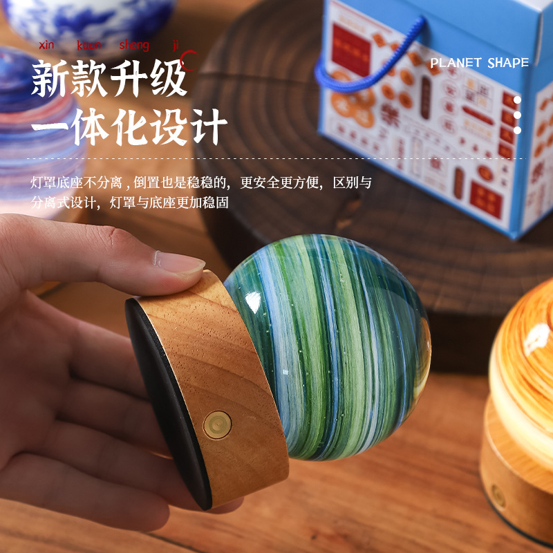 크로스보더 플래닛 램프 쉐이드 일체형 별빛 램프 원목 받침대 타입-C 충전 야간등 오로라 유리 조명 선물