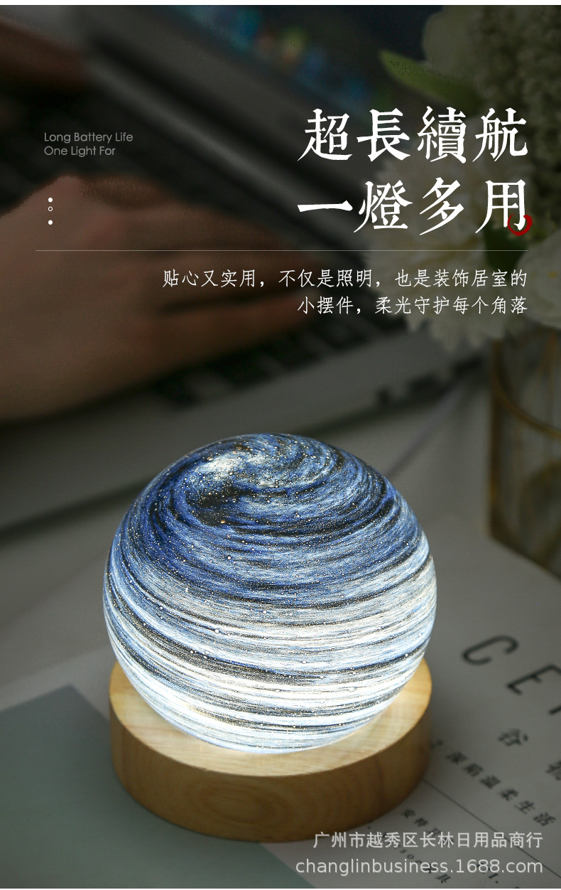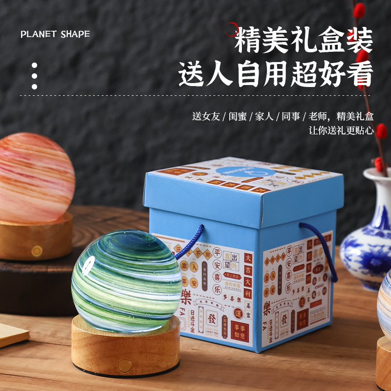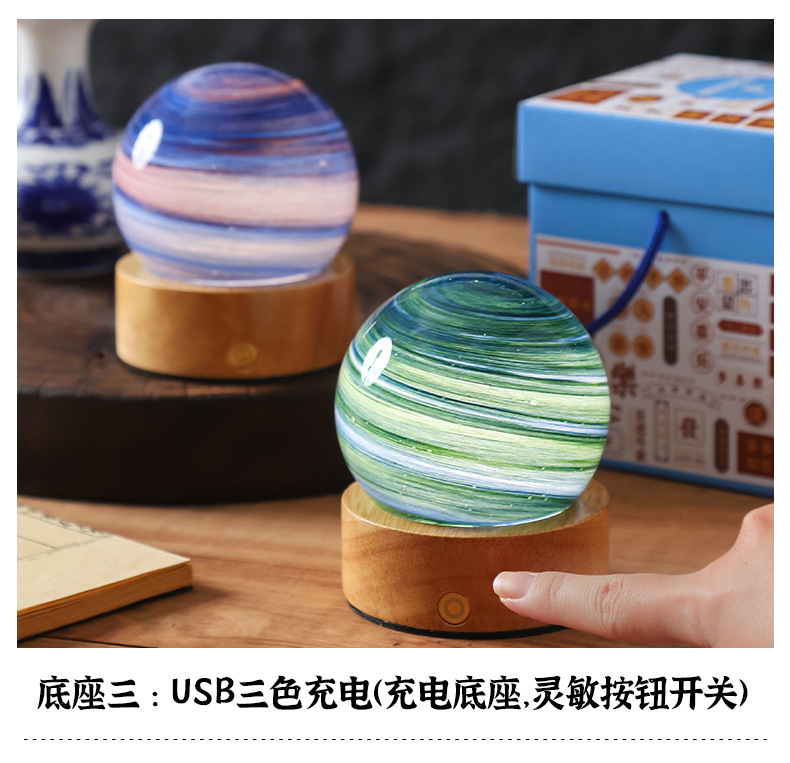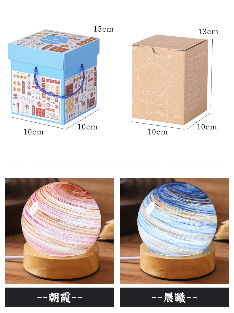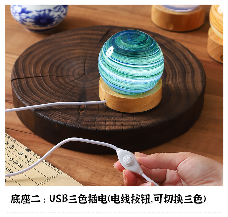 크로스보더 플래닛 램프 쉐이드 일체형 별빛 램프 원목 받침대 타입-C 충전 야간등 오로라 유리 조명 선물
