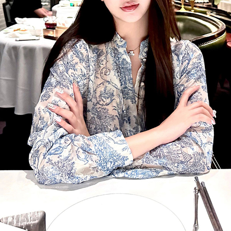 레트로 신중국풍 수묵화 프린트 브이넥 쉬폰 탑 여성용 여름 2026 신상 독특하고 세련된 얇은 자외선 차단 셔츠