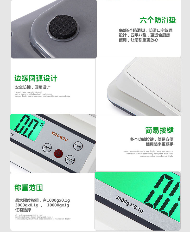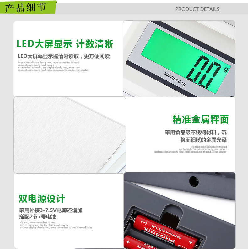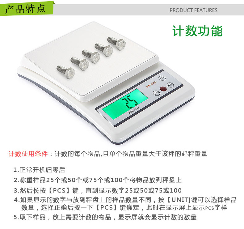 1. 特点:可当电子台秤,计数功能,可外接电源和7号电池,不锈钢面板,高档绿色背光显示