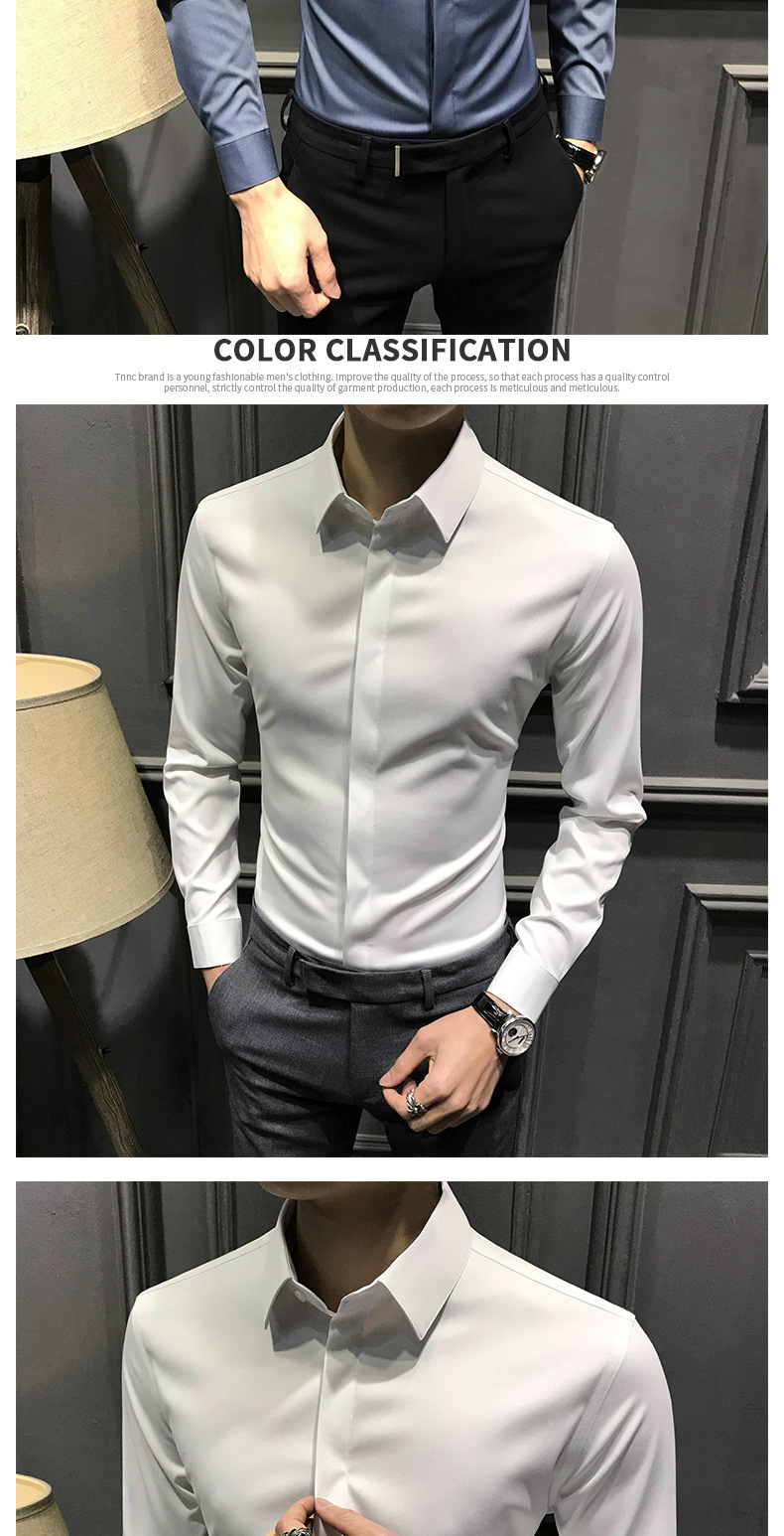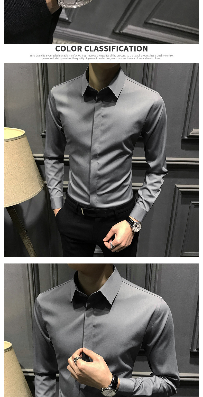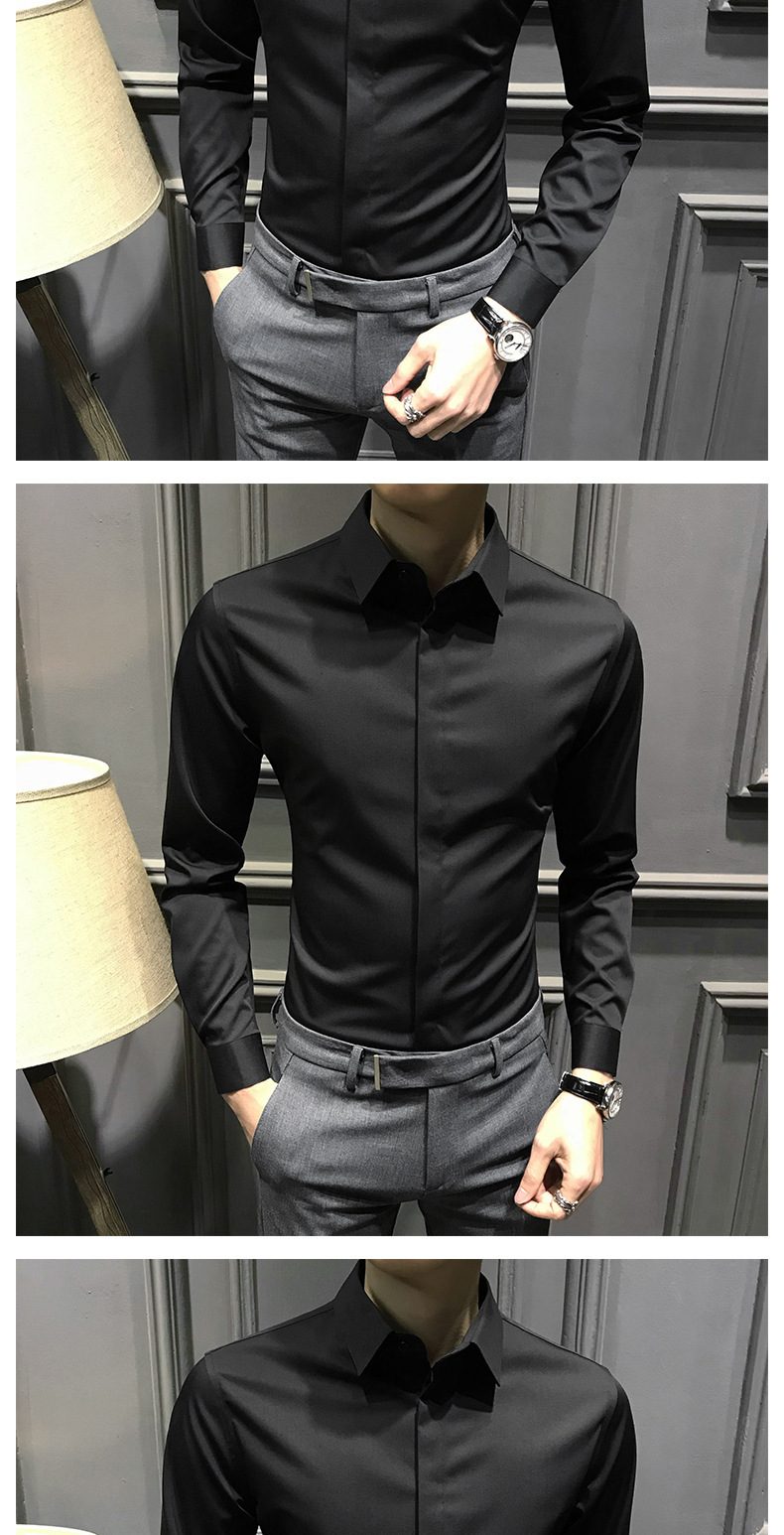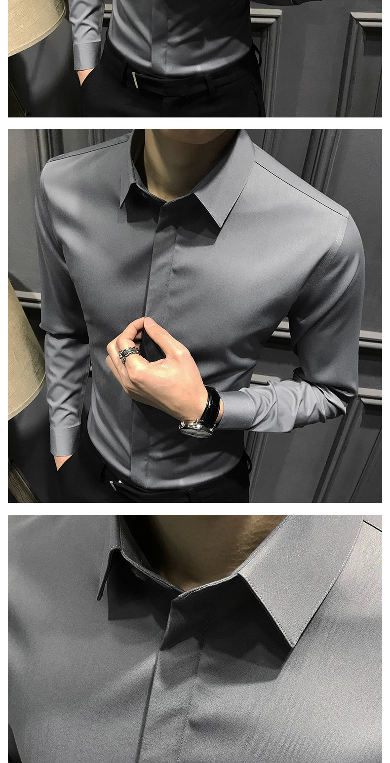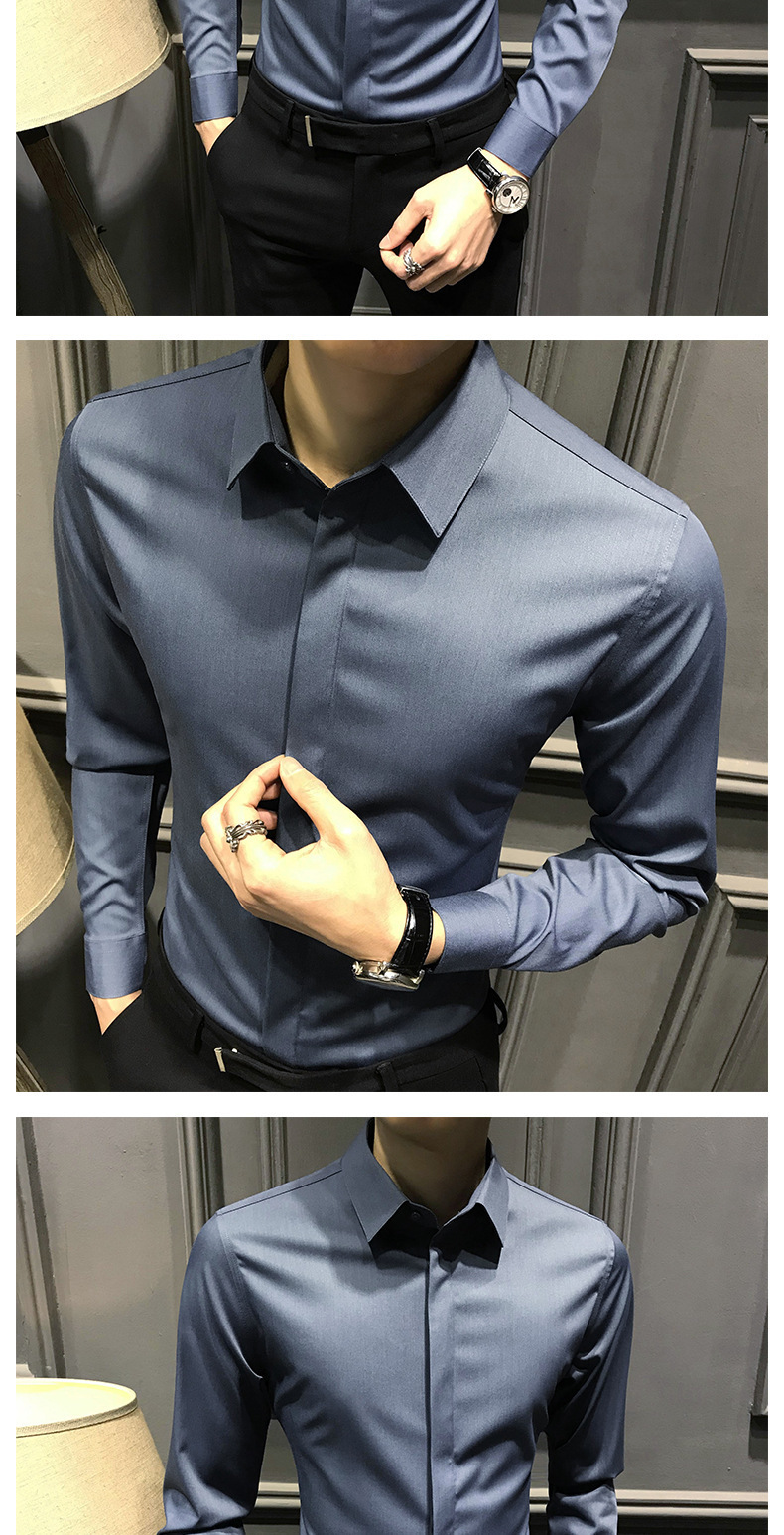 봄철 작업복 신상 남성 셔츠 긴팔 한국 스타일 비즈니스 히든 버튼 트렌디 캐주얼 슬림핏 정장 다림질 필요 없는 셔츠