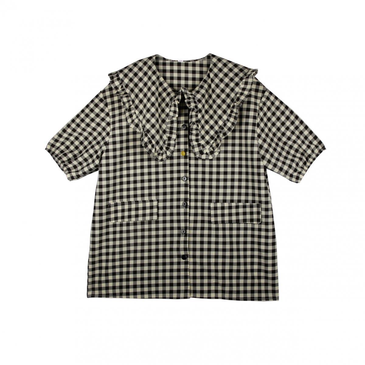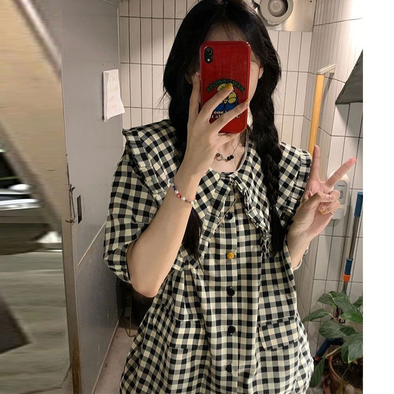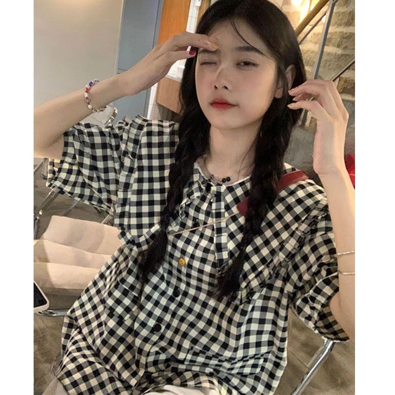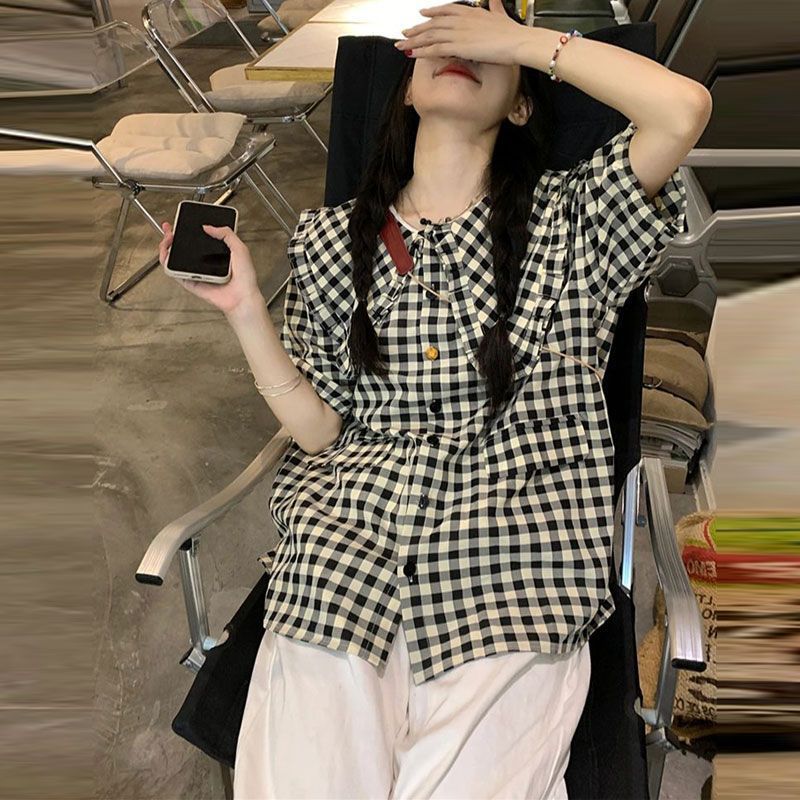 일본 스타일 레트로 게으른 스타일 반팔 셔츠 여성 여름 느슨한 캐주얼 체크 탑 인스 타 그램 스타일 트렌디 한 인형 칼라 셔츠