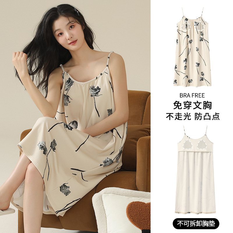 슬링 나이트 가운 여성용 원피스 스트랩리스 여름 퓨어 코튼 달콤한 원피스 섹시한 홈 의류 가슴 패드와 잠옷스토어 가기