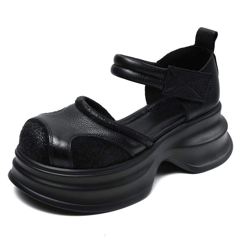 여름 Cowhide 두꺼운 밑창 Baotou 여성용 할로우 샌들 디자인 센스 정품 가죽 한 단어 로마 얕은 할로우 여성 신발스토어 가기