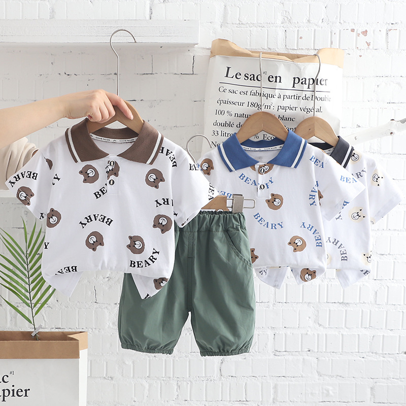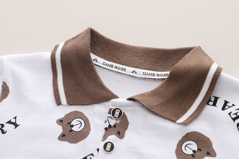 어린이와 소년 여름 2024 서양식 아기 여름 폴로 셔츠 전체 인쇄 곰 머리 액세스 제어 셔츠 짧은 소매 2 피스 세트 배치스토어 가기