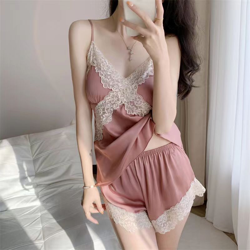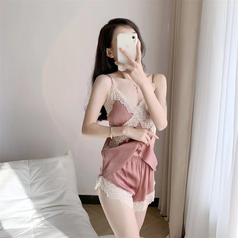 • 새틴 실크 잠옷-핑크 레이스