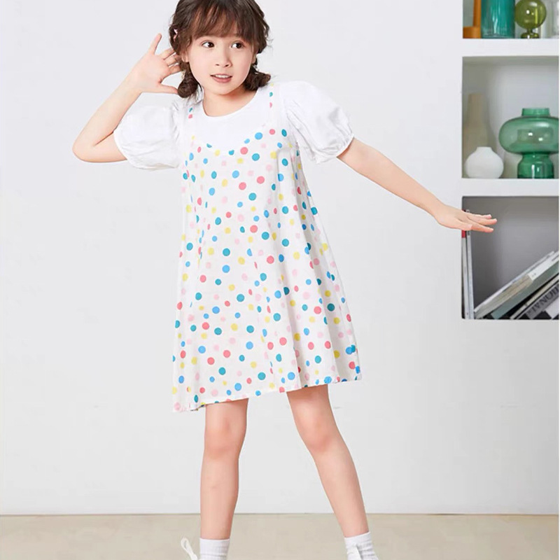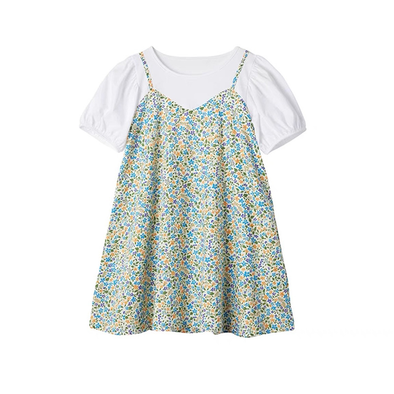 수천 명의 새로운 여름 소녀들이 면화 반팔 원피스 소녀 꽃 가짜 투피스 어린이 스트랩 원피스 짠다