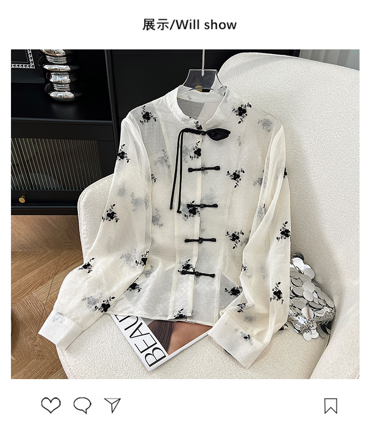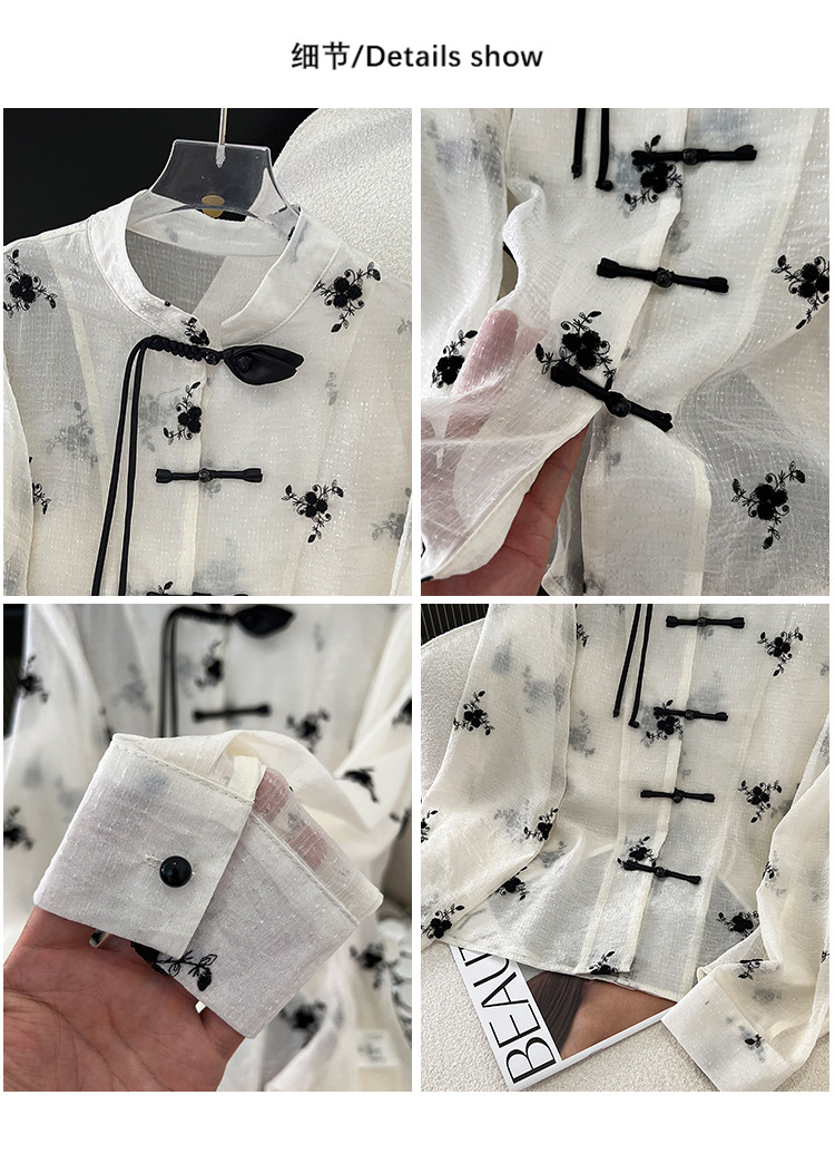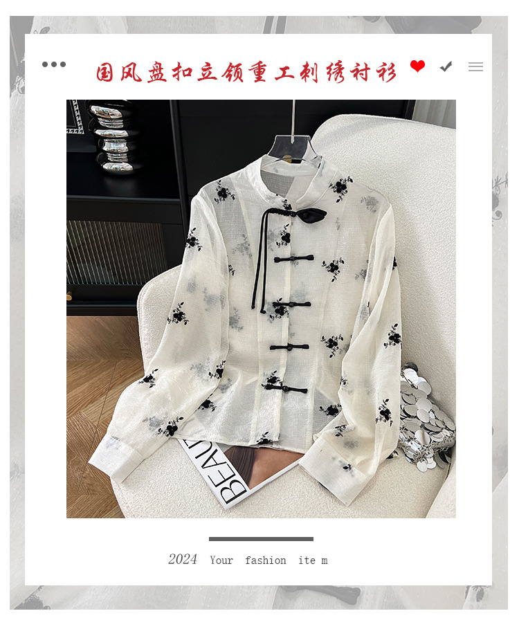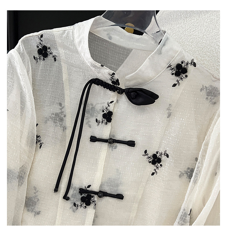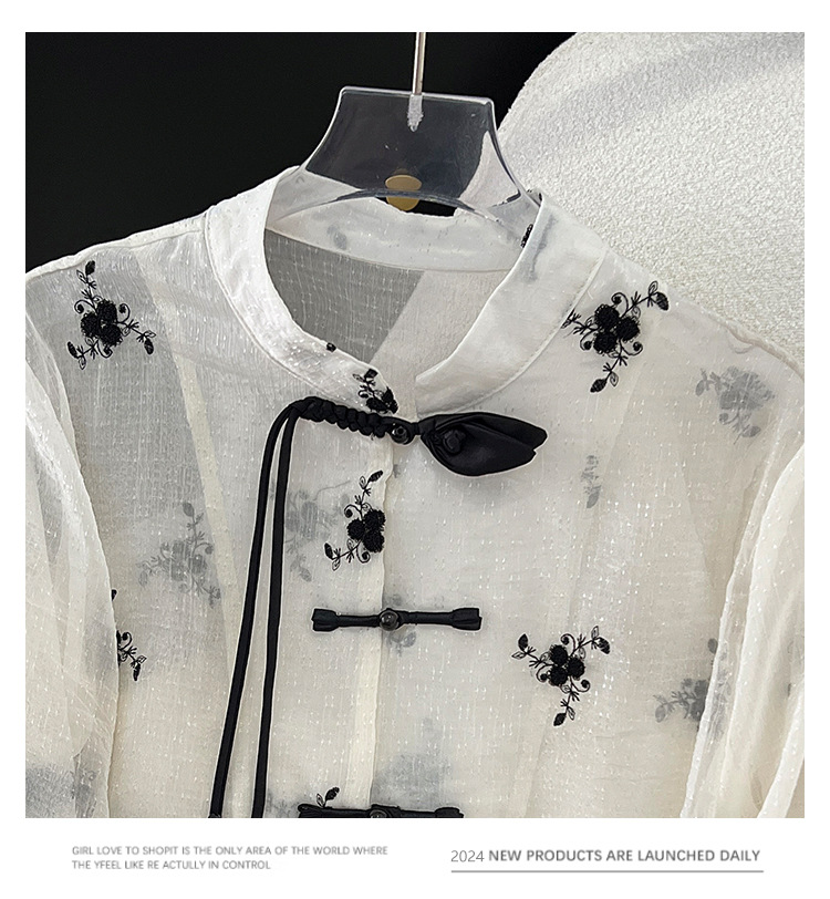 2024 여름 새로운 새로운 중국 스타일 국가 스타일 셔츠 복고풍 디자인 센스 틈새 버클 선 스크린 의류스토어 가기