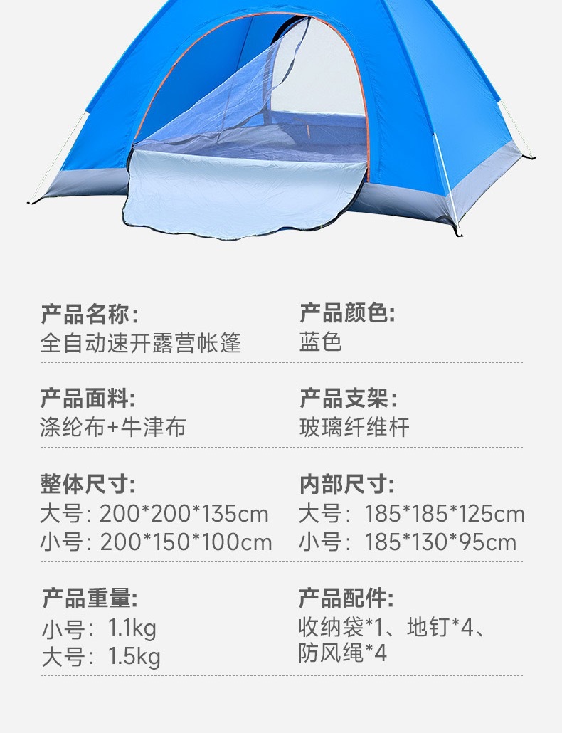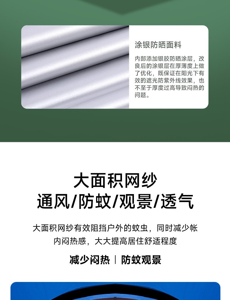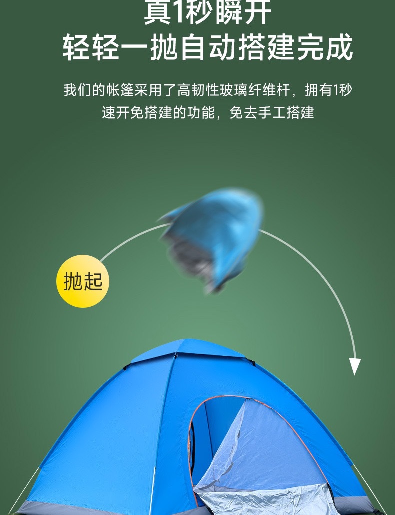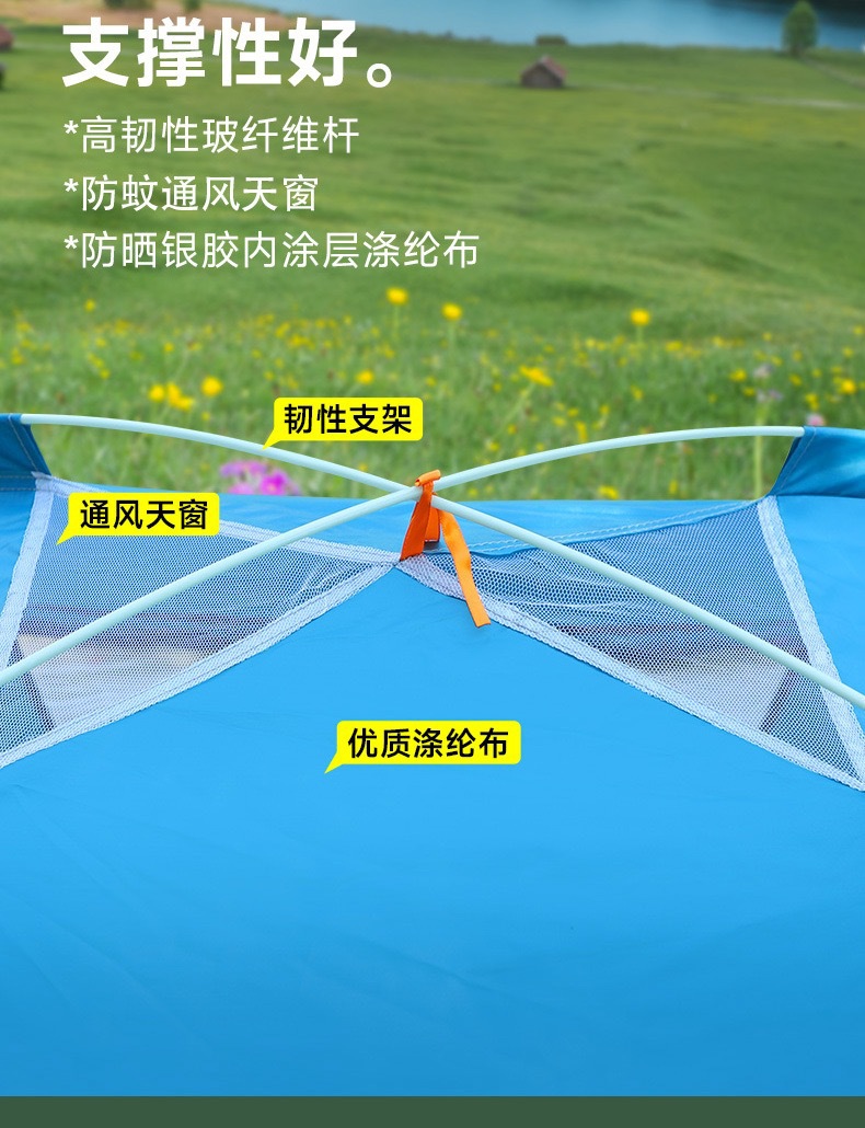 【产品特点】2秒速开,一抛即开,无需搭建,可适用于户外野营、公园休闲等实用面广。涤塔夫涂银面料,防晒健康无异味。纤维帐杆任性好不易损坏。便携式包装袋,体积小携带方便。