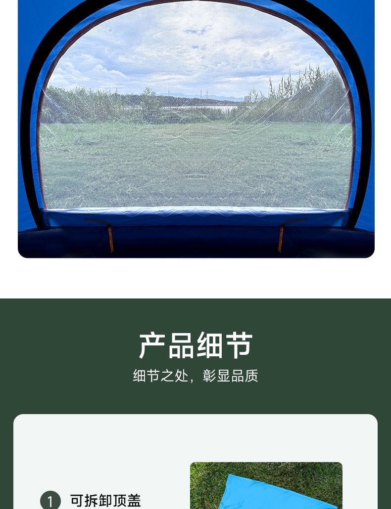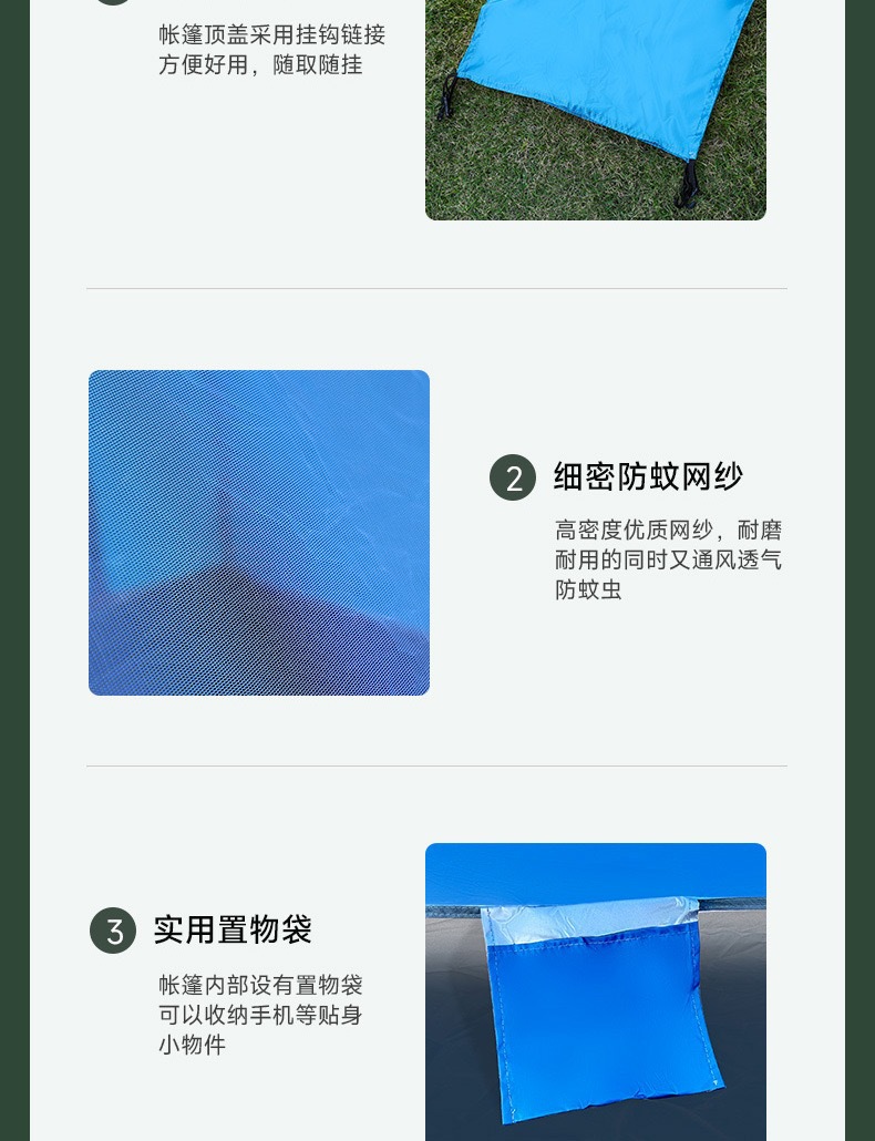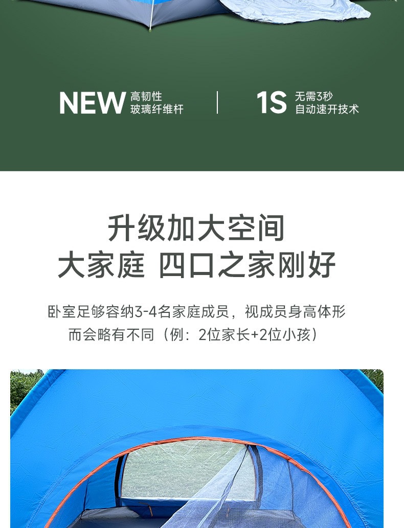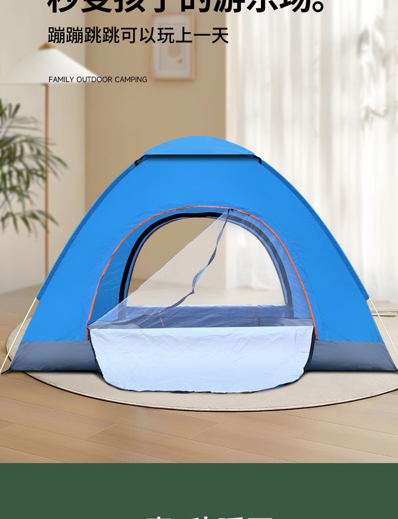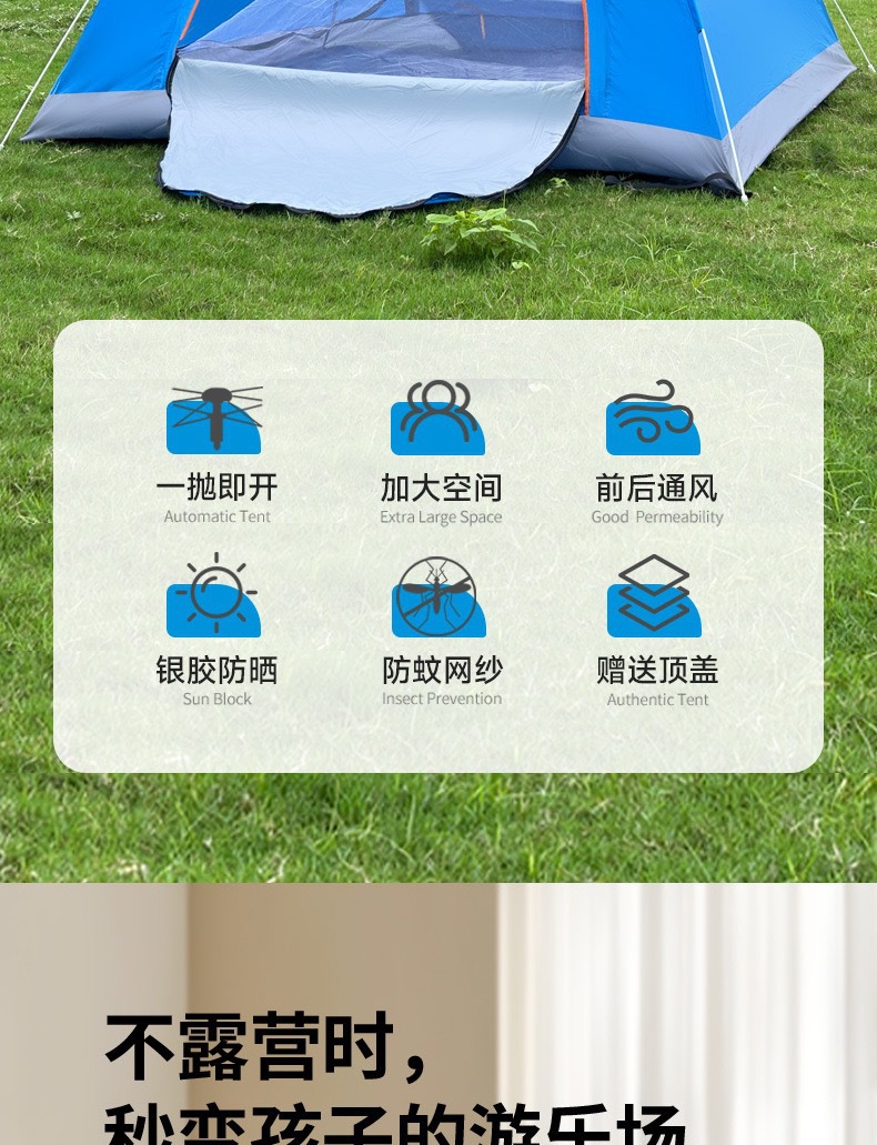 【产品特点】2秒速开,一抛即开,无需搭建,可适用于户外野营、公园休闲等实用面广。涤塔夫涂银面料,防晒健康无异味。纤维帐杆任性好不易损坏。便携式包装袋,体积小携带方便。
