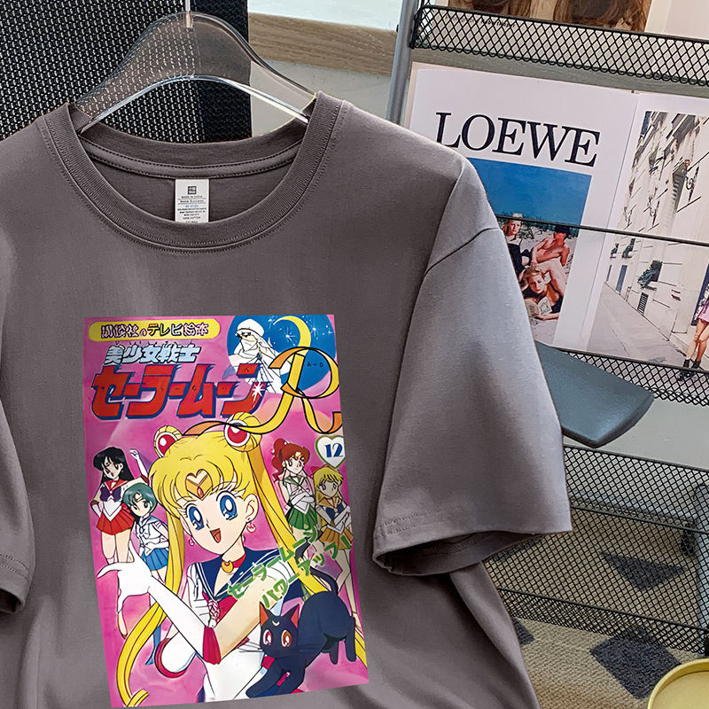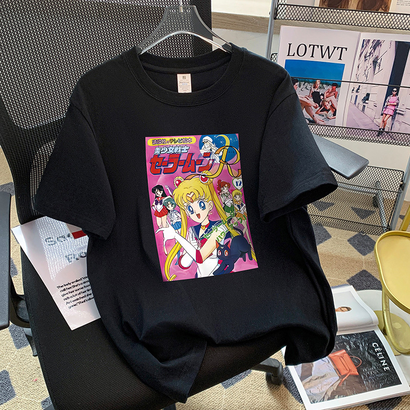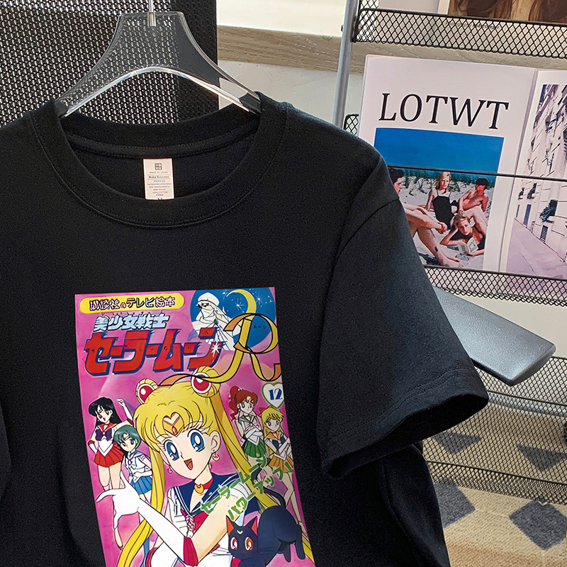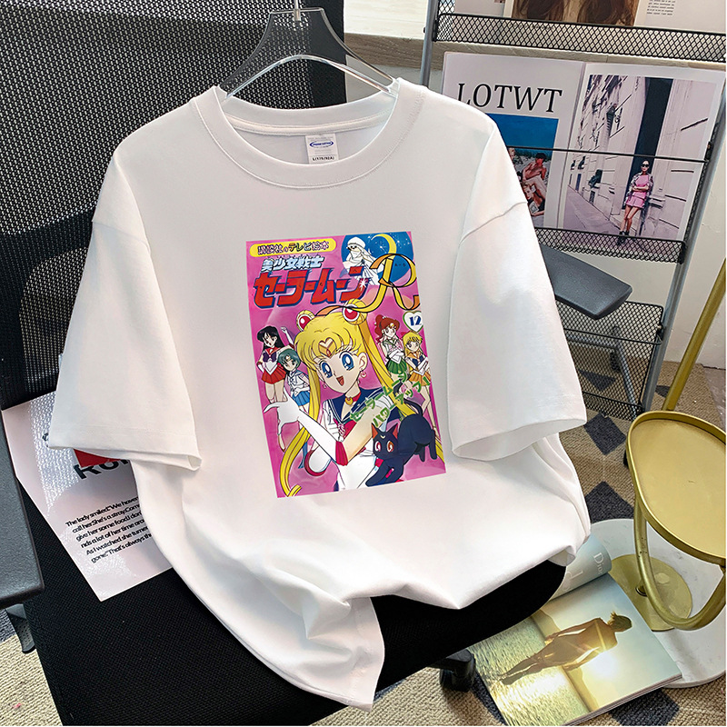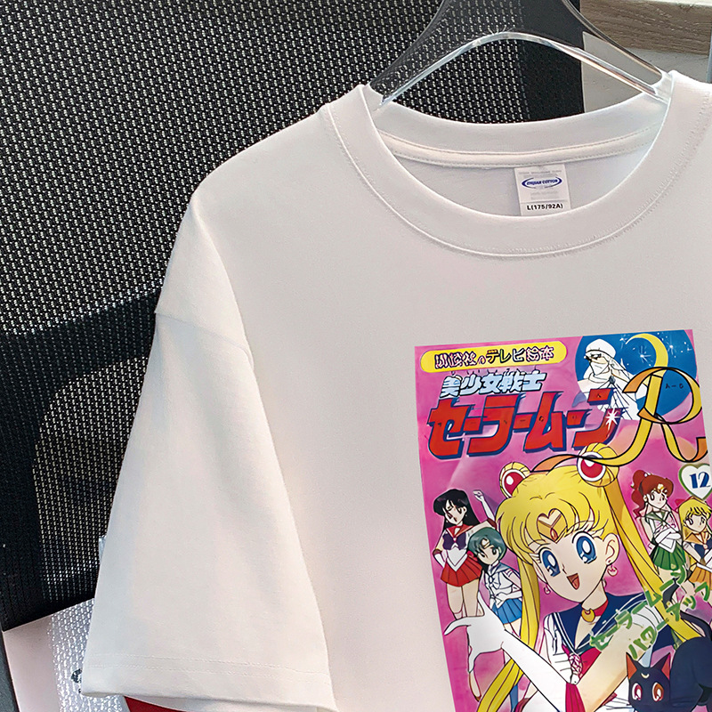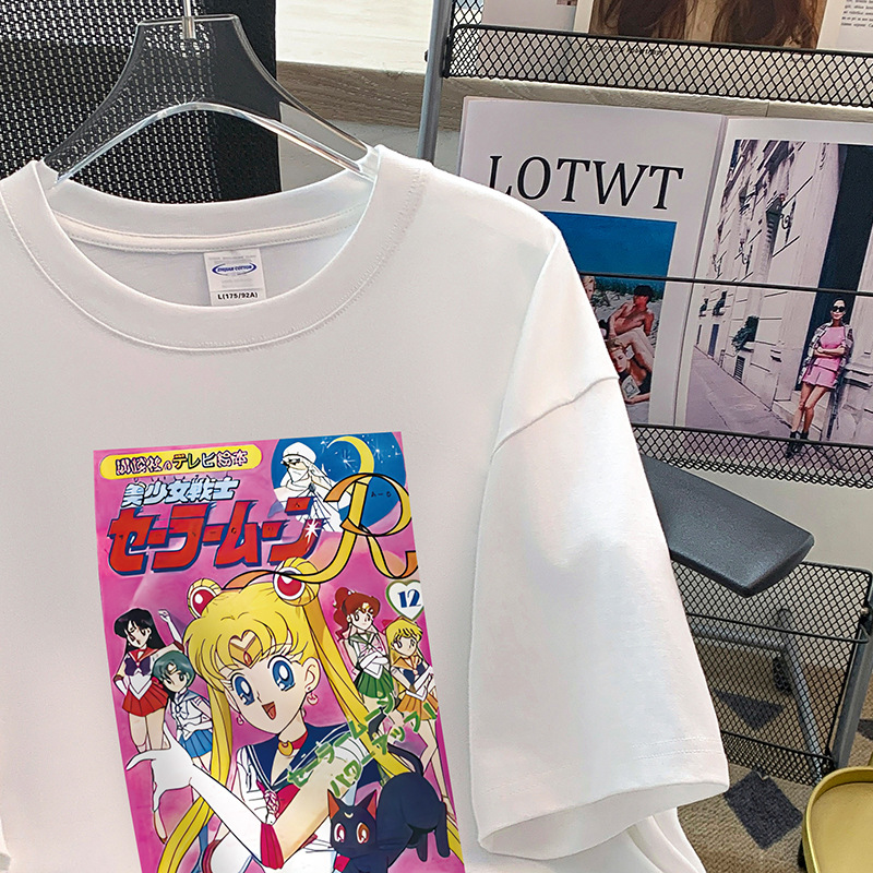 Ins 세련된 흰색 반팔 티셔츠 여성 여름 선원 달 만화 인쇄 디자인 틈새 느슨한 탑스토어 가기