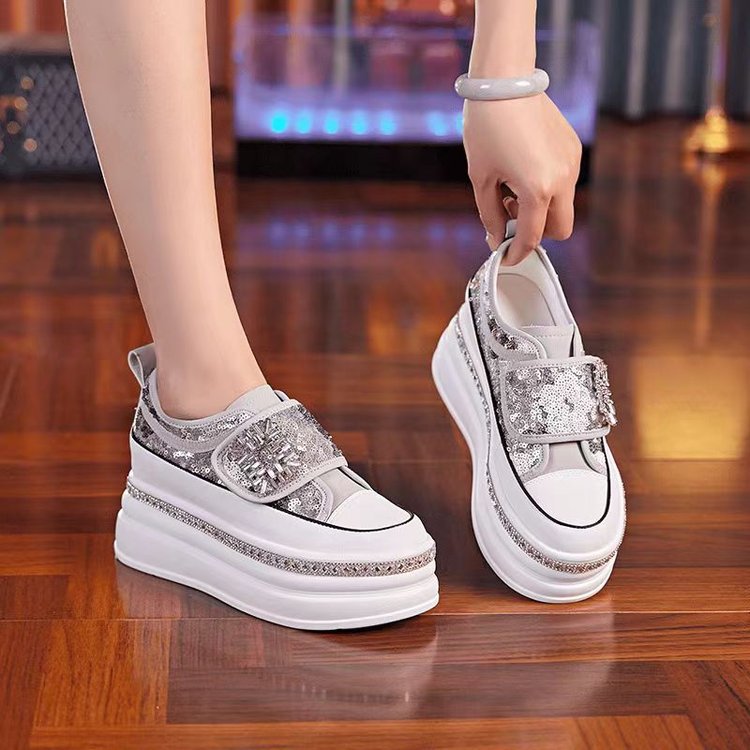 두꺼운 바닥 머핀 흰색 신발 여성 여름 2024 새로운 올 매치 벨크로 스팽글이 통기성 캐주얼 스니커즈를 높입니다.스토어 가기