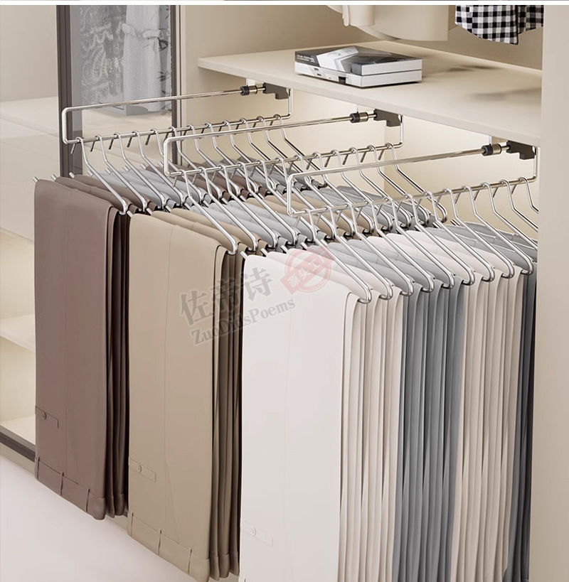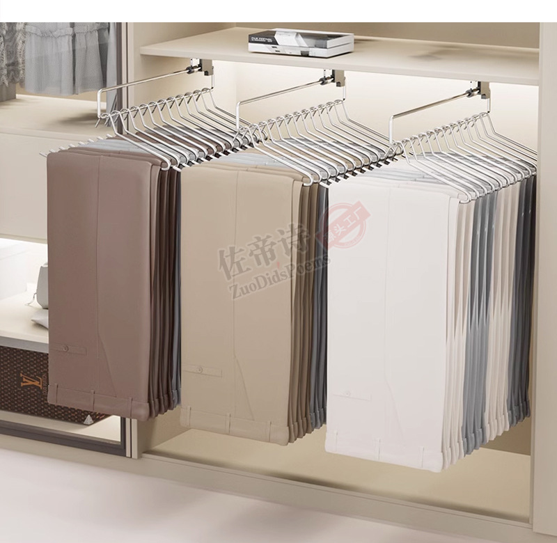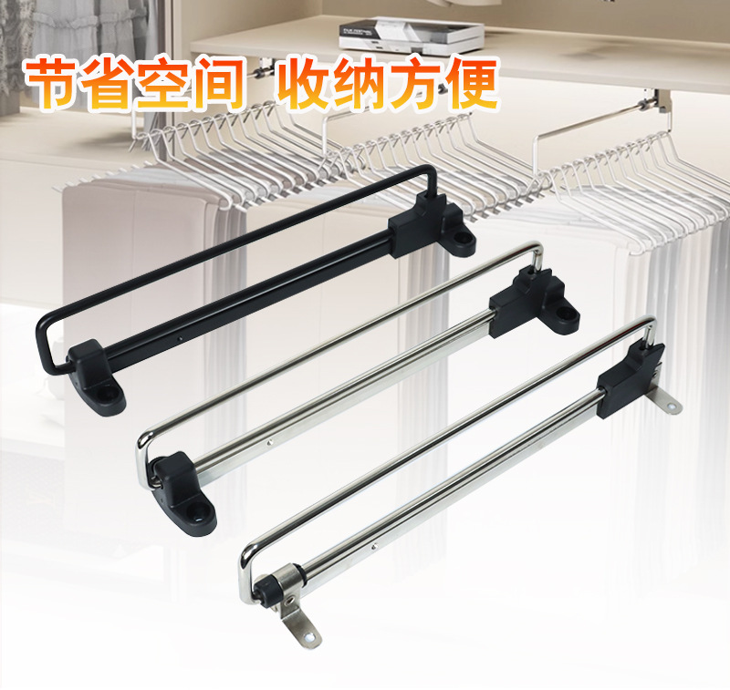 옷장 상단에 설치하는 접이식 옷걸이, 수납장 내부에 설치하는 수평 및 수직 슬라이드 레일 옷걸이, 검정색 드레스룸 옷걸이