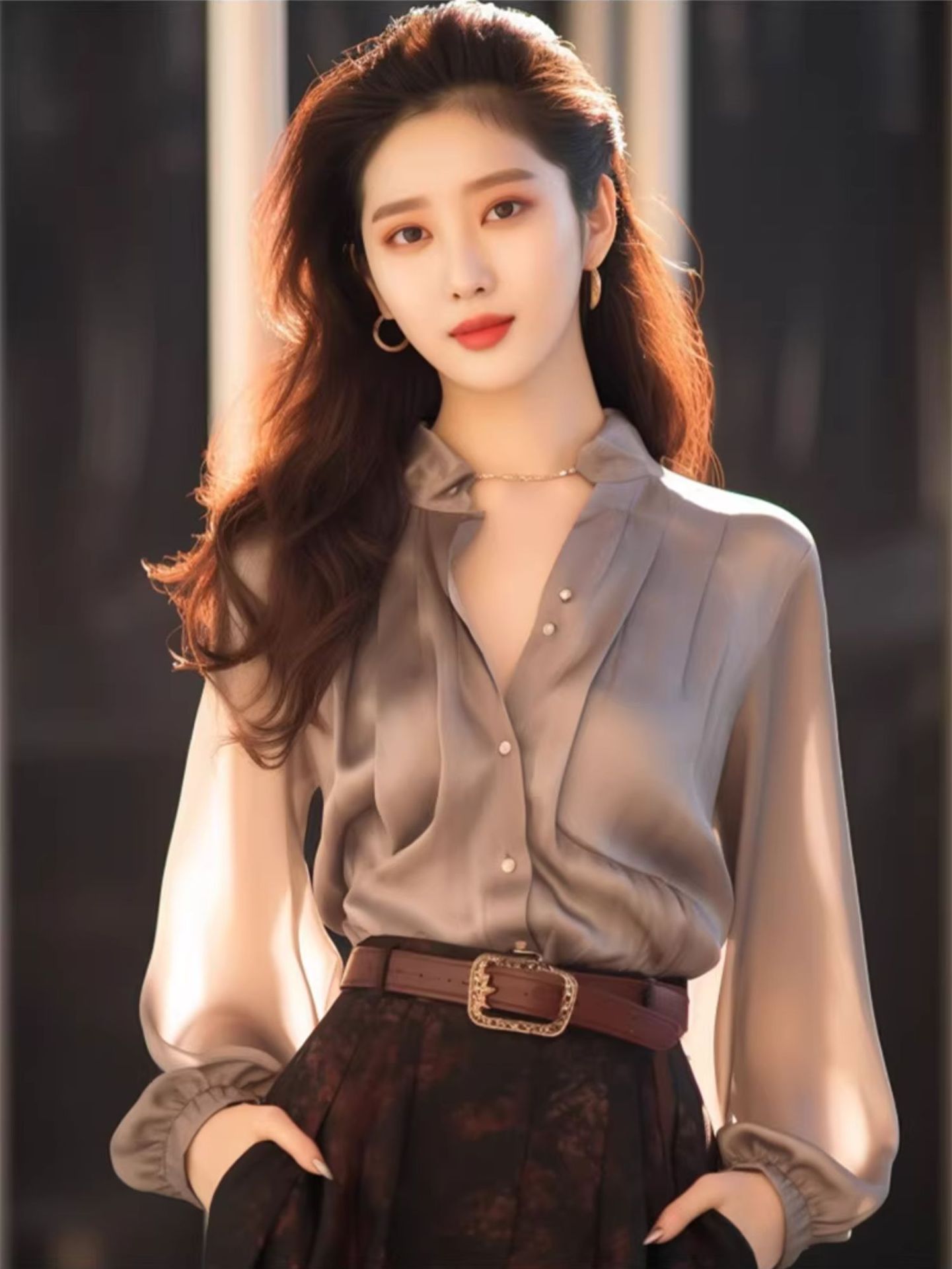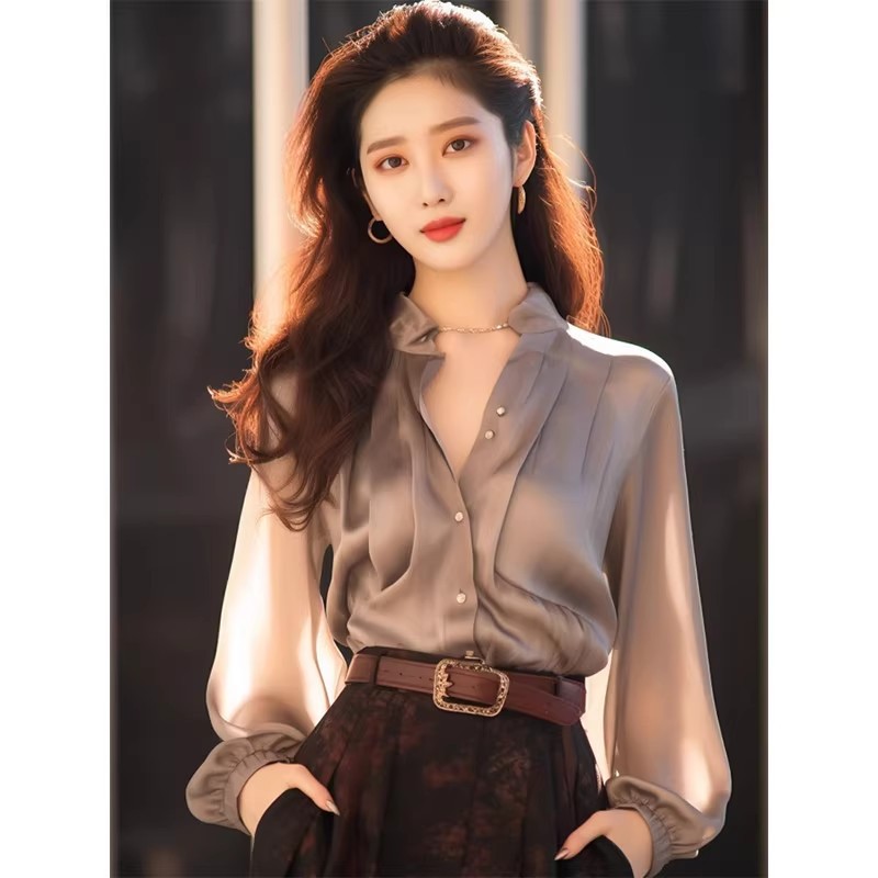 2025년 초봄 신상 고급 탑, 프렌치 스타일의 독특하고 아름다운, 나이를 줄여주는 고급스러운 느낌의 그레이 쉬폰 셔츠 여성용스토어 가기