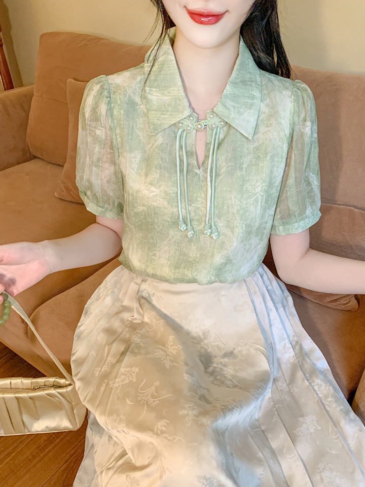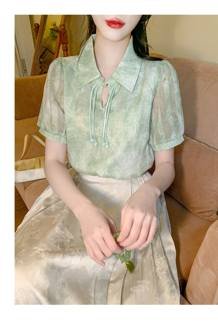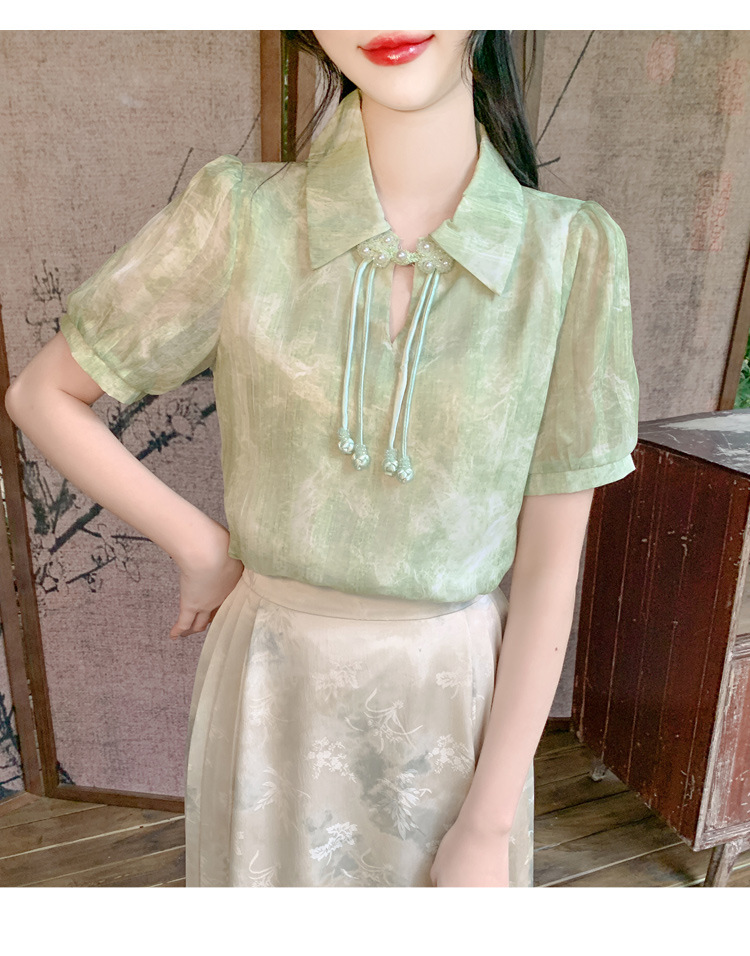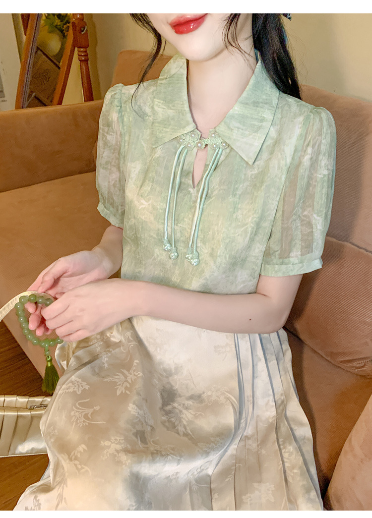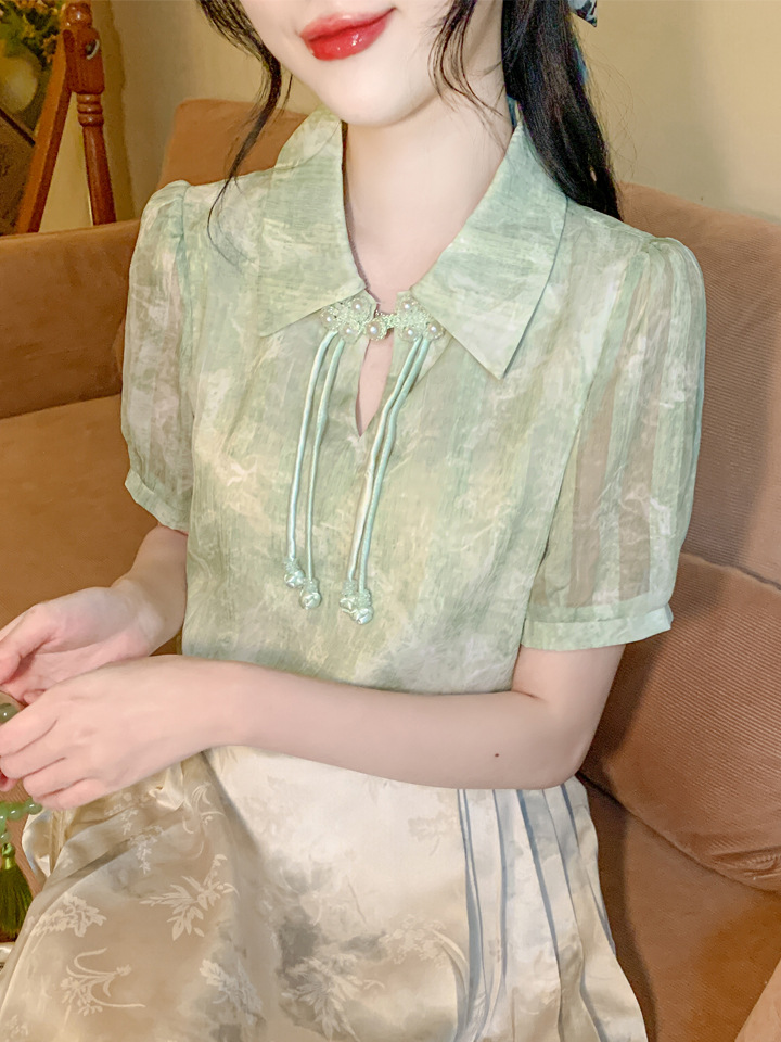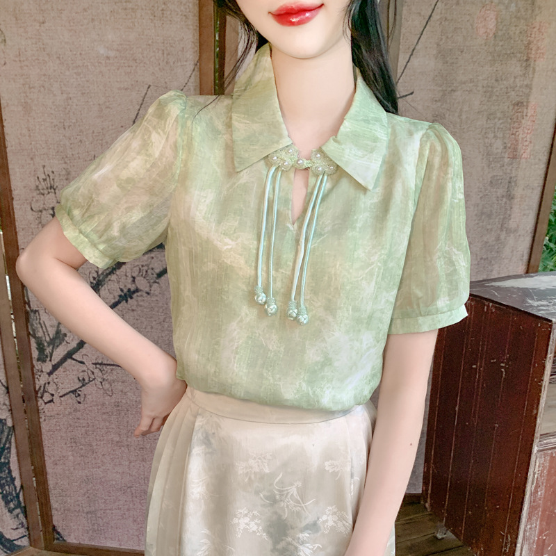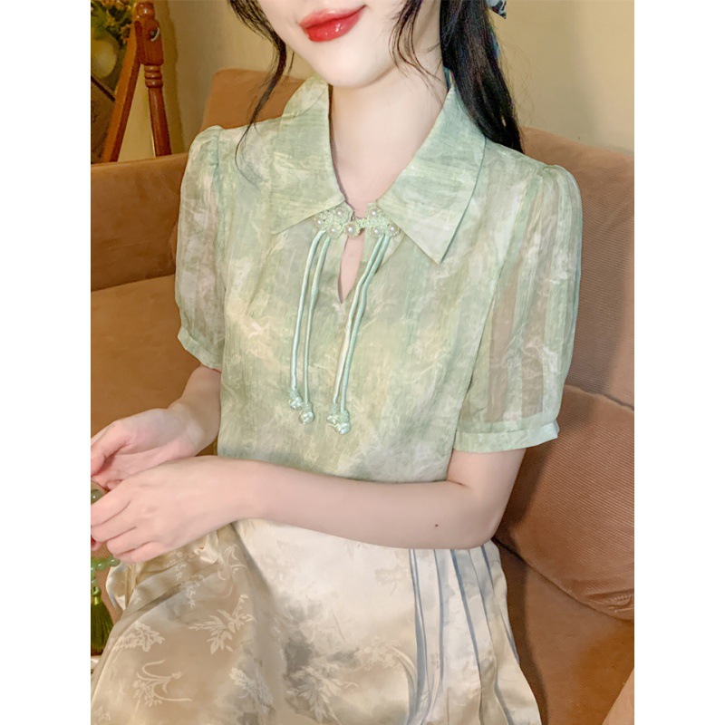 새로운 중국식 버튼 라셀 쉬폰 라이닝 여름 반팔 청삼 셔츠 세련되고 아름다운 넥타이 염색 탑스토어 가기