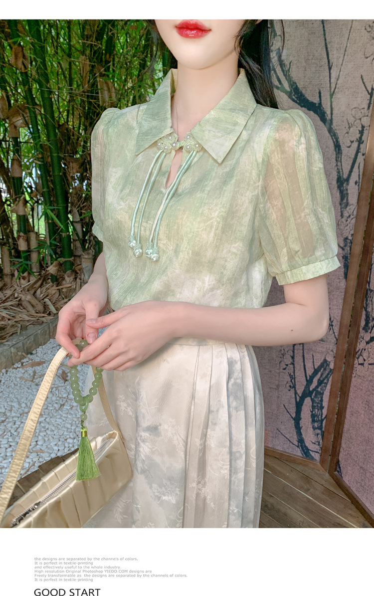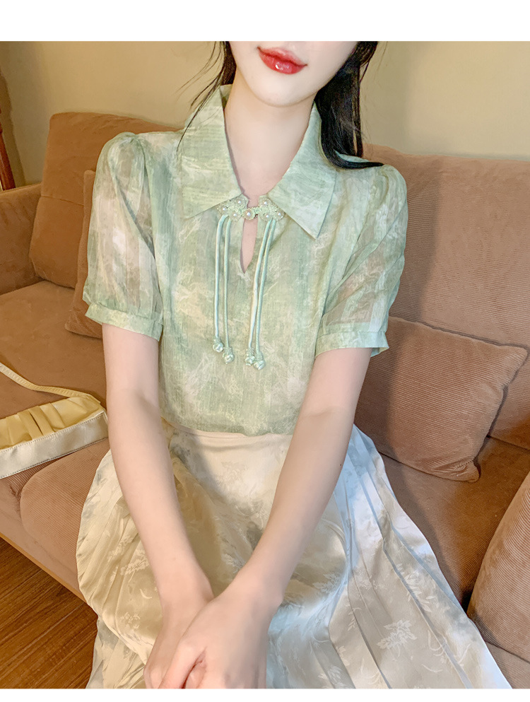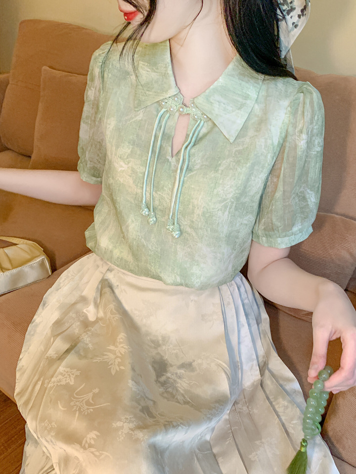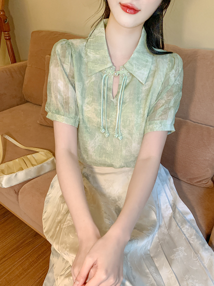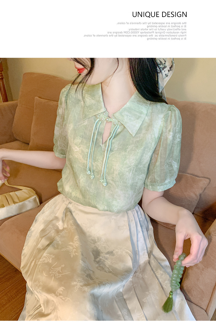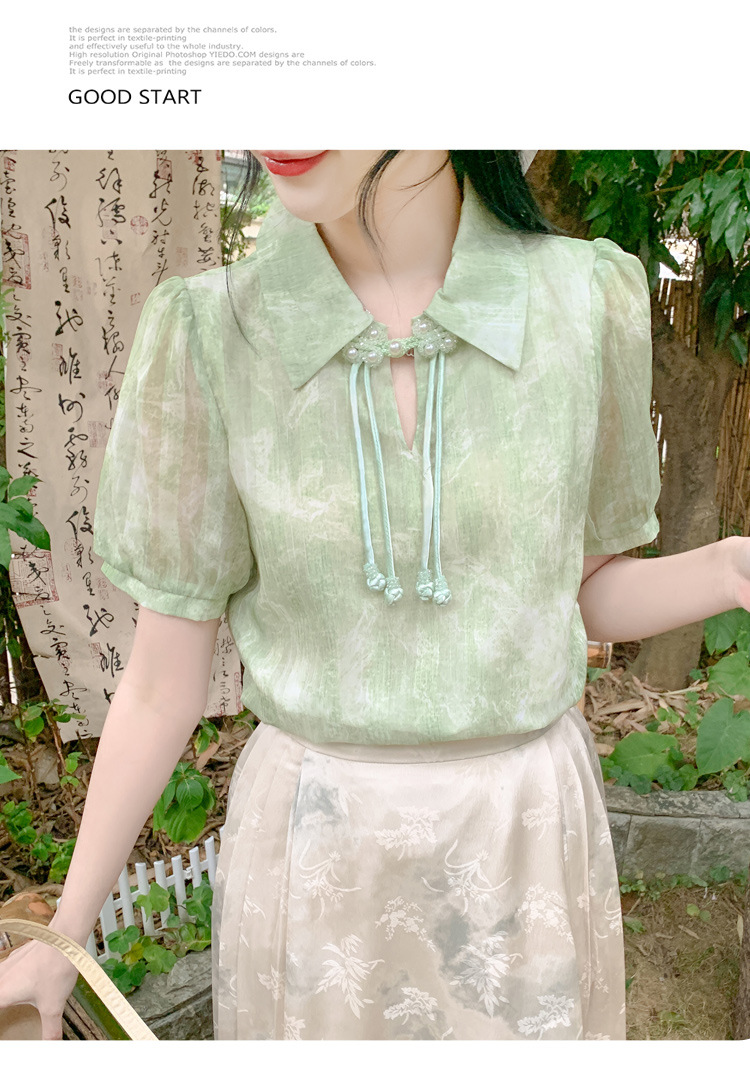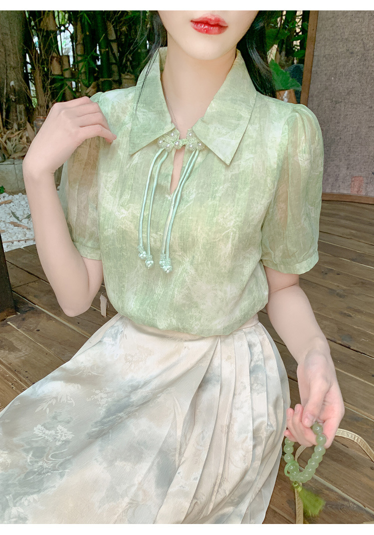 새로운 중국식 버튼 라셀 쉬폰 라이닝 여름 반팔 청삼 셔츠 세련되고 아름다운 넥타이 염색 탑스토어 가기