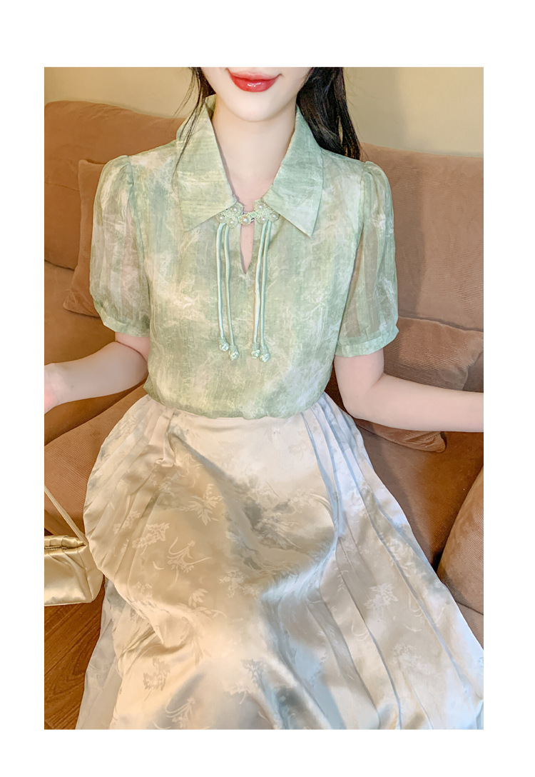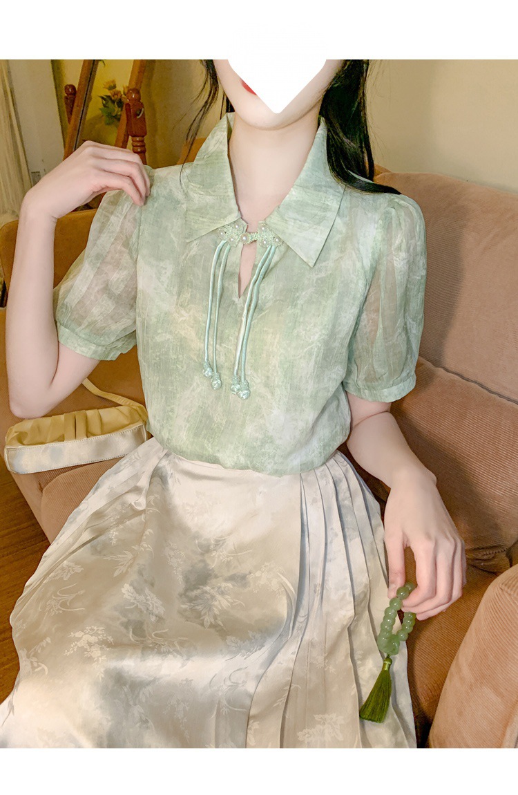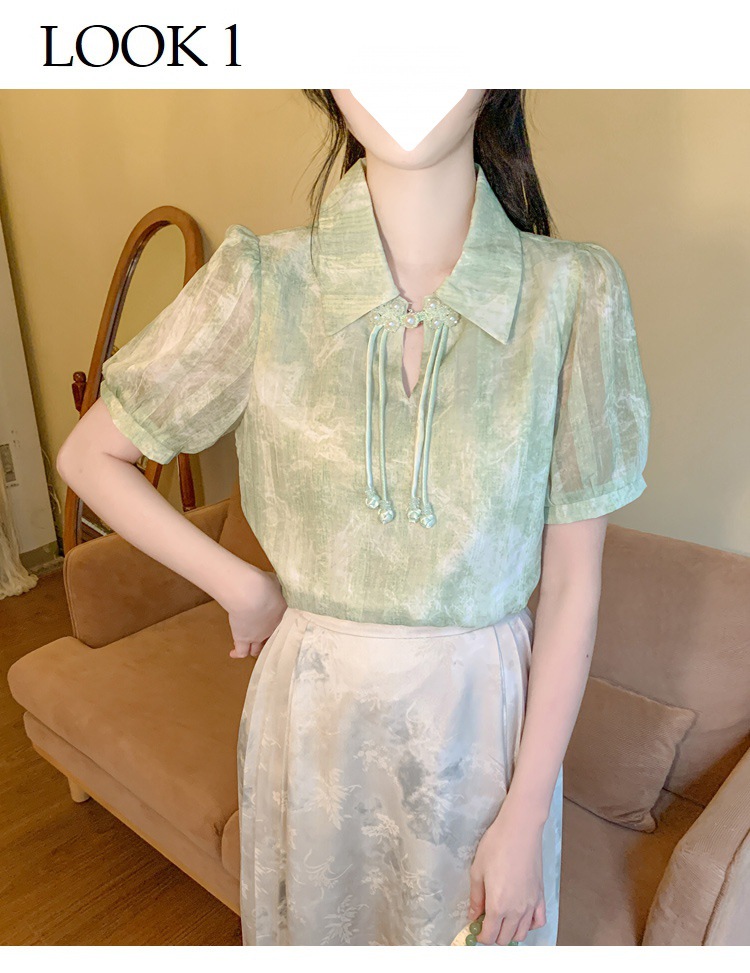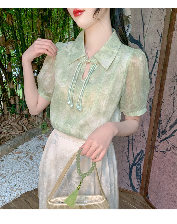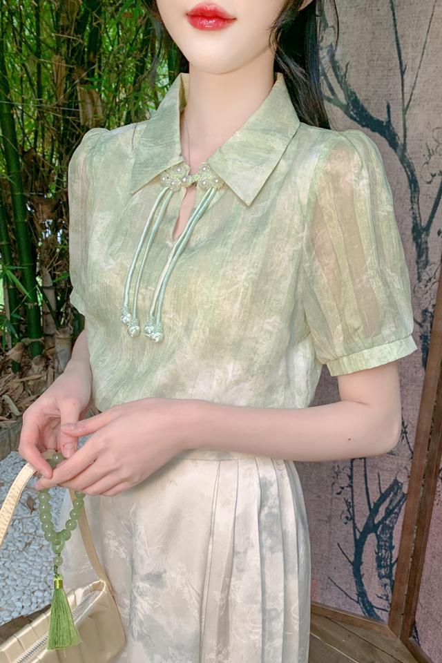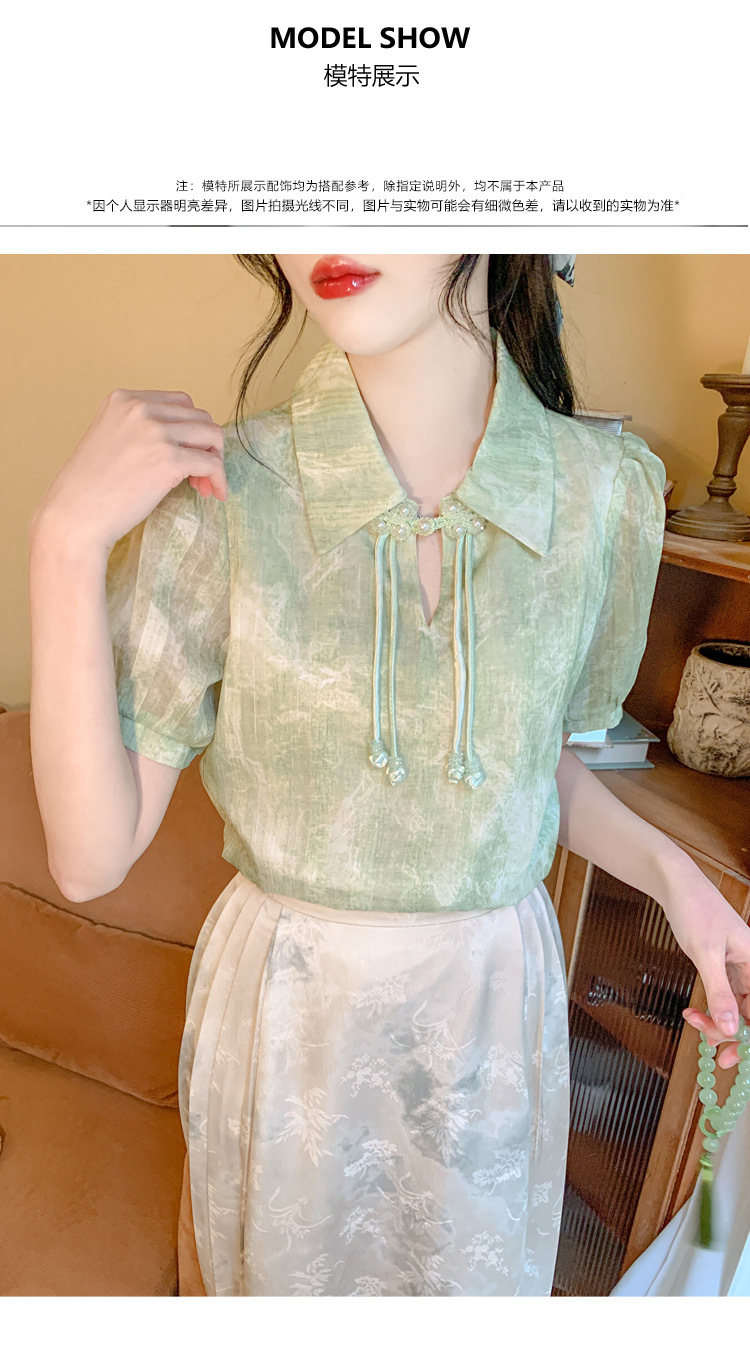 새로운 중국식 버튼 라셀 쉬폰 라이닝 여름 반팔 청삼 셔츠 세련되고 아름다운 넥타이 염색 탑스토어 가기