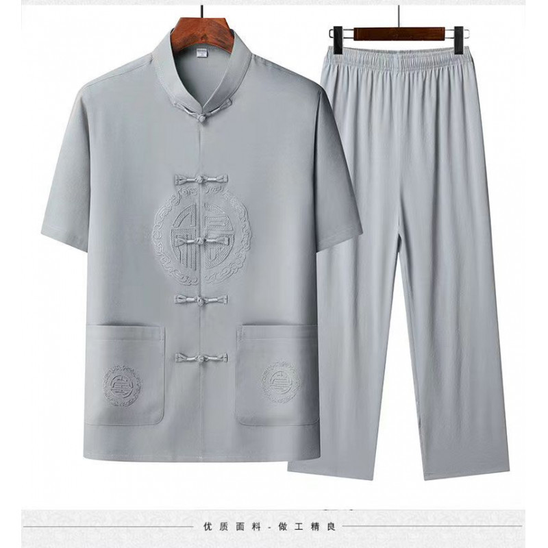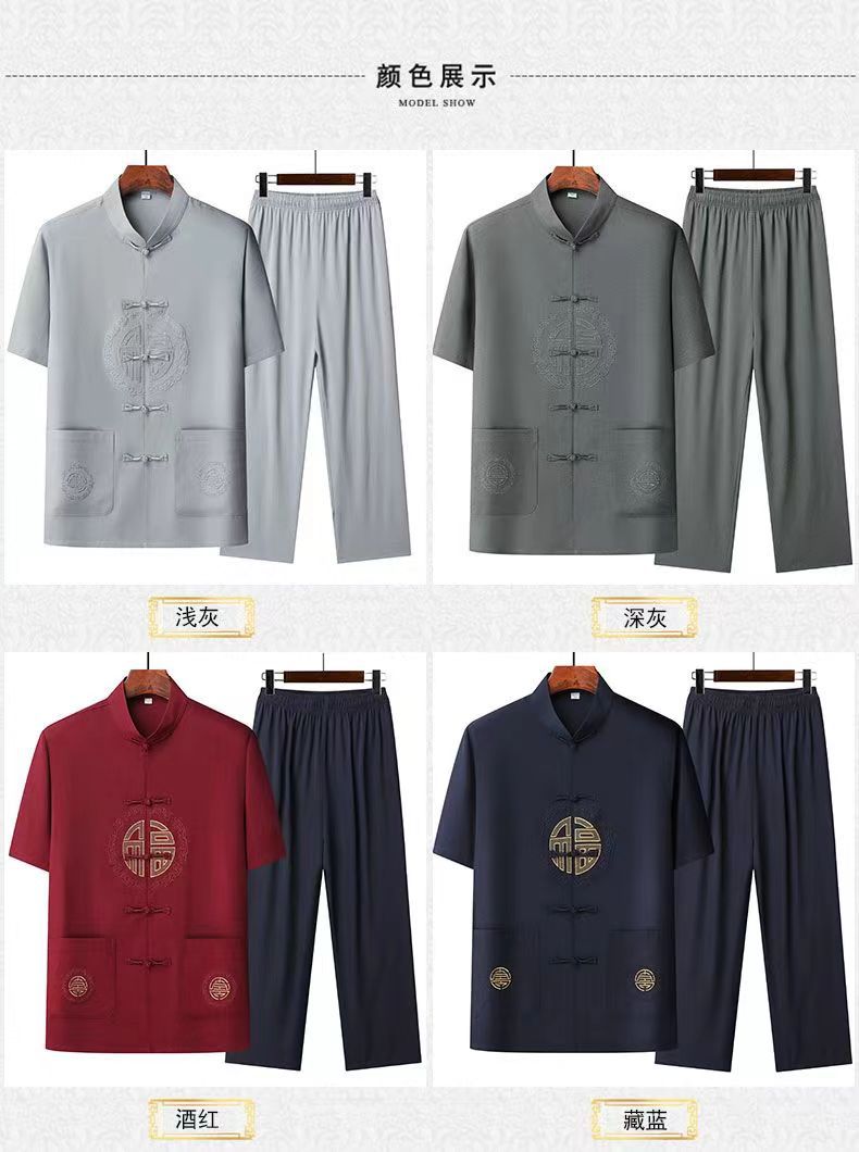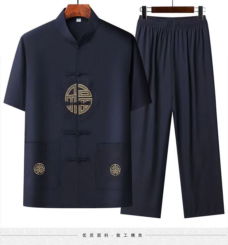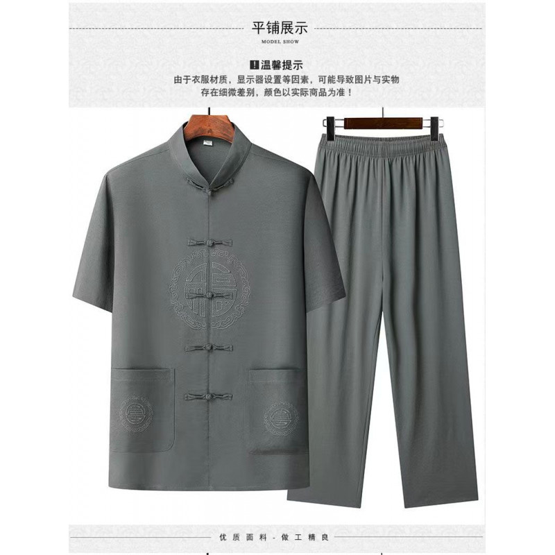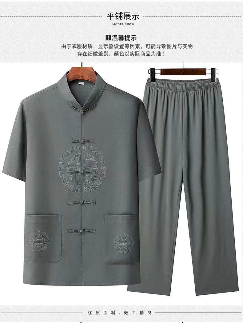 탕 세트 남성 중년 및 노인 여름 반팔 세트 중국 스타일 자수 아빠 캐주얼 루즈 대형 할아버지 얇은 세트