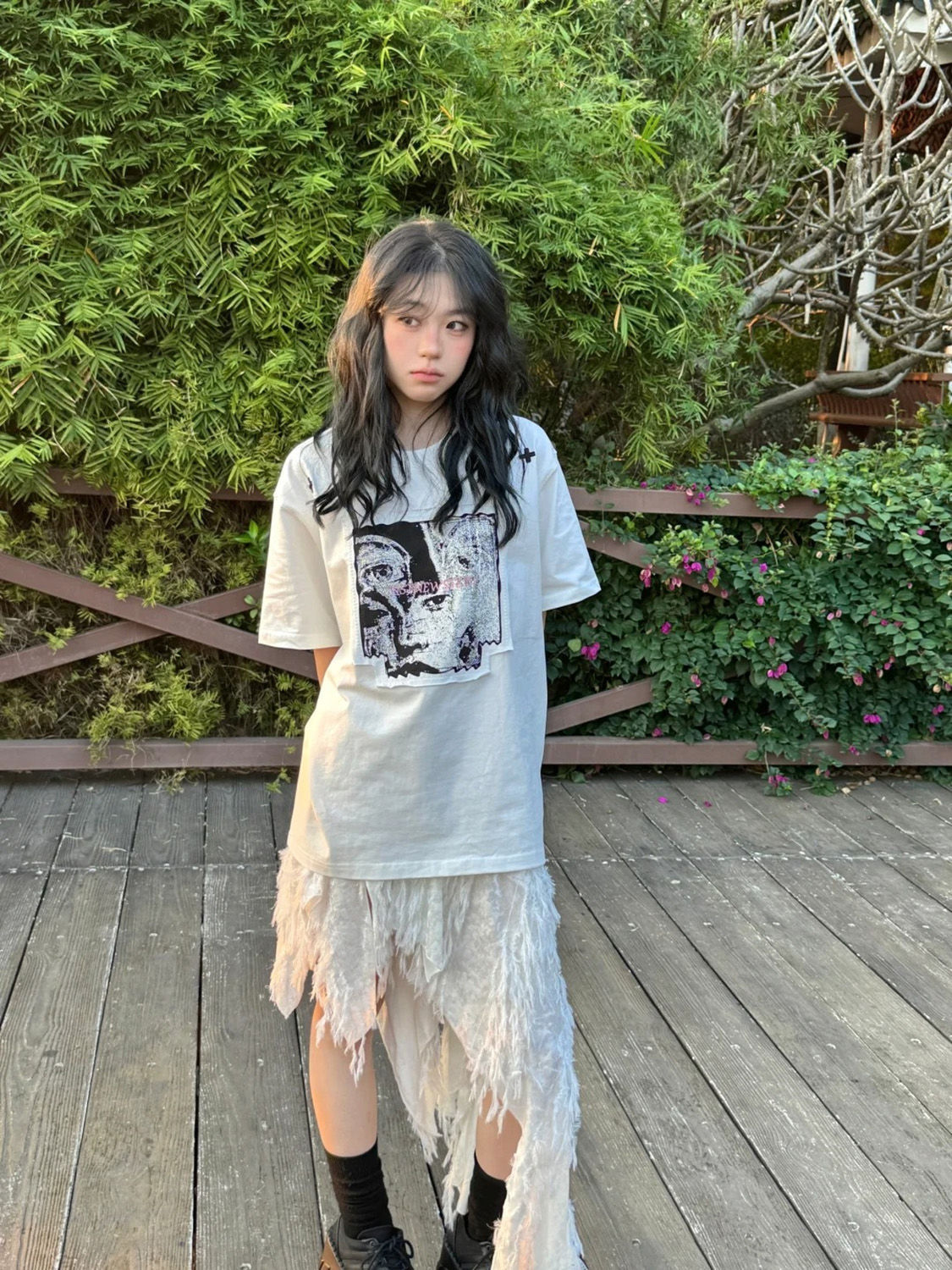 아메리칸 스타일 화이트 패치 워크 반팔 티셔츠 여성 여름 여름 새로운 무거운 무게 압착 느슨한 슬리밍 반소매 탑스토어 가기