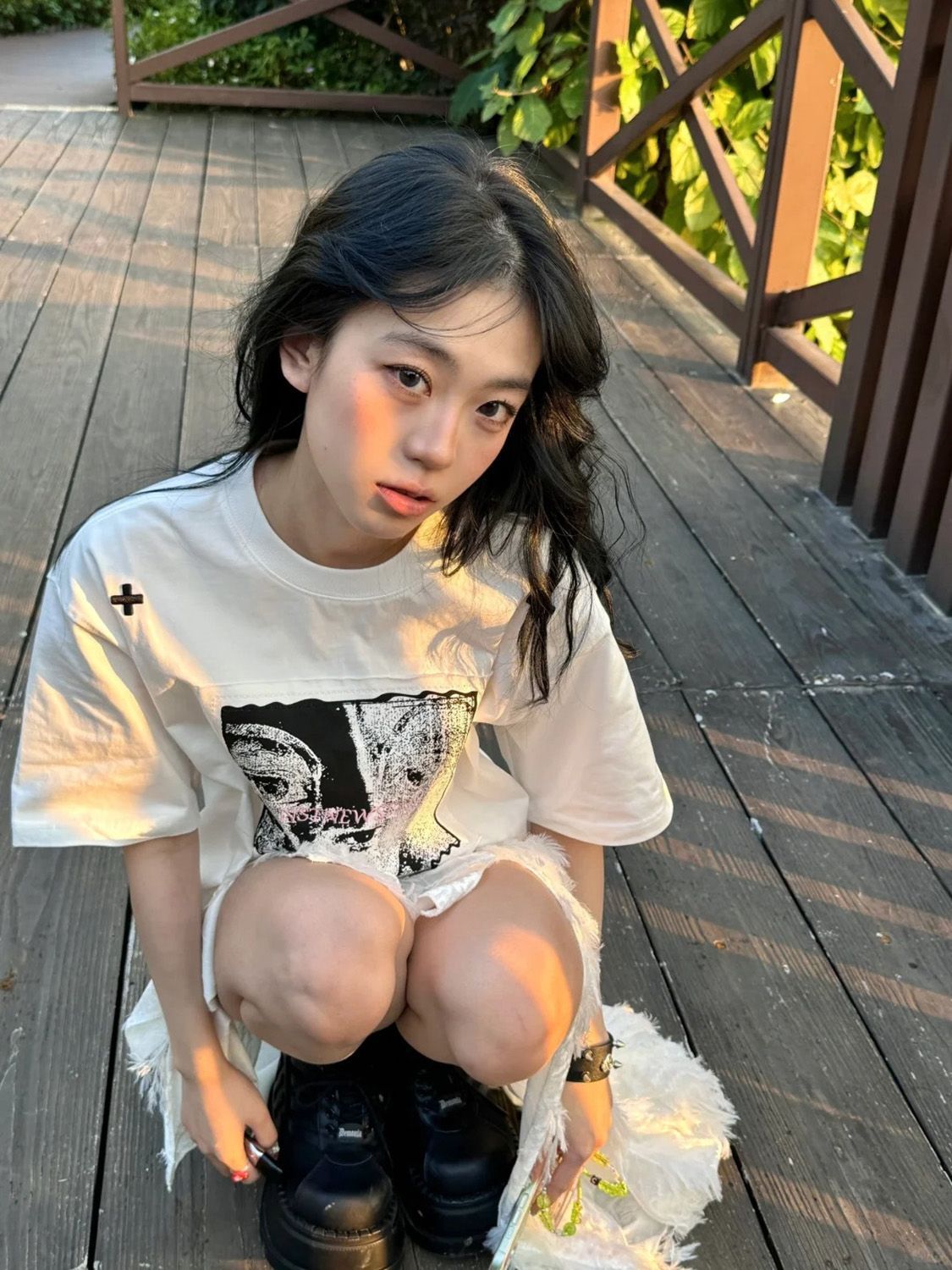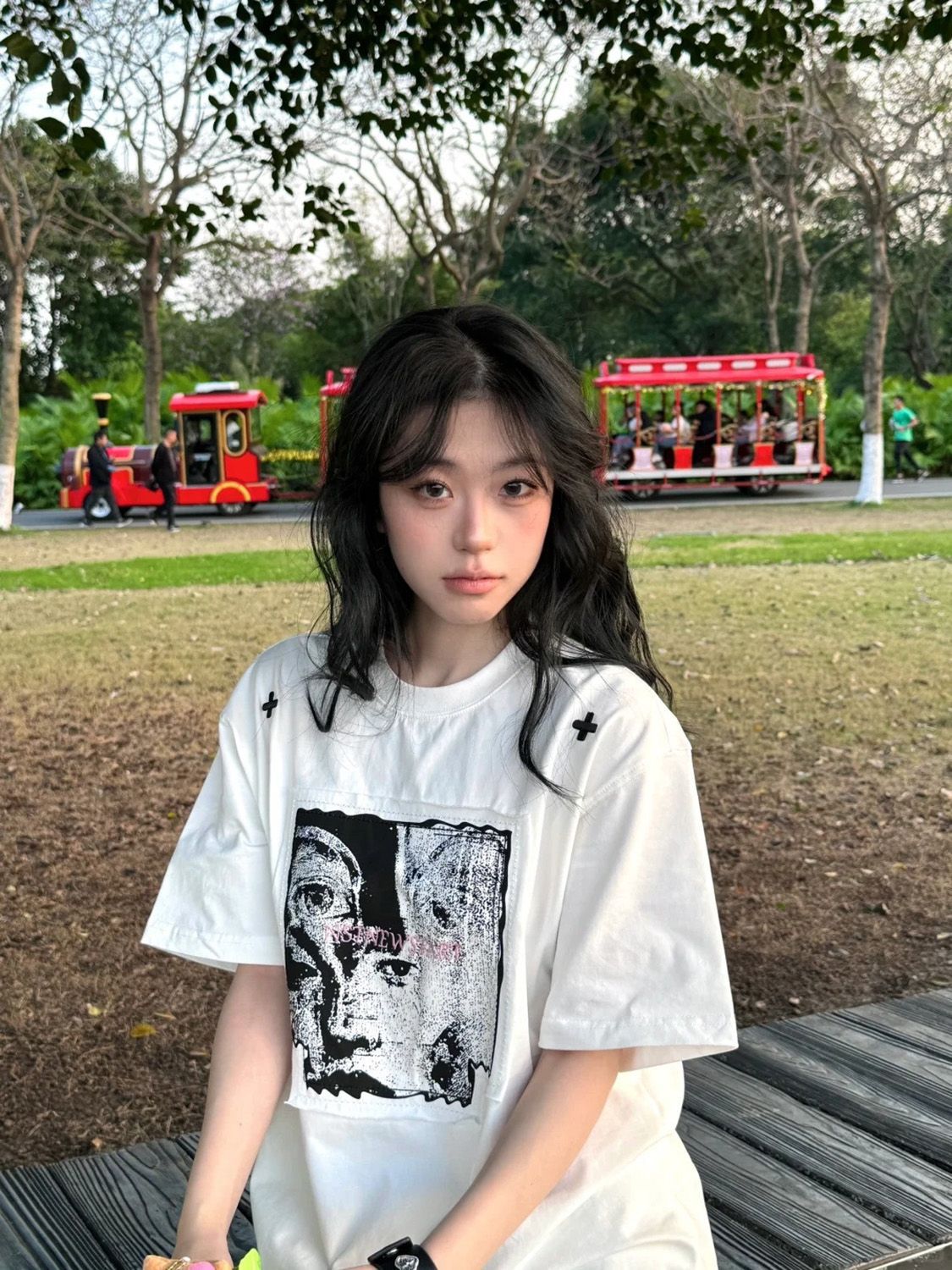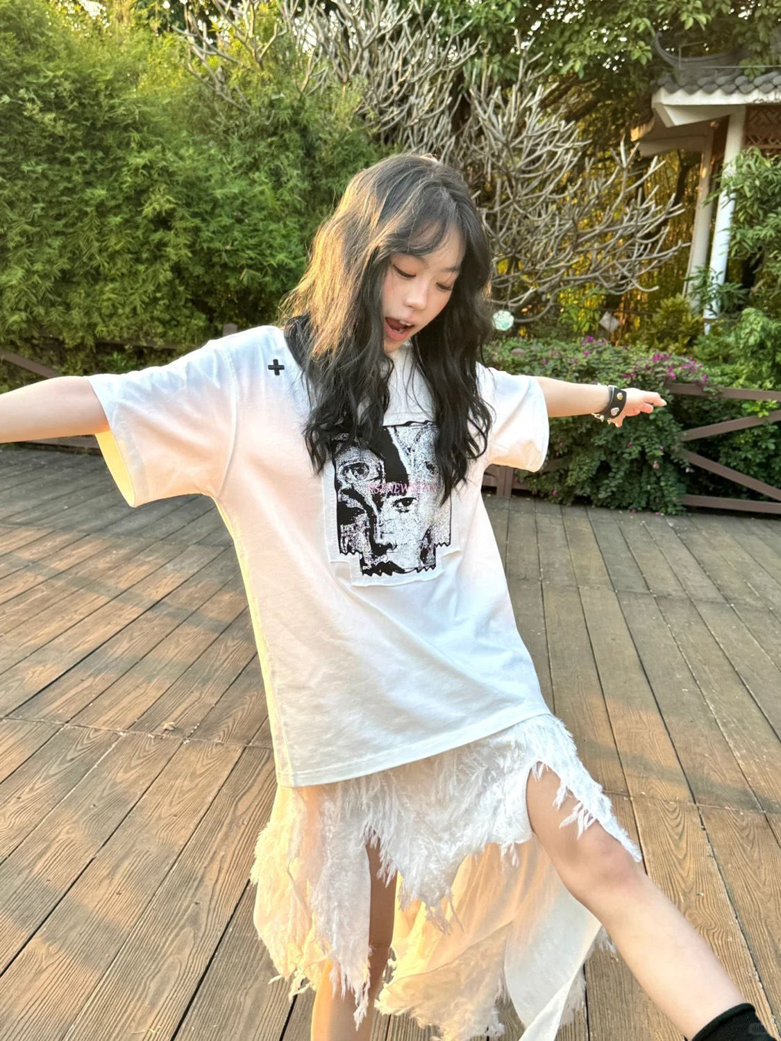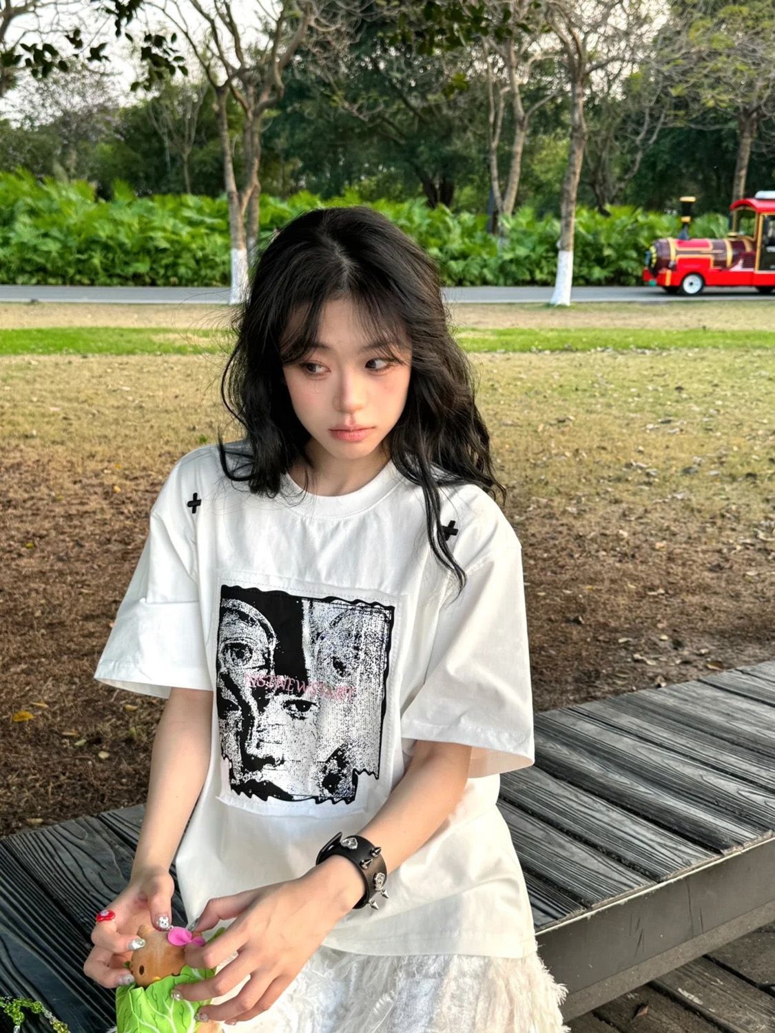 아메리칸 스타일 화이트 패치 워크 반팔 티셔츠 여성 여름 여름 새로운 무거운 무게 압착 느슨한 슬리밍 반소매 탑