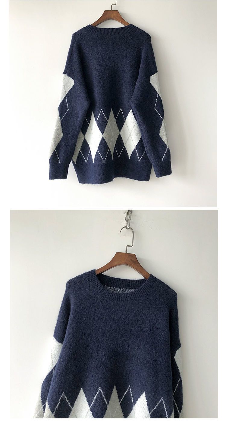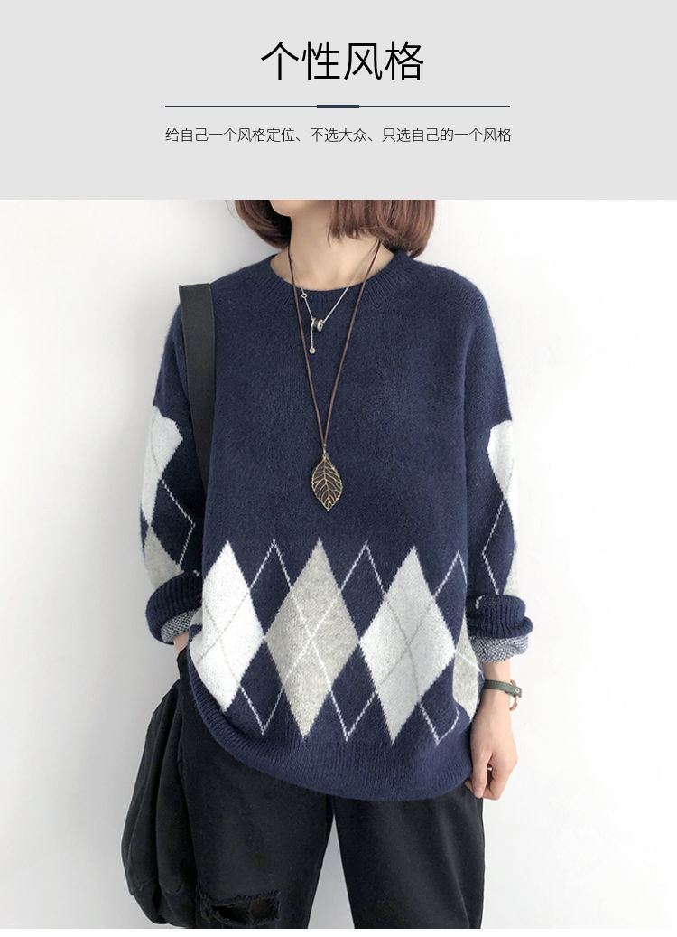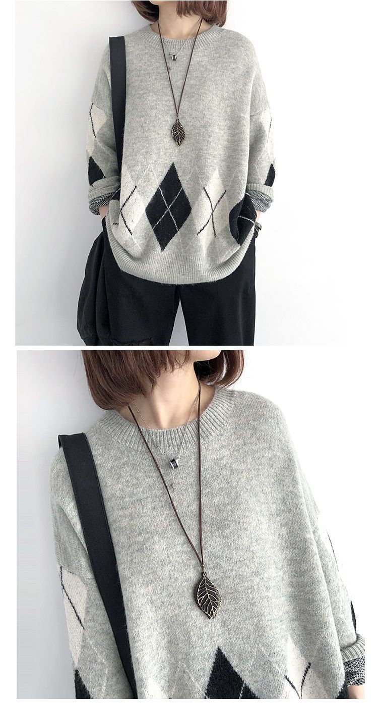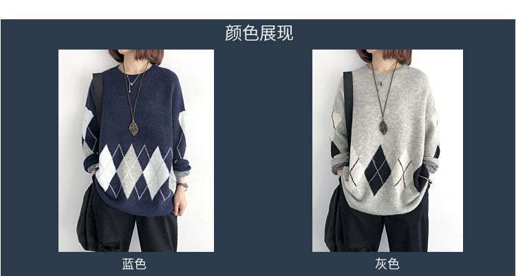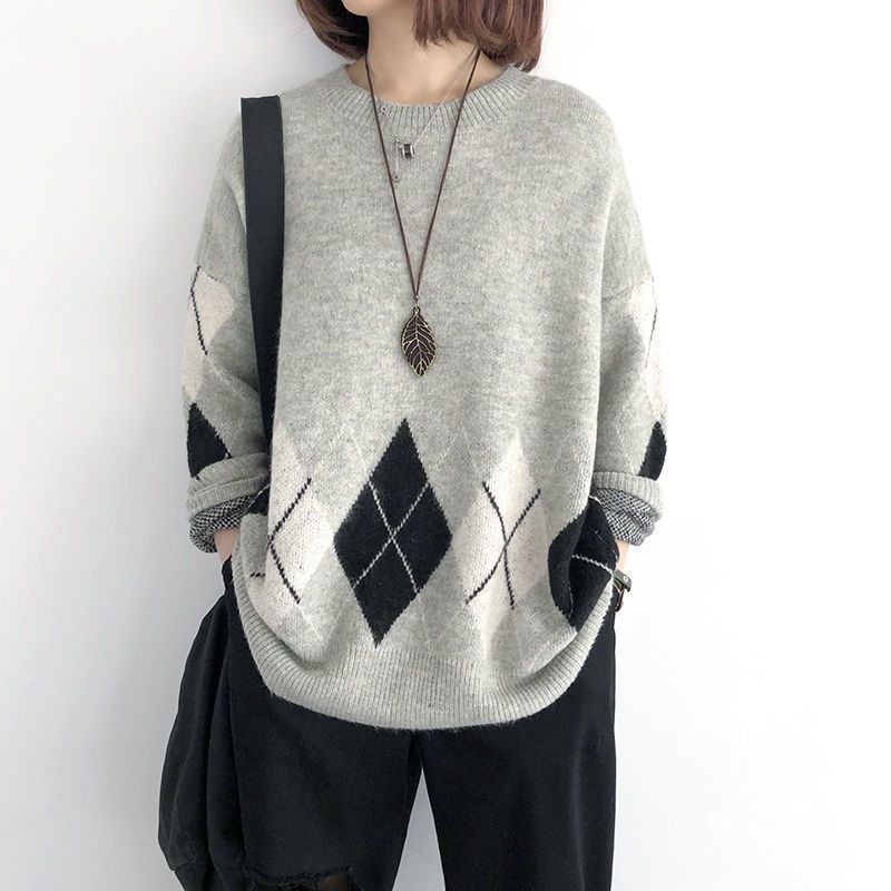 일본식 간단한 가을과 겨울 새로운 두꺼운 따뜻한 베이스 셔츠 다이아몬드 스웨터 여성용 느슨한 풀오버 라운드 넥 스웨터