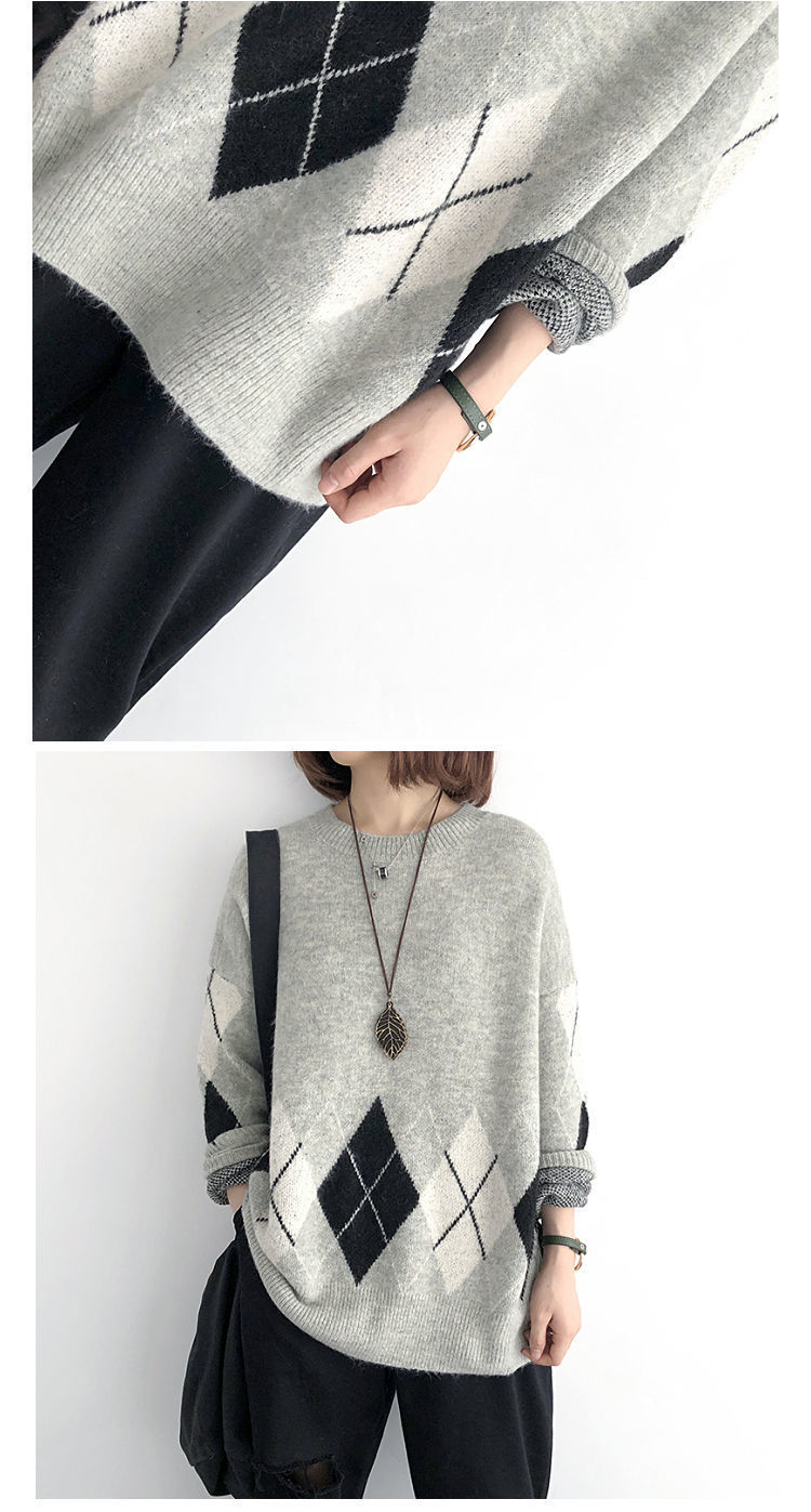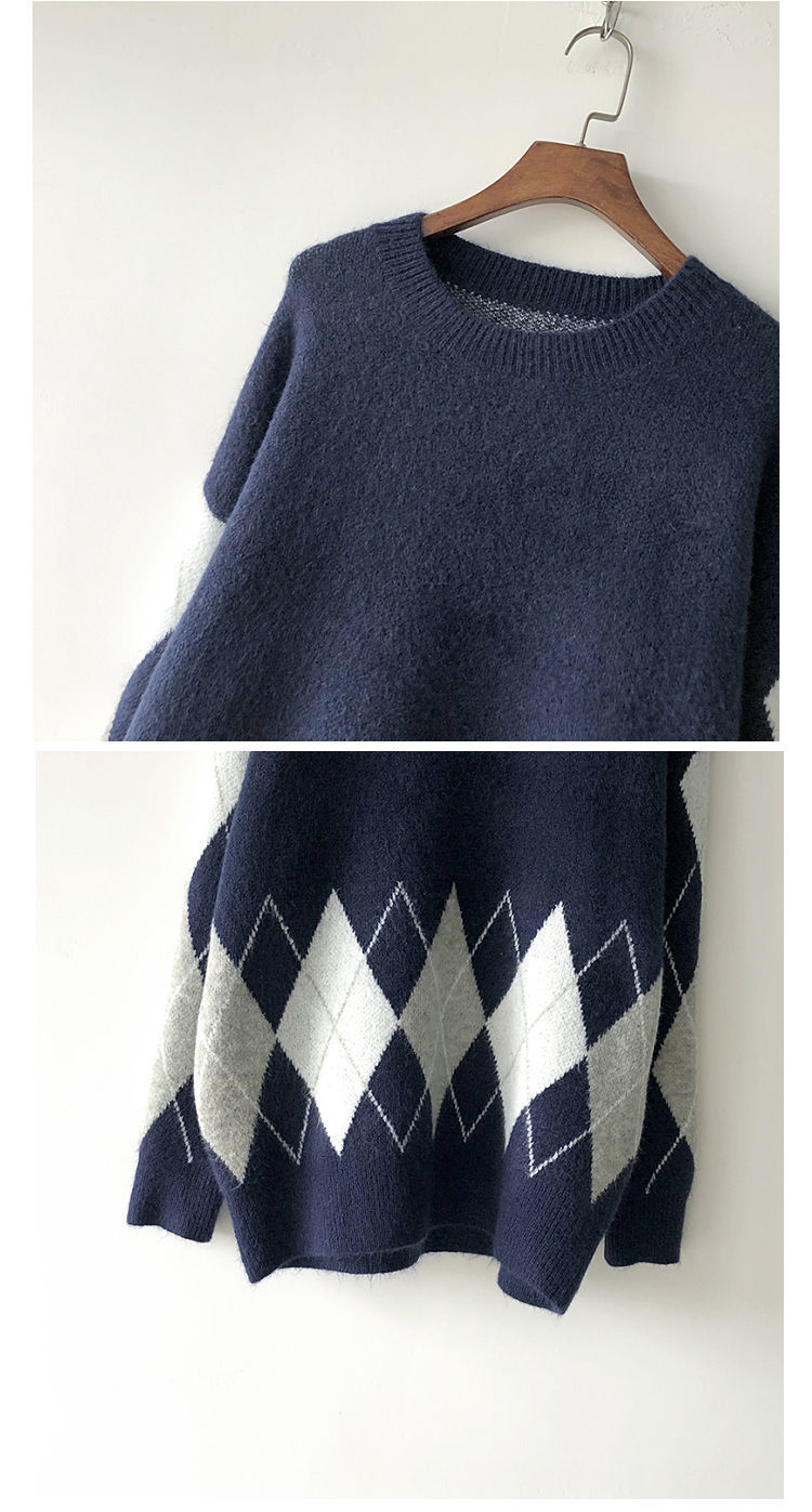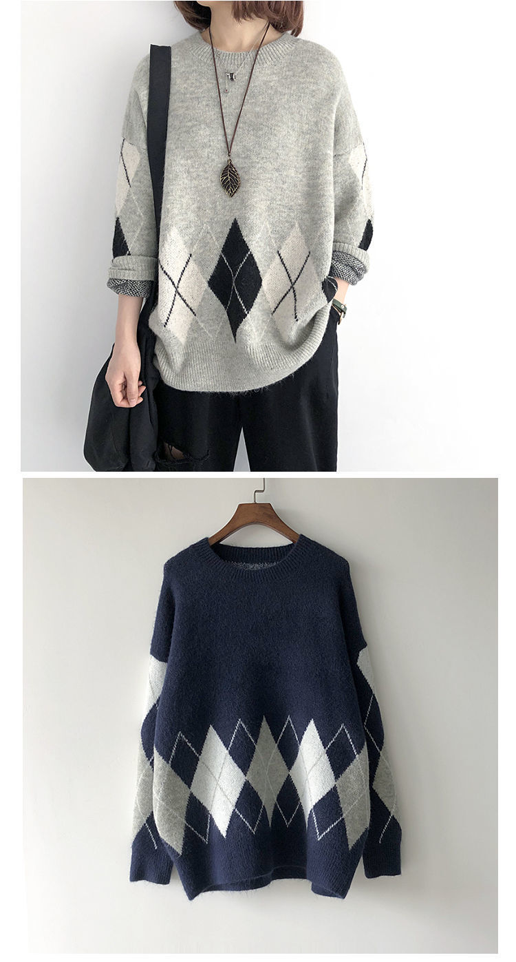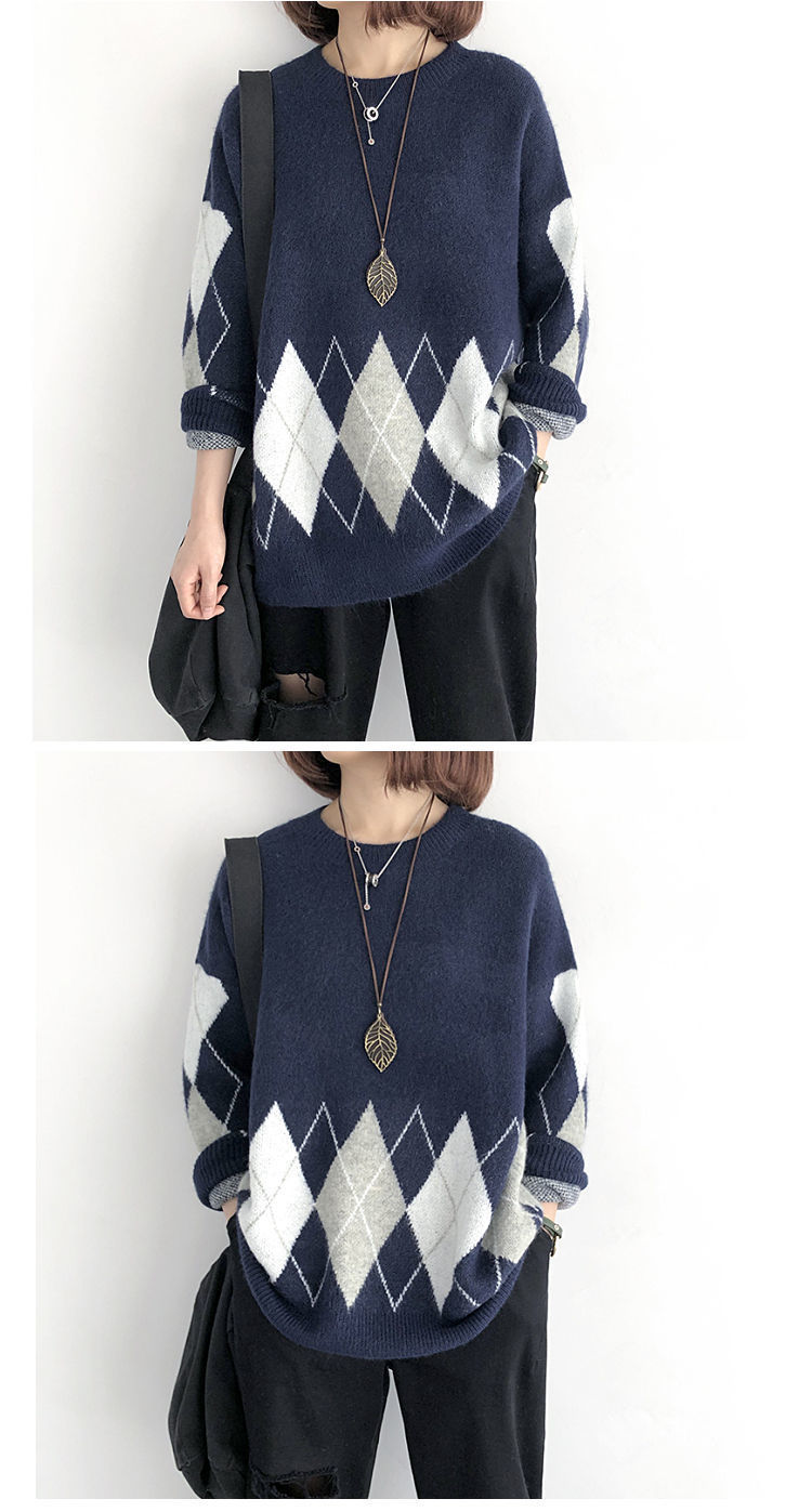 일본식 간단한 가을과 겨울 새로운 두꺼운 따뜻한 베이스 셔츠 다이아몬드 스웨터 여성용 느슨한 풀오버 라운드 넥 스웨터