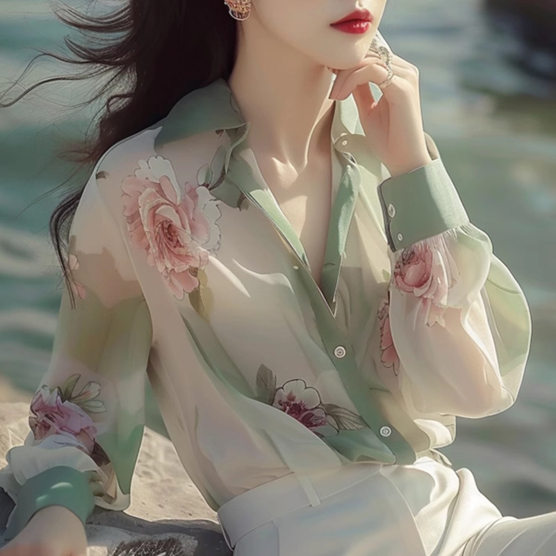 라이트 그린 꽃 선스크린 셔츠 여성의 2024 여름 아름다운 프랑스 스타일 슈퍼 요정 긴팔 작은 셔츠 디자인 탑