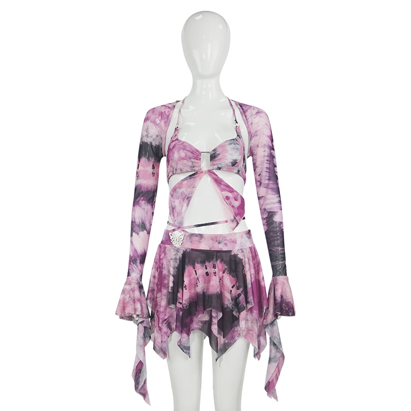 W092ST 유럽과 미국의 뜨거운 소녀 2024 봄 새로운 패션 긴 소매 컬러 인쇄 스트랩 노출 짧은 여성의 세트