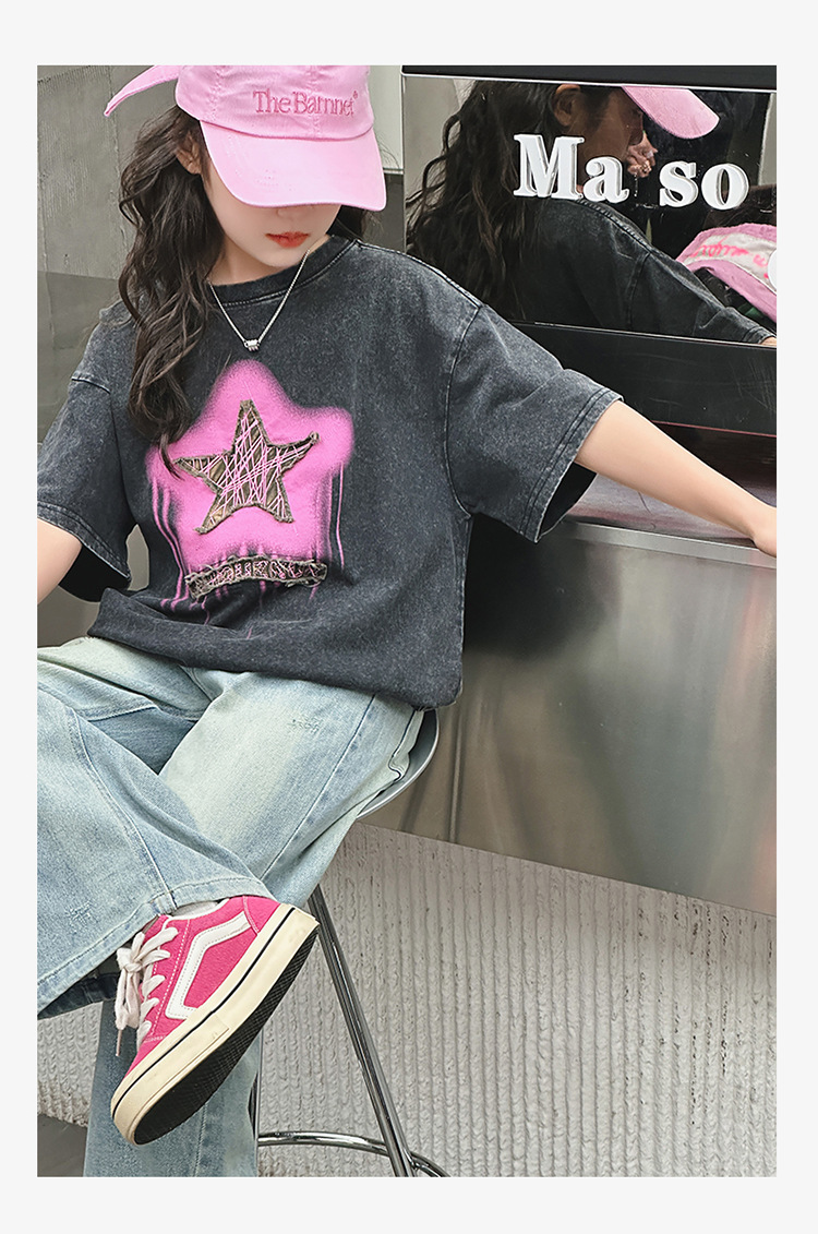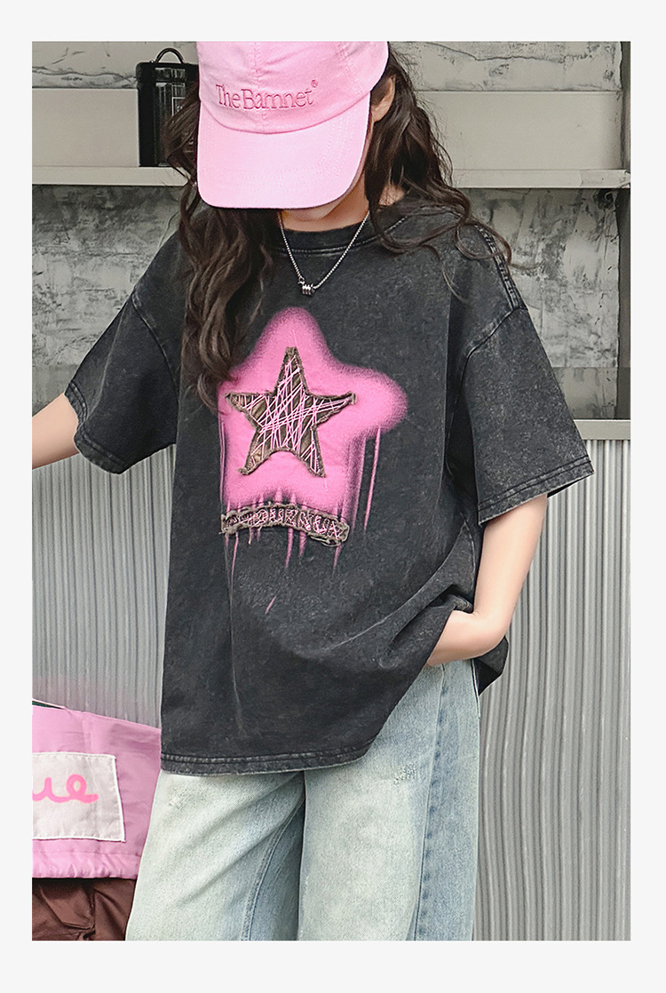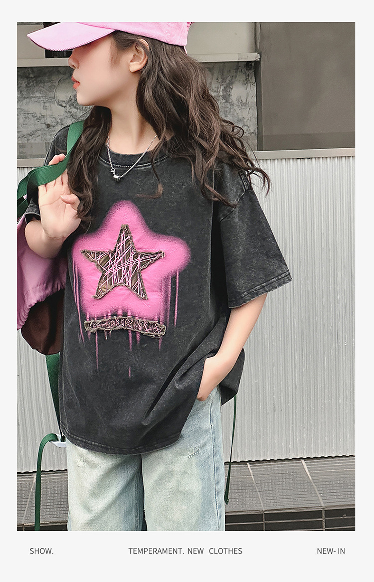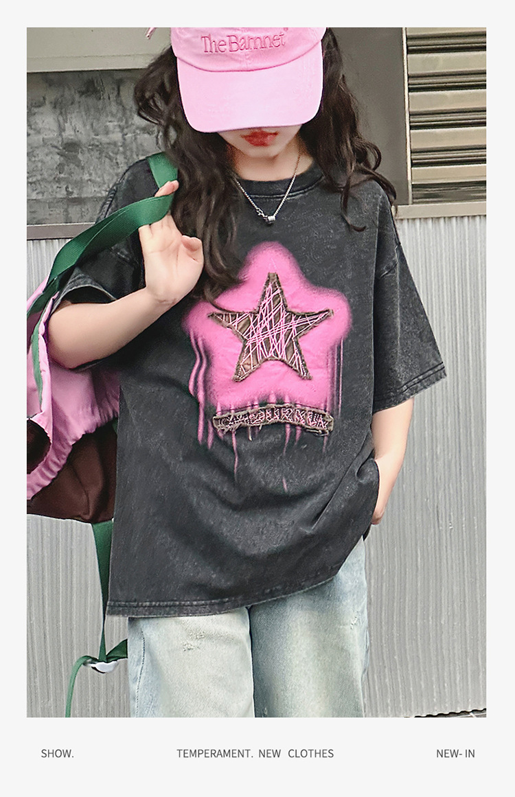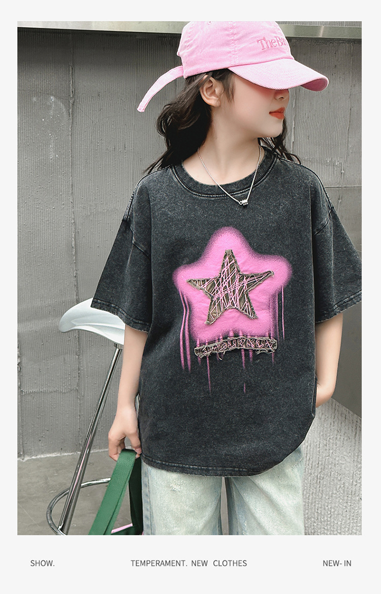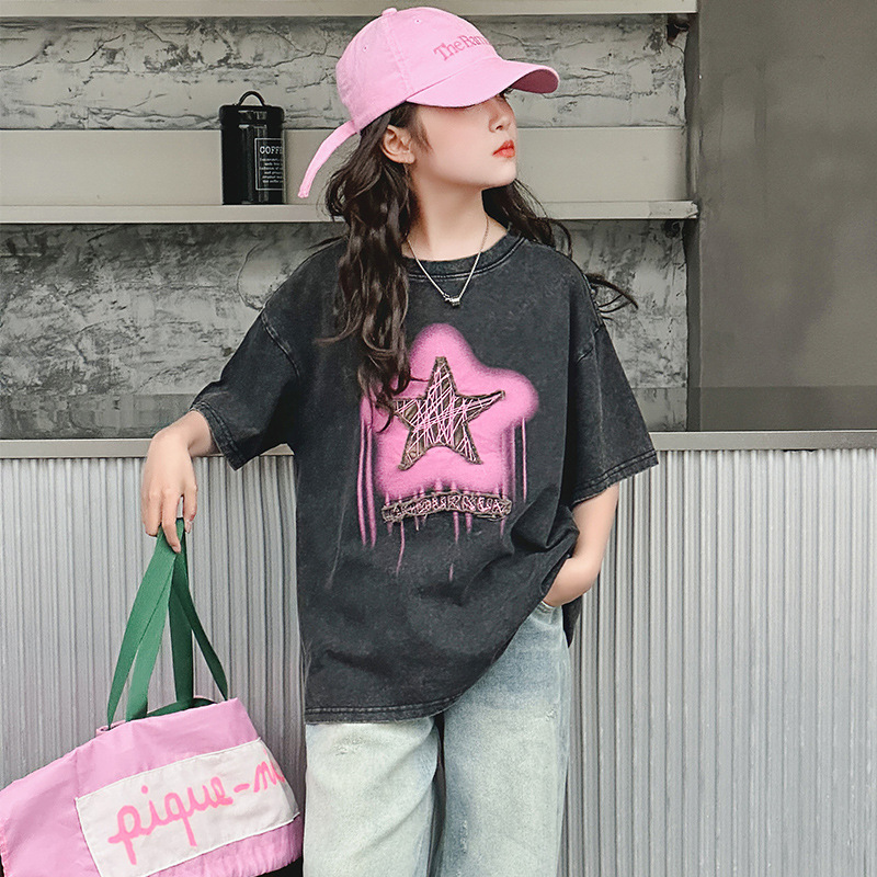 여아 반팔 티셔츠 2025 여름 새로운 스타일 외국 스타일 중년 이상 어린이 구식 스트리트 탑 반팔 바닥 T스토어 가기