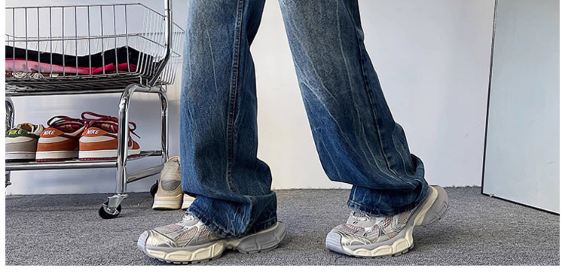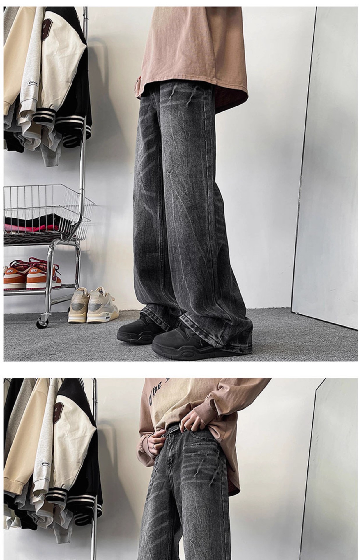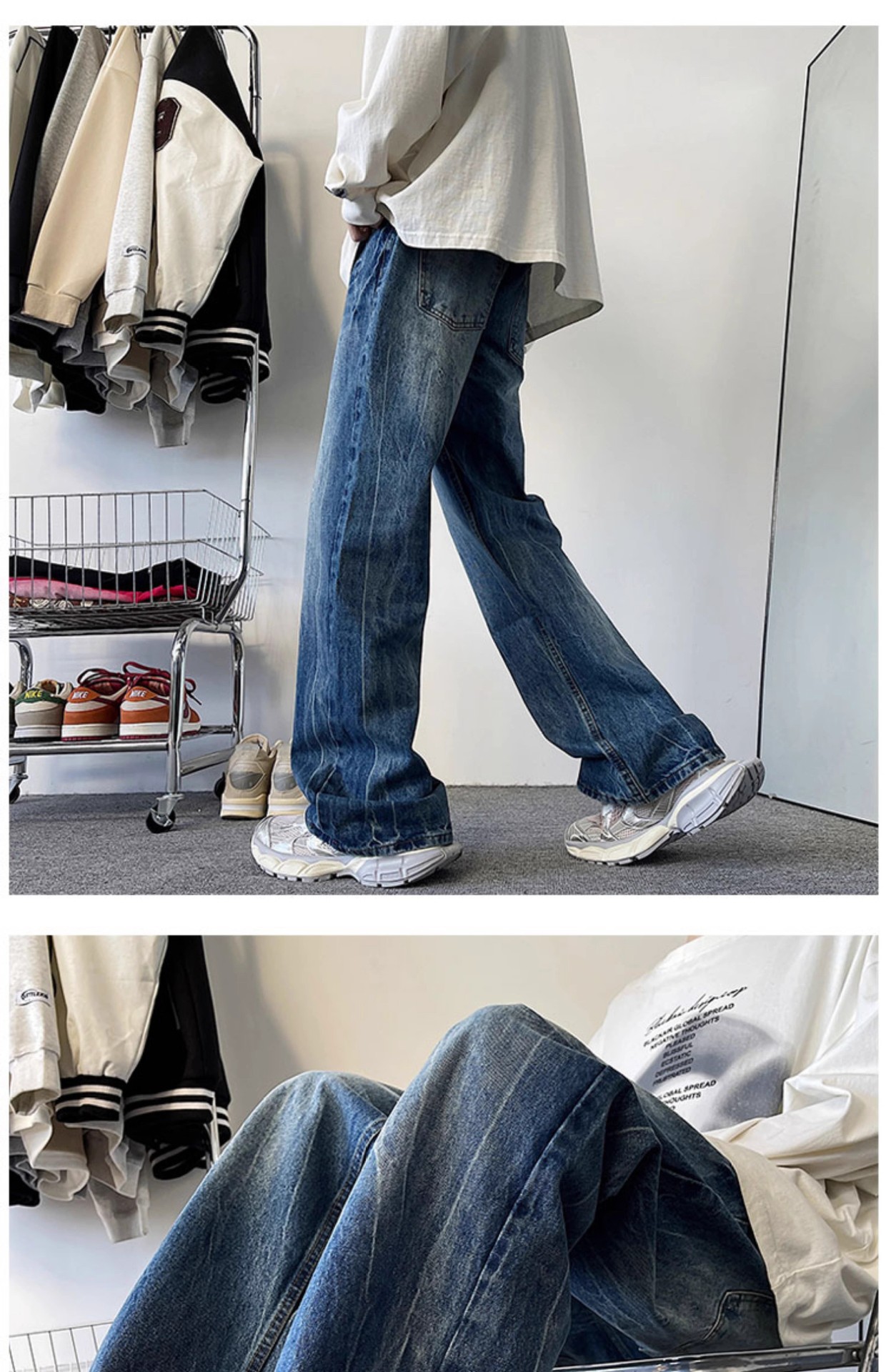 아메리칸 워시 블루 청바지 남성용 트렌디 브랜드 레트로 올드 루즈 와이드 레그 스트레이트 하이 스트리트 바이브 롱 팬츠
