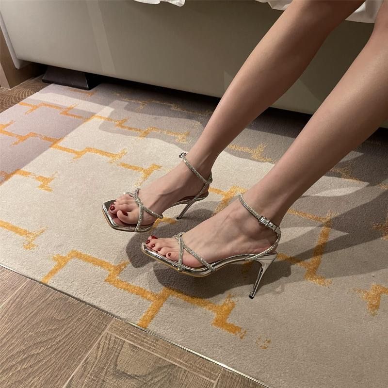 버클 하이힐을 가진 여자 스틸레토 하이힐 2023 여름 새로운 도착 크로스 스트랩 우아한 섹시한 오픈 발가락 라인스톤 샌들