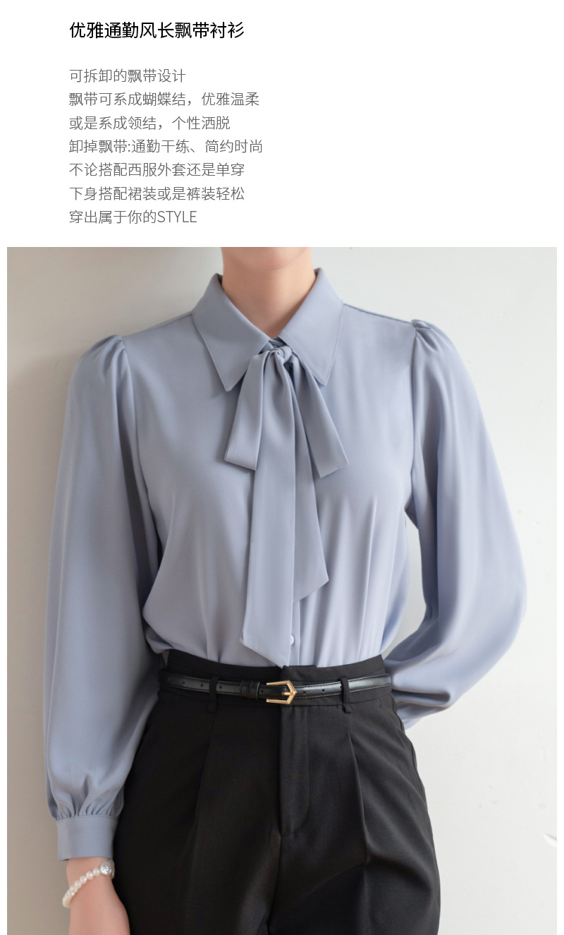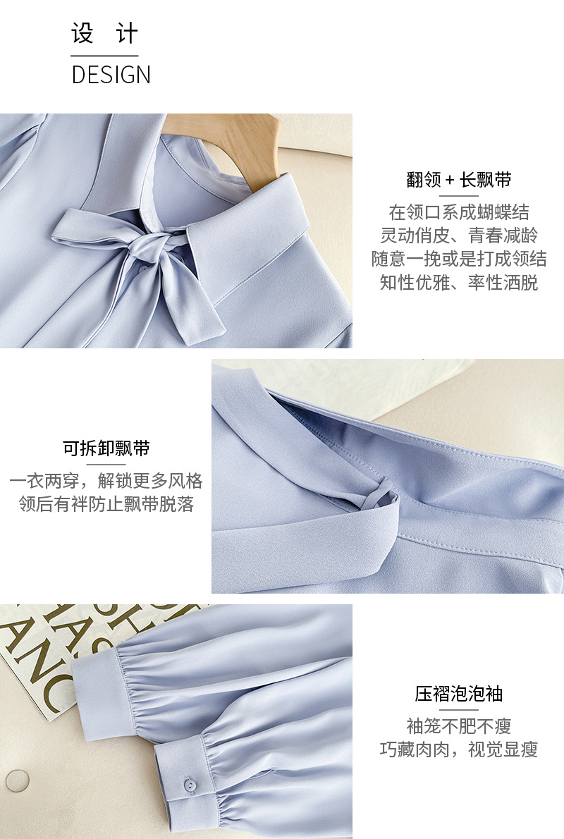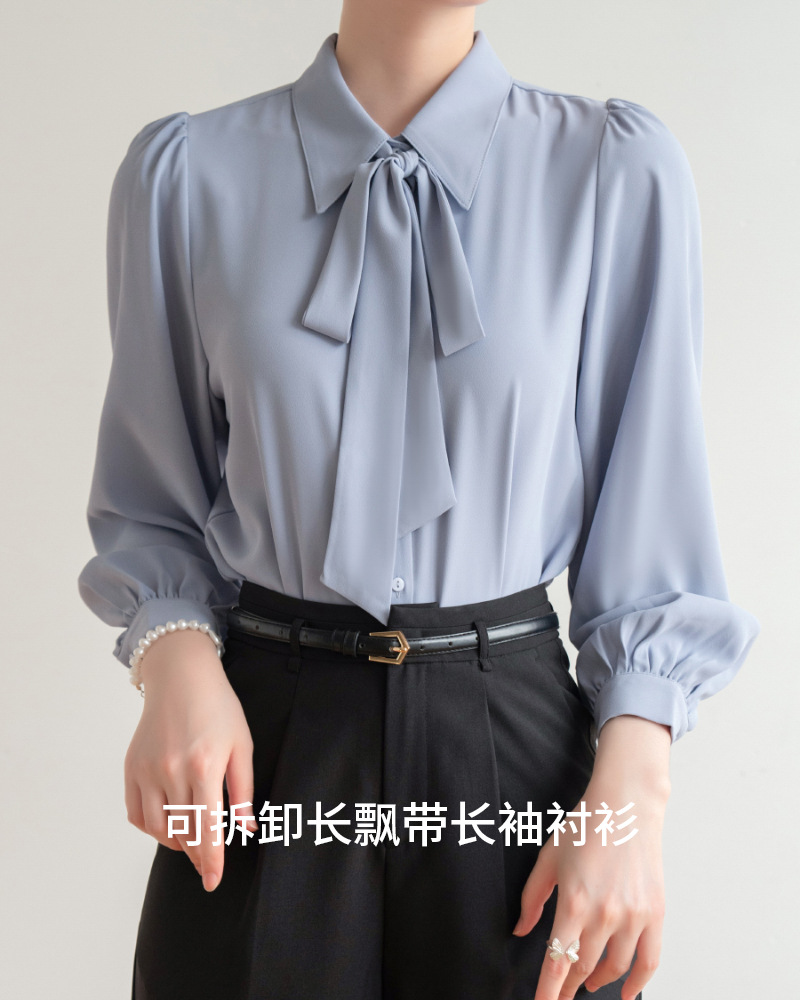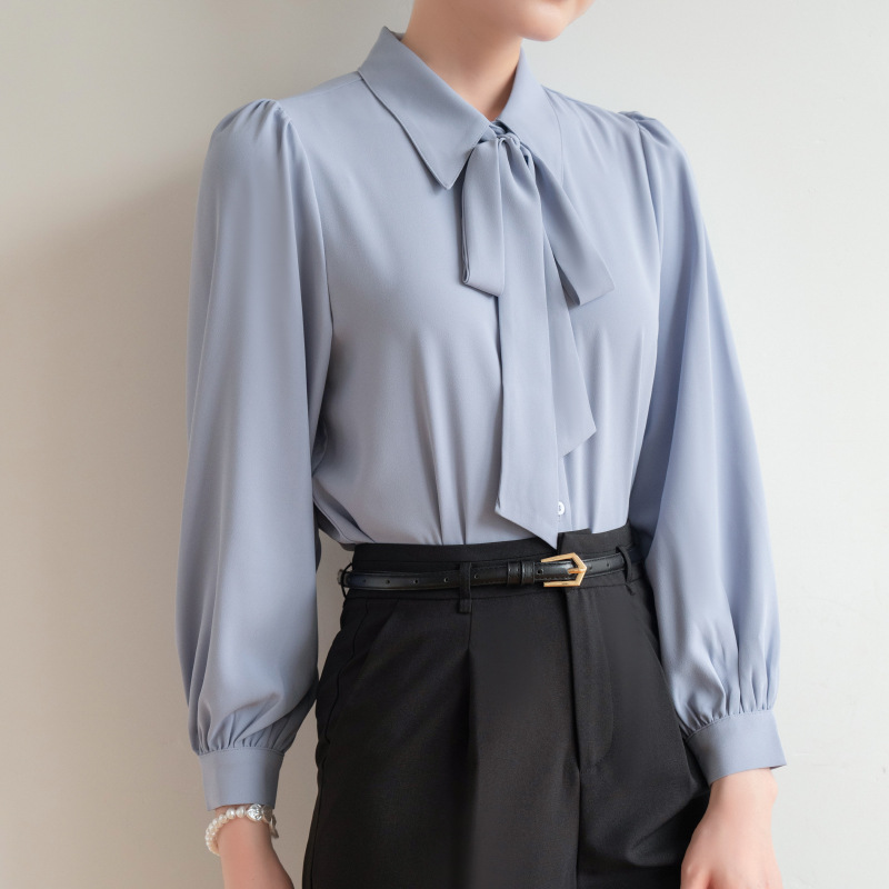 시폰 보우 셔츠 여성 봄, 가을 새로운 스타일 블루 전문 내부 공식 탑 화이트 인터뷰 셔츠