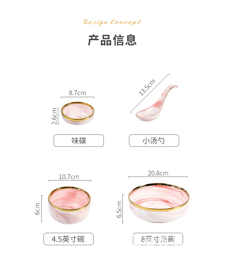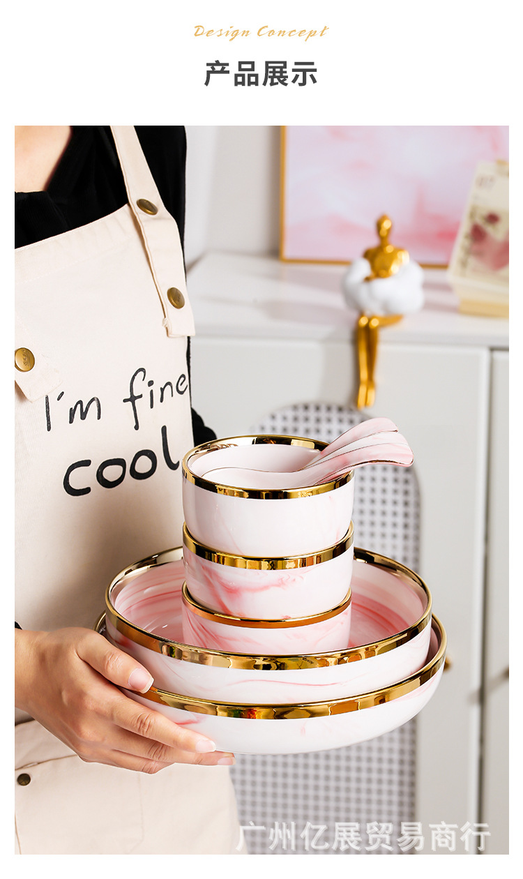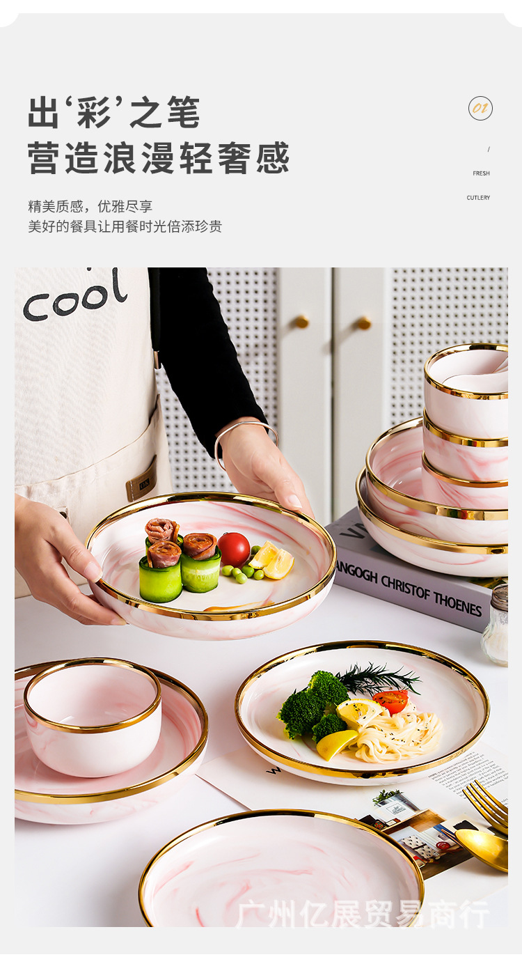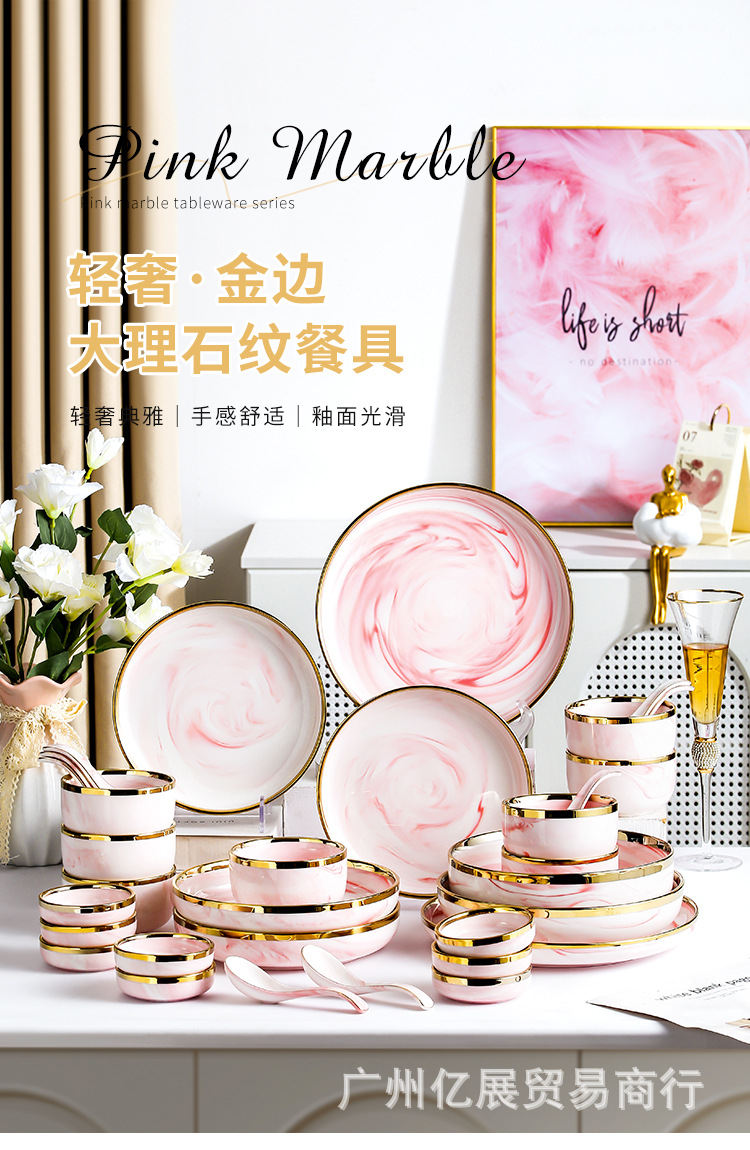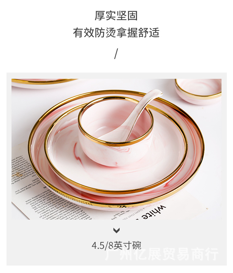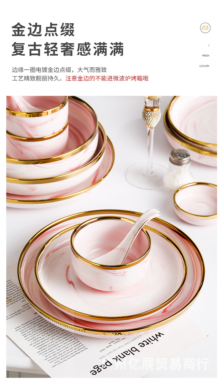 북유럽 스타일 국경 간 대리석 패턴 핑크 식기 가정용 세라믹 접시 스테이크 접시 수프 그릇 서양 음식 접시 선물 상자