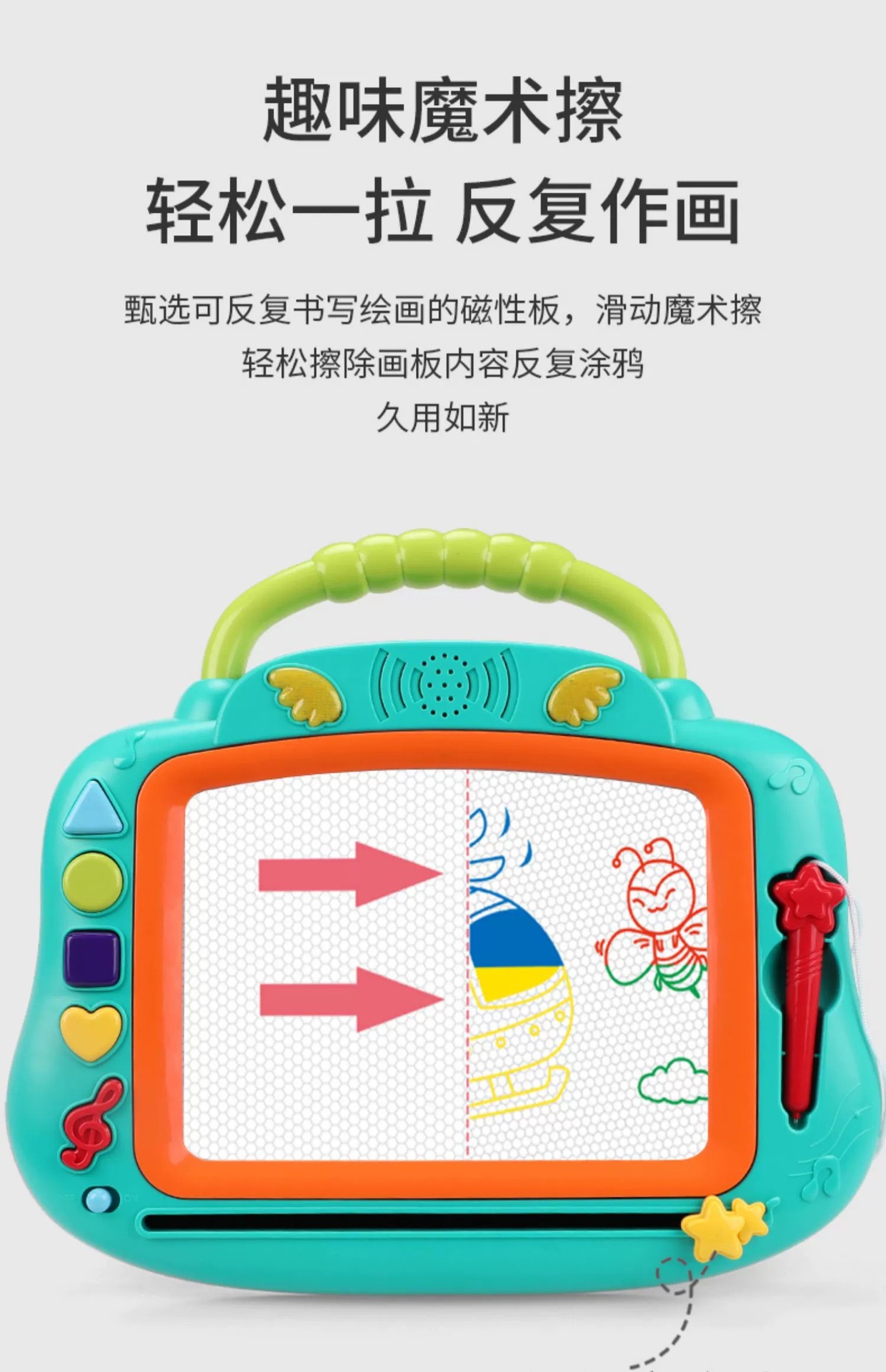 功能:美妙音乐相伴;无尘流畅涂鸦;形状临摹启蒙;附赠12张彩色临摹卡 内容:大自然音效2个,英文字母26个朗读,笑声3个,乐曲节奏4首,MIDI 108首