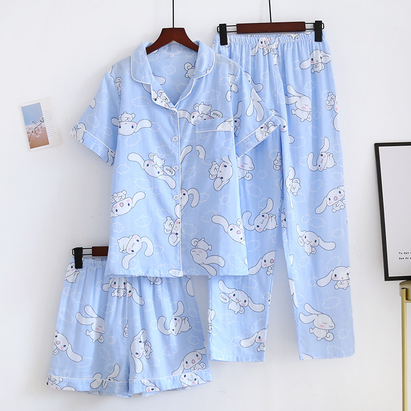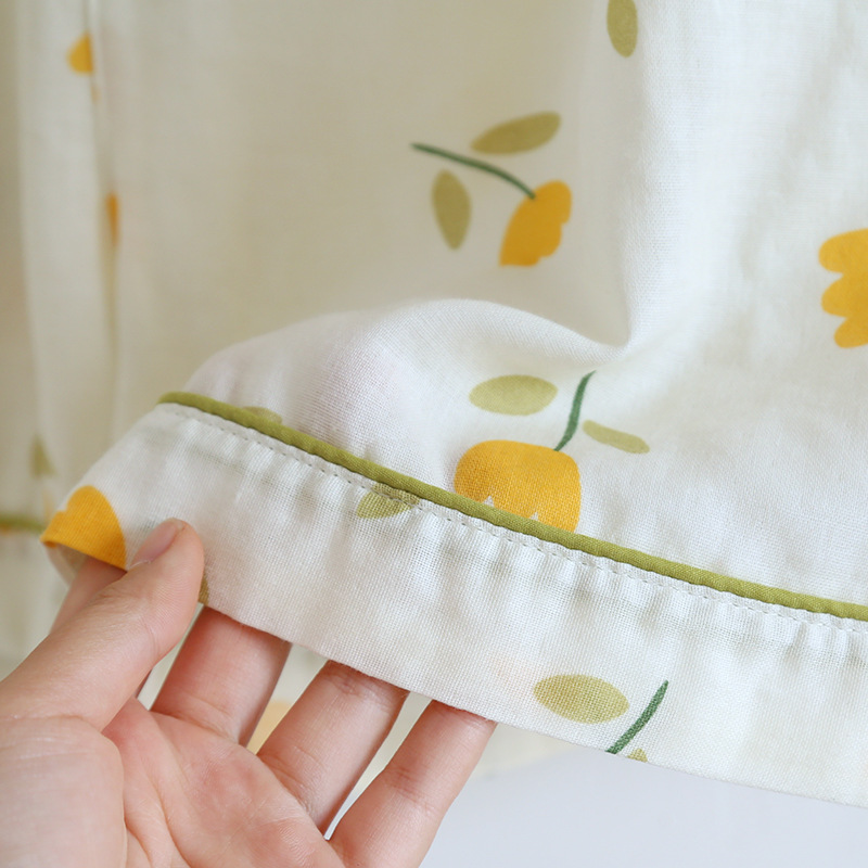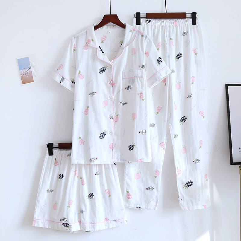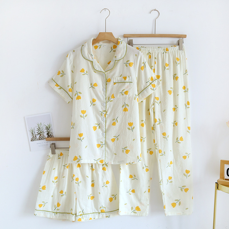 면 잠옷 세트 여성용 거즈 튤립 홈 옷 3 종 반팔 반바지 바지 홈 세트