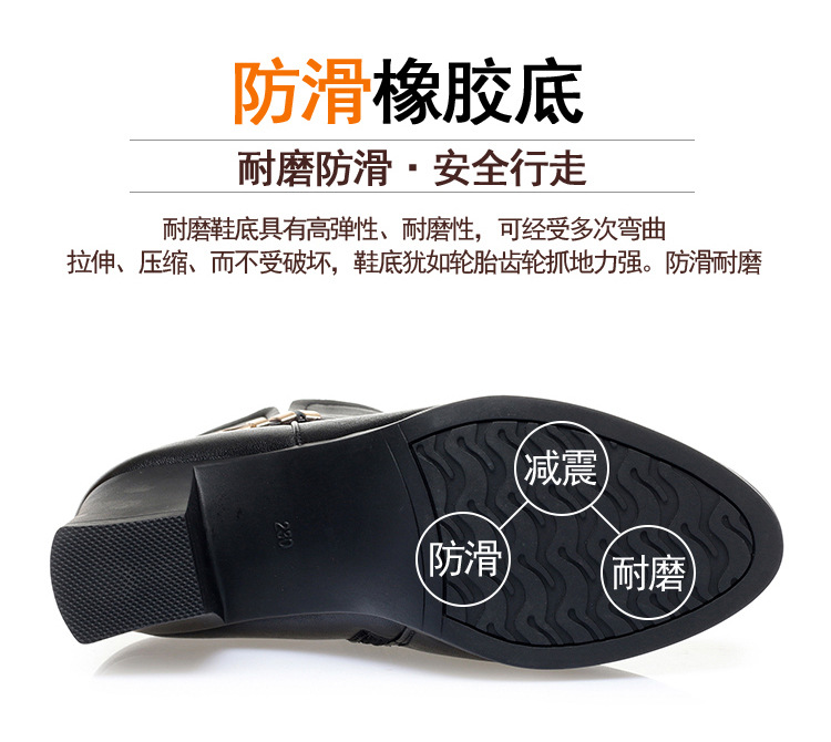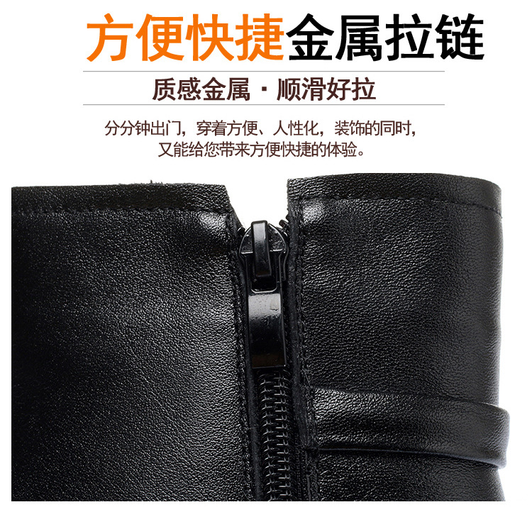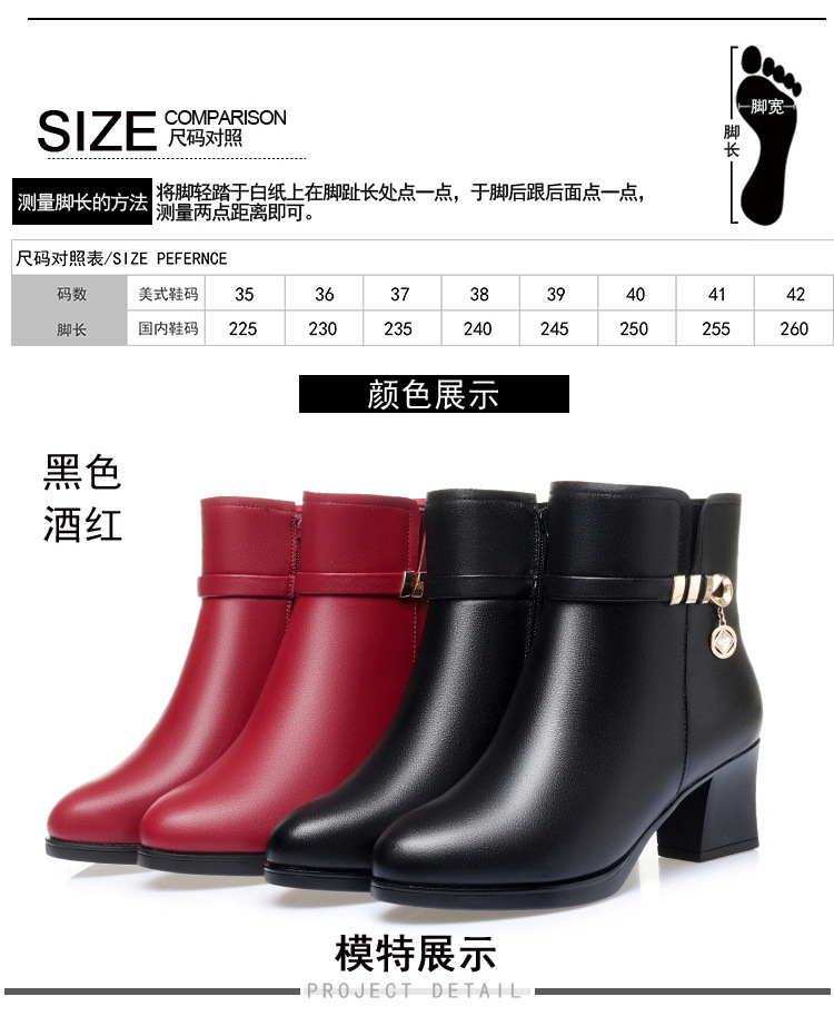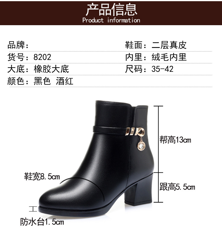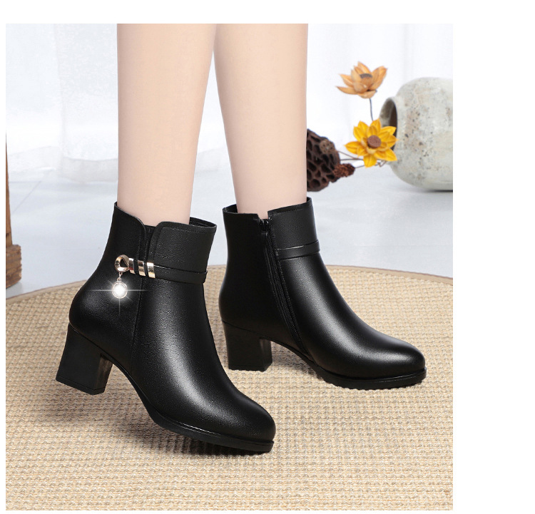 겨울 새로운 라운드 발가락 패션 여성 신발 편안한 올 매치 가죽 부츠 미들 힐 두꺼운 중년 쇼트 사이드 지퍼 여성용 부츠