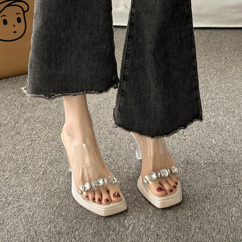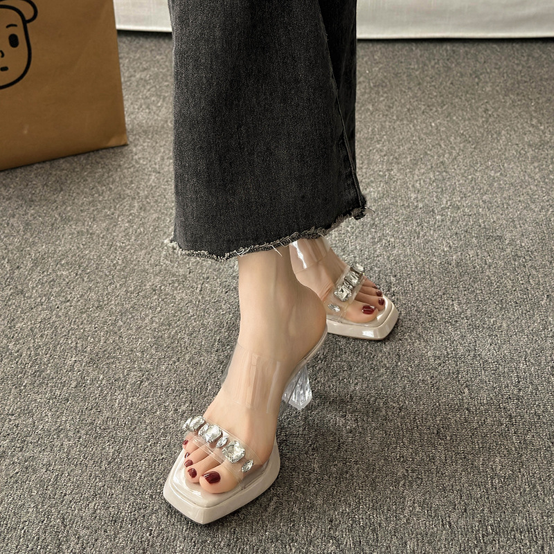 여성 한 단어 투명 하이힐 슬리퍼 외투 여름 2024 새로운 스타일 두꺼운 굽 원피스 프랑스 스타일의 우아한 샌들과 슬리퍼스토어 가기